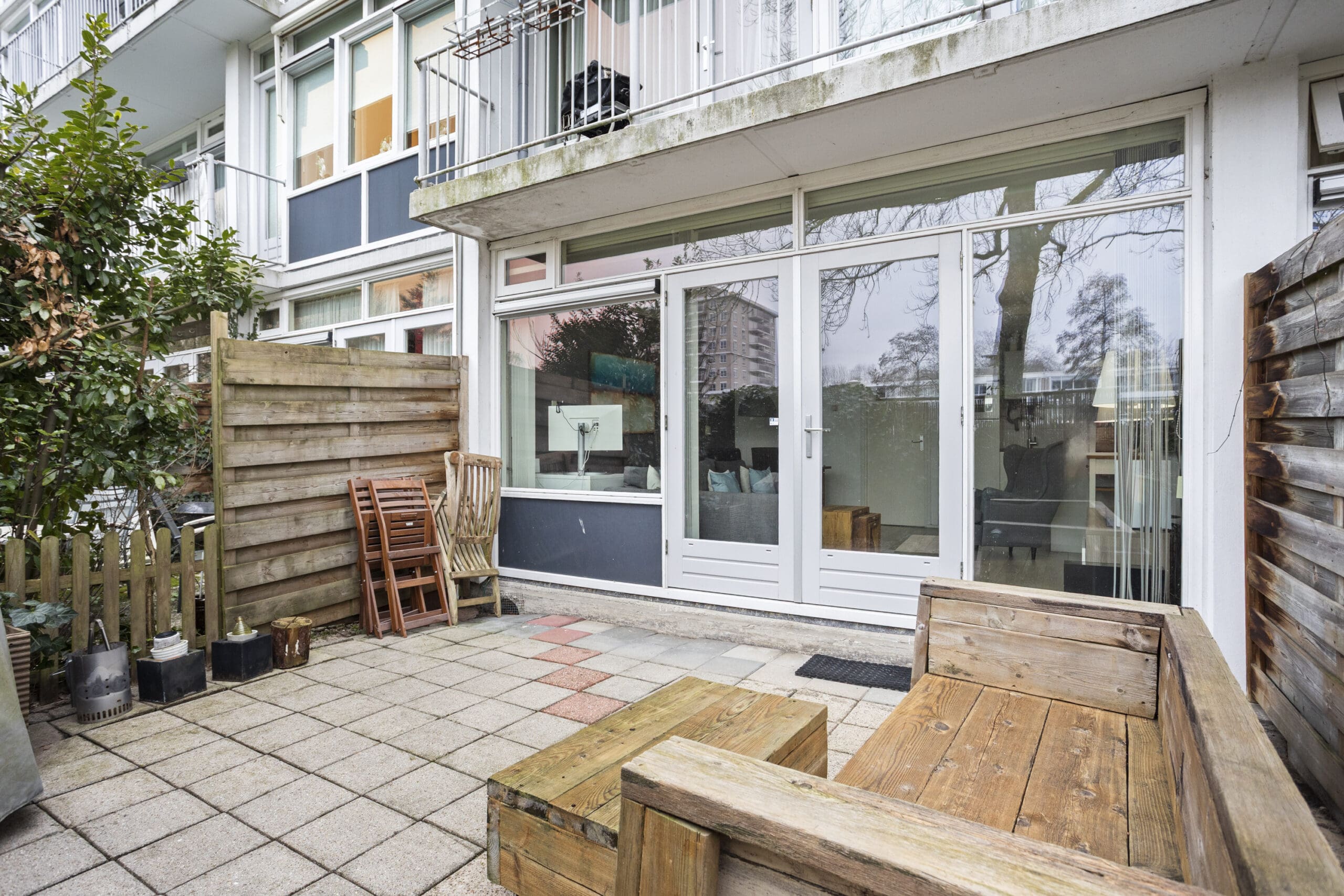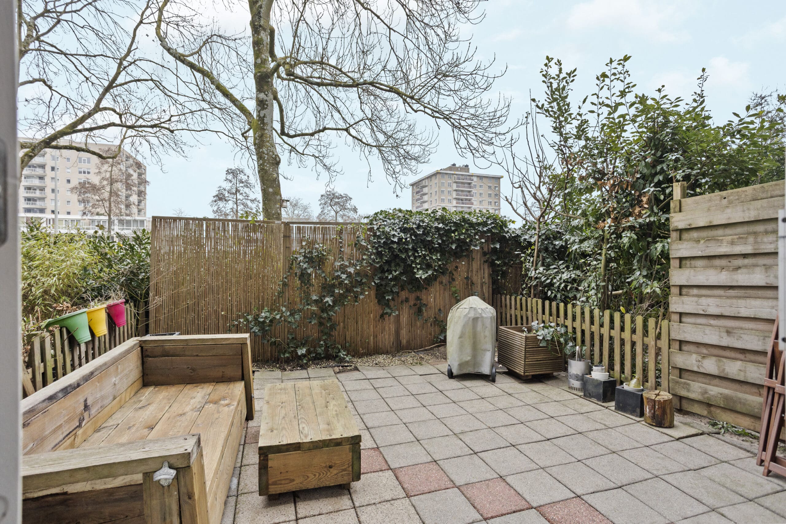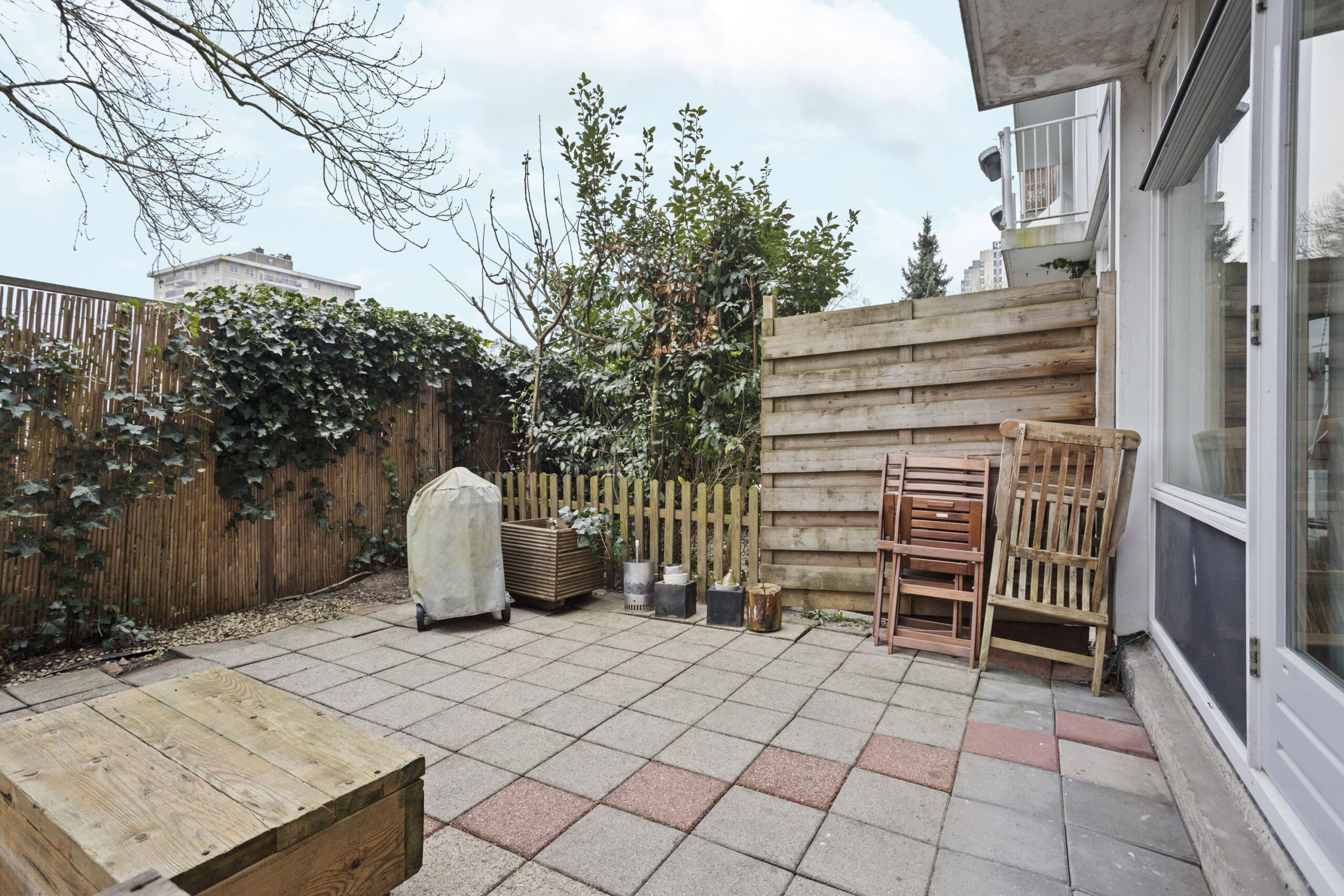 French doors lead to the delightful east-facing garden of approximately 20 m². A perfect spot for a lounge sofa, dining table, and long summer evenings outdoors. Thanks to the grassy area behind the garden, you can enjoy extra peace and privacy.