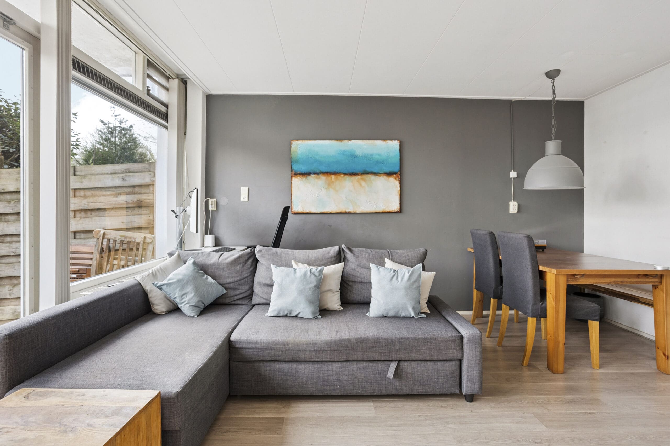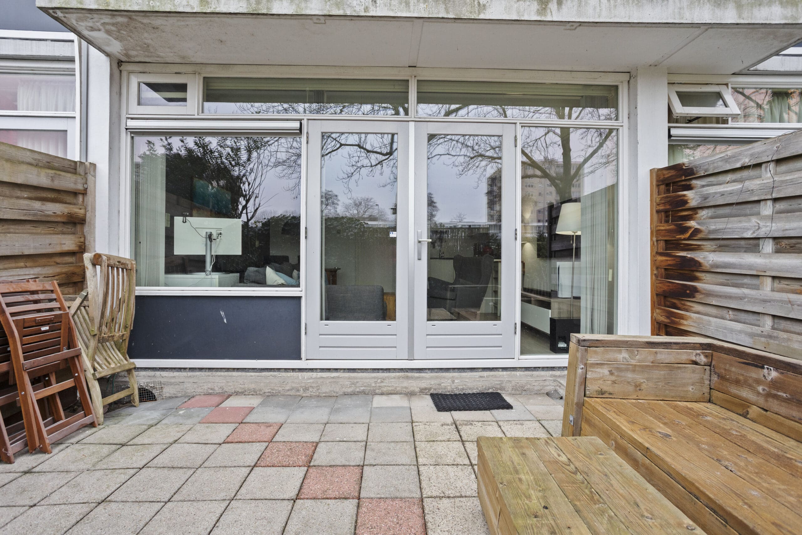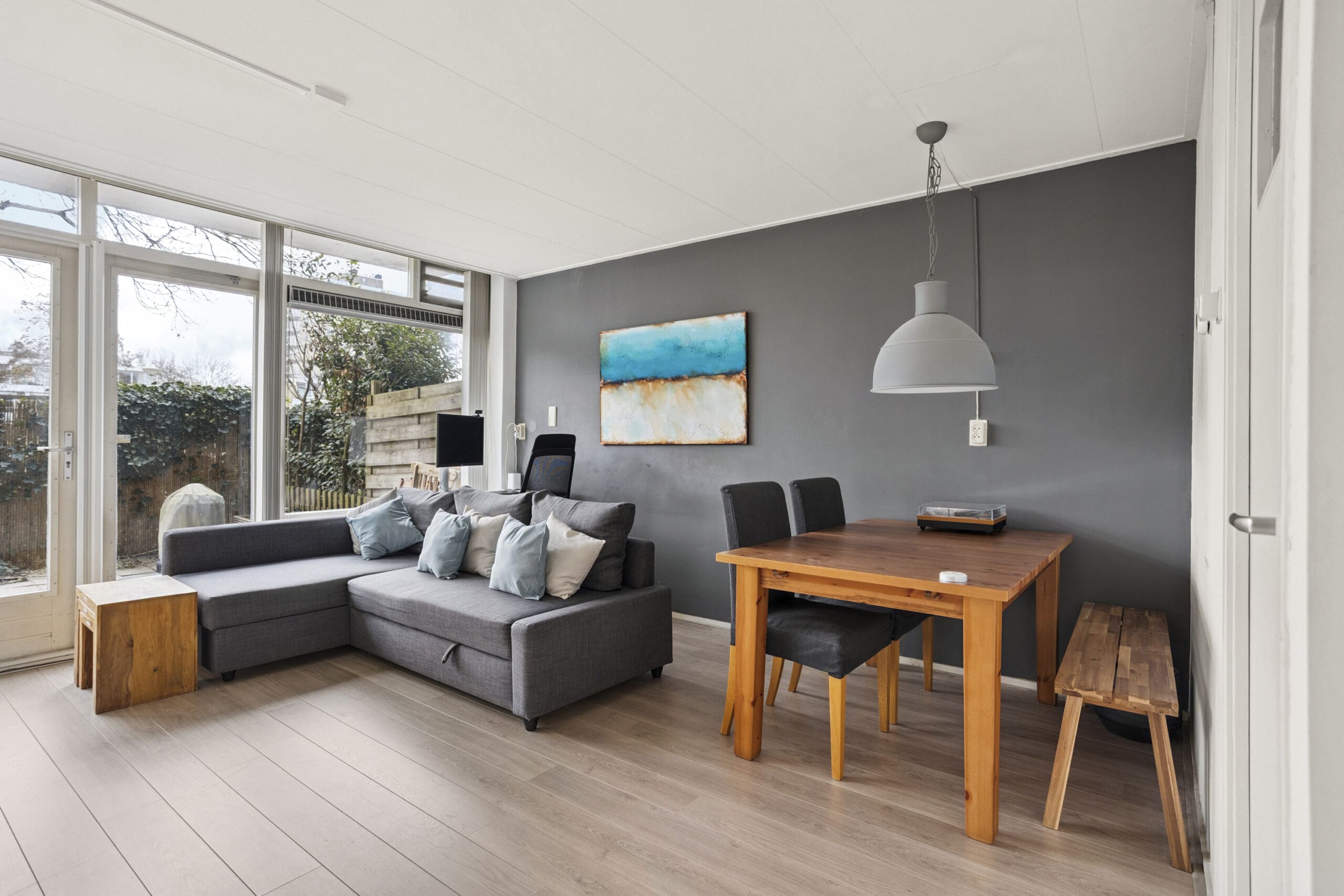 French doors lead to the delightful east-facing garden of approximately 20 m². A perfect spot for a lounge sofa, dining table, and long summer evenings outdoors. Thanks to the grassy area behind the garden, you can enjoy extra peace and privacy.