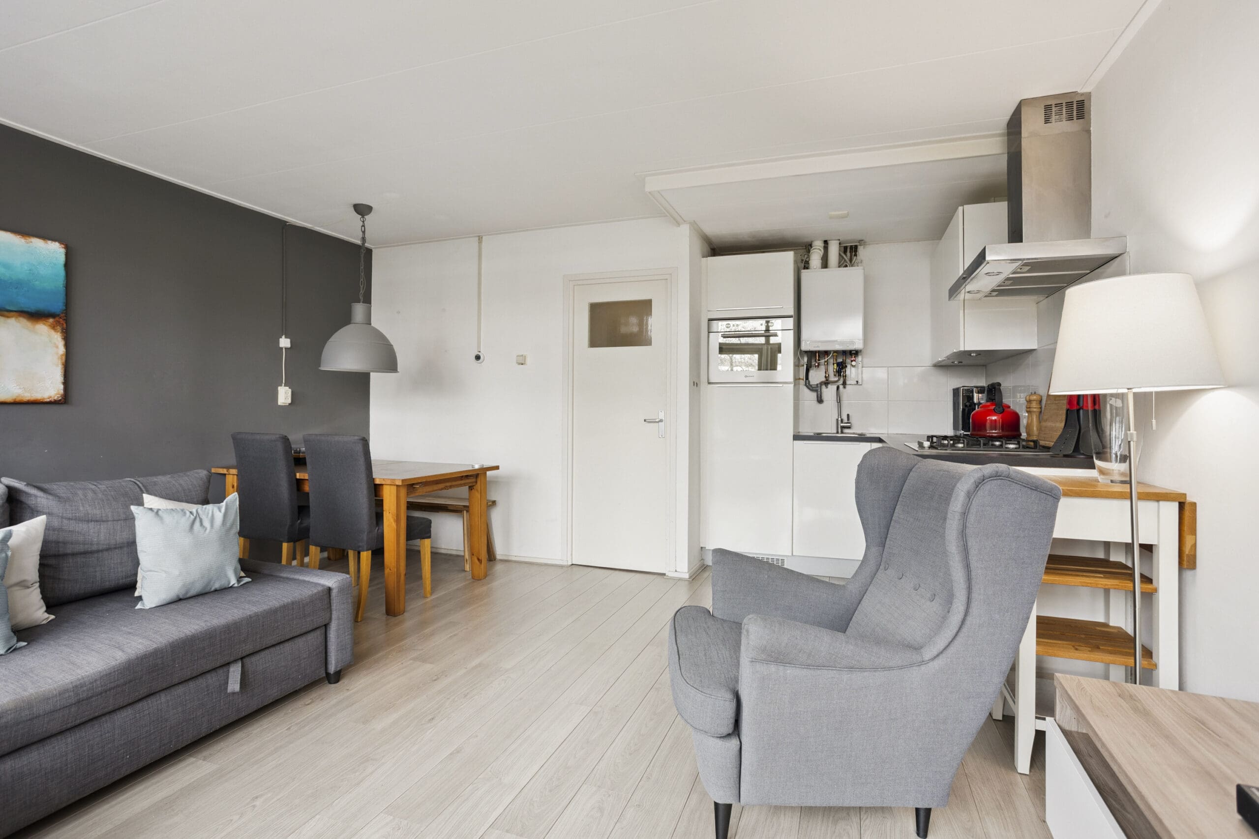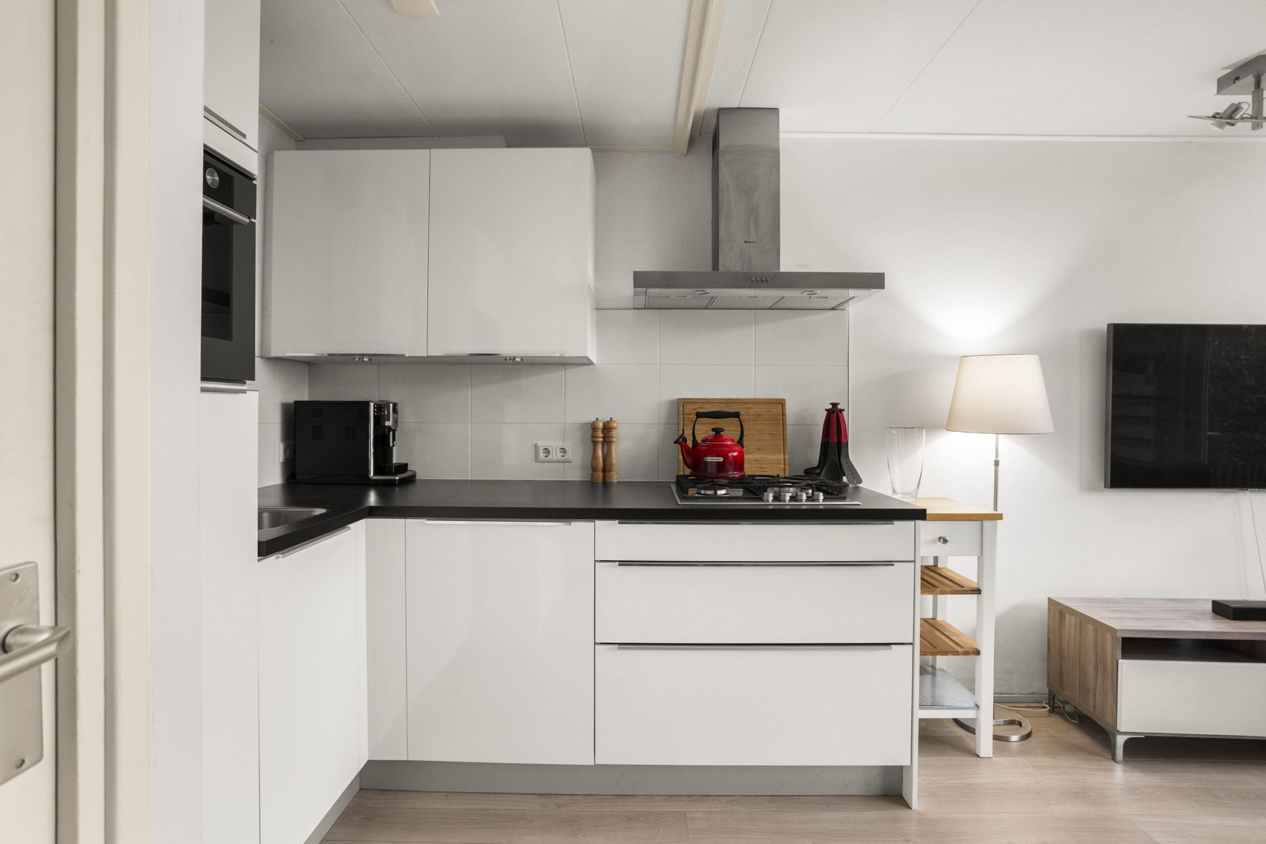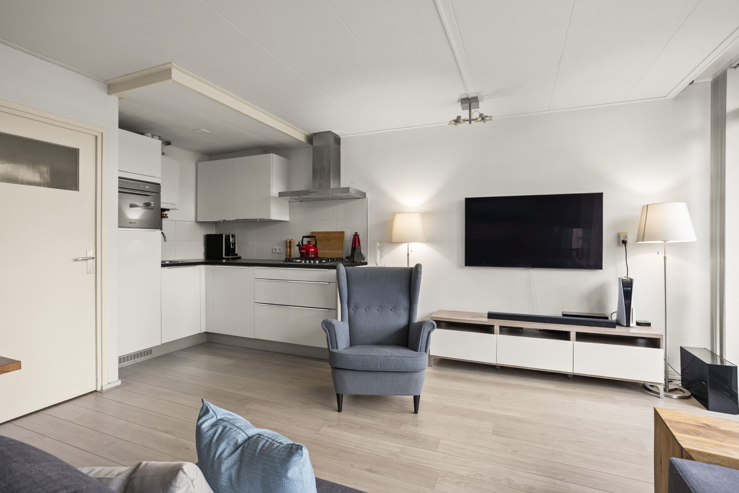 De lichte en ruime woonkamer ligt aan de achterzijde van het appartement en staat in open verbinding met de keuken. De keuken is praktisch ingericht en voorzien van een koelkast met vriesvak, combi-oven en gasfornuis. De wasmachineaansluiting is netjes weggewerkt achter een kastje.