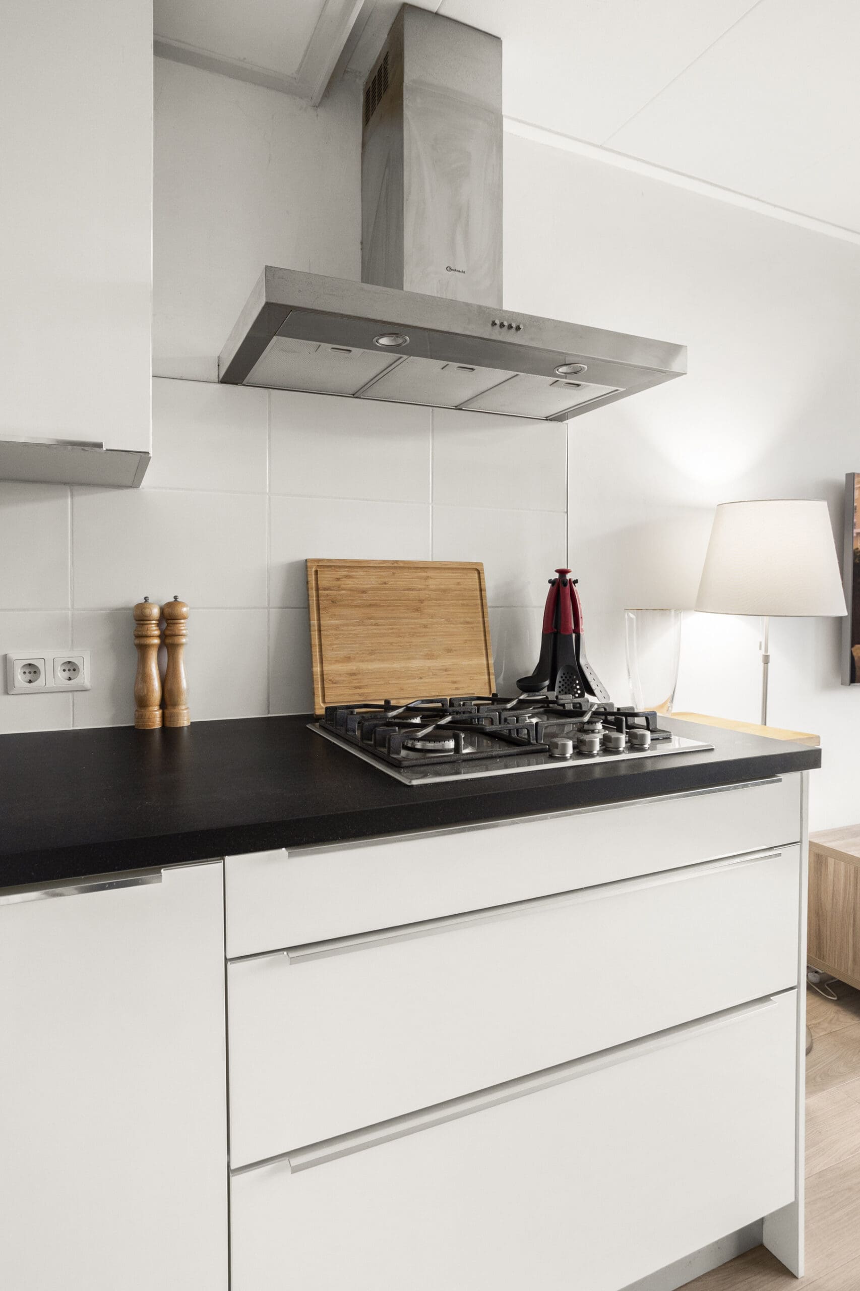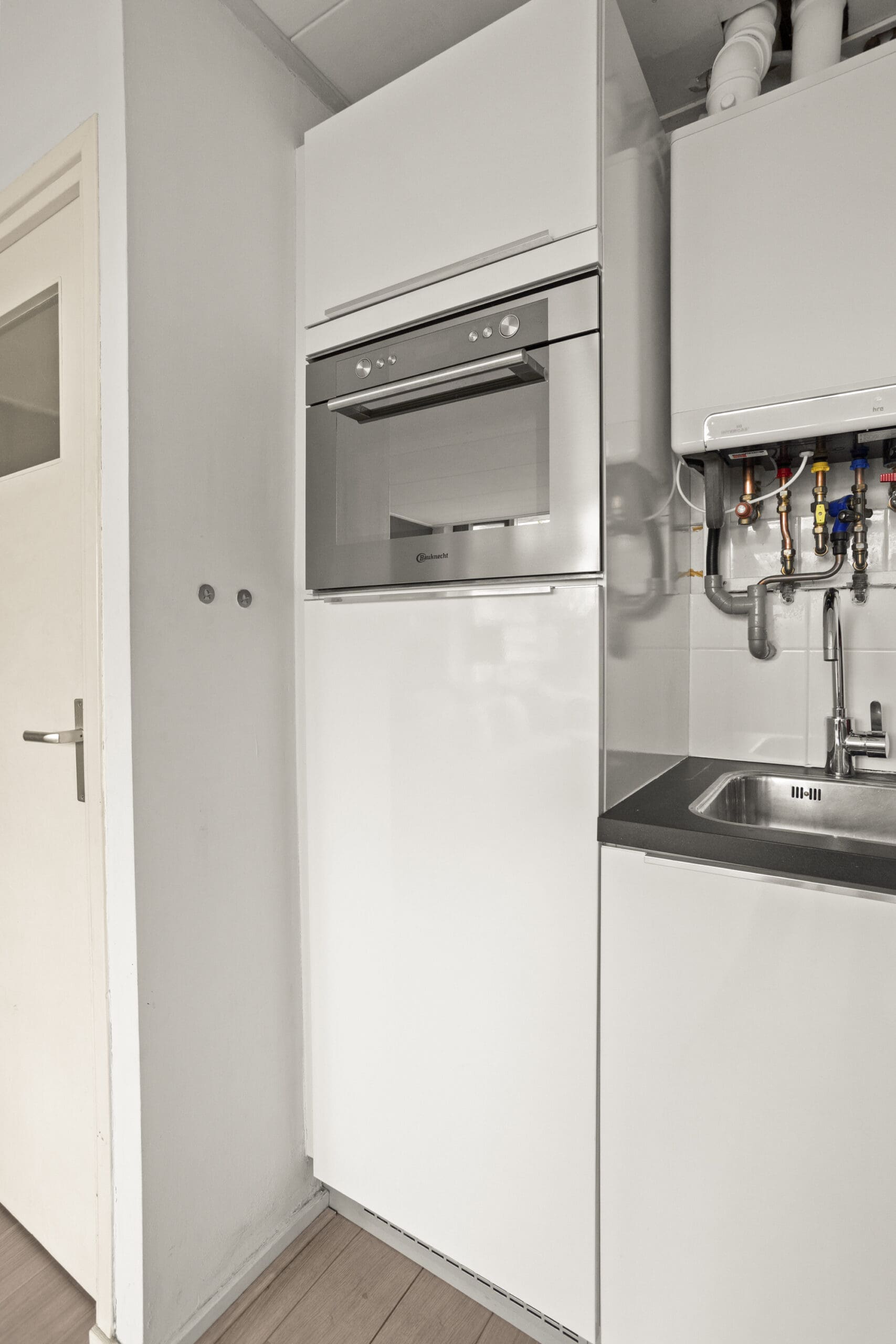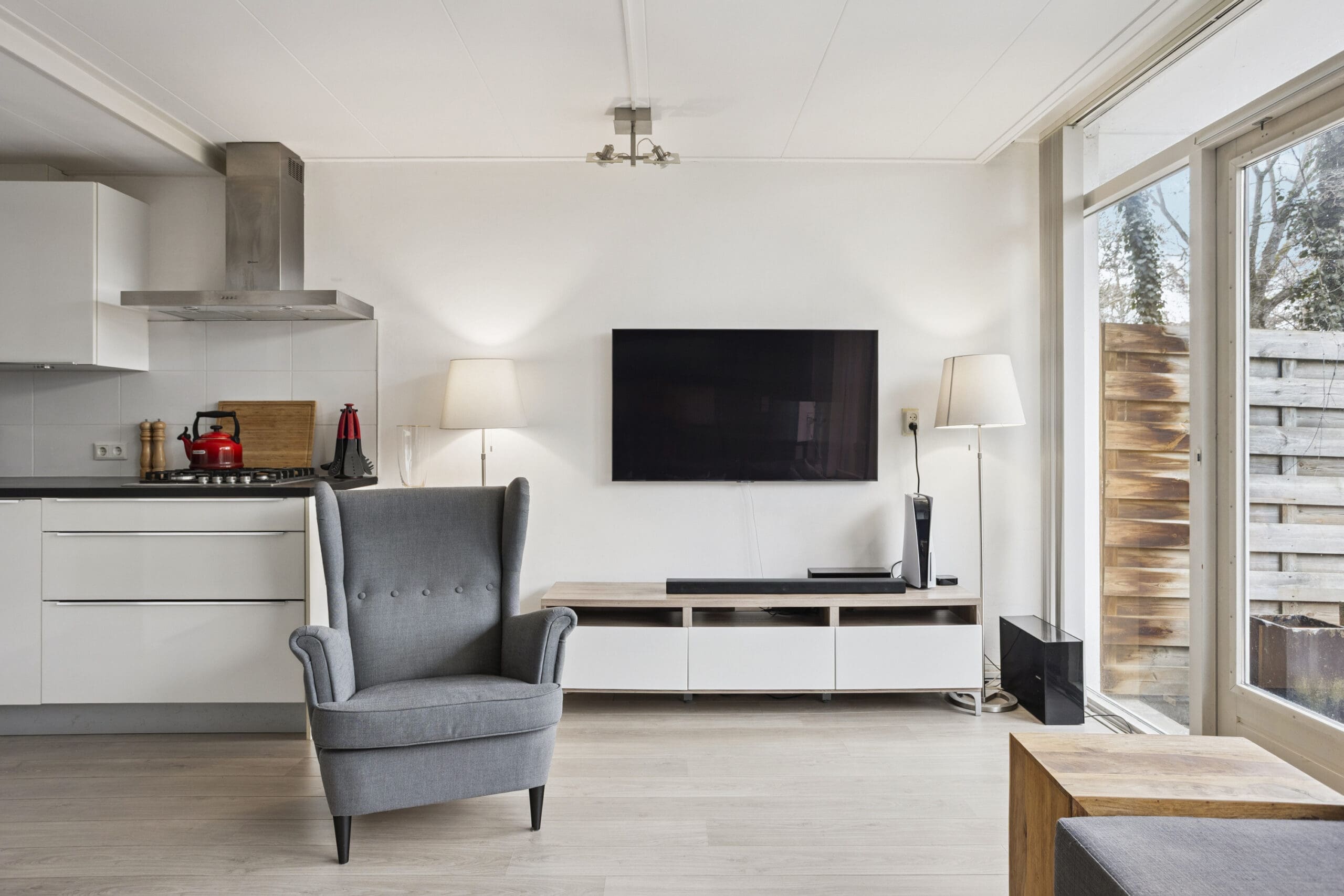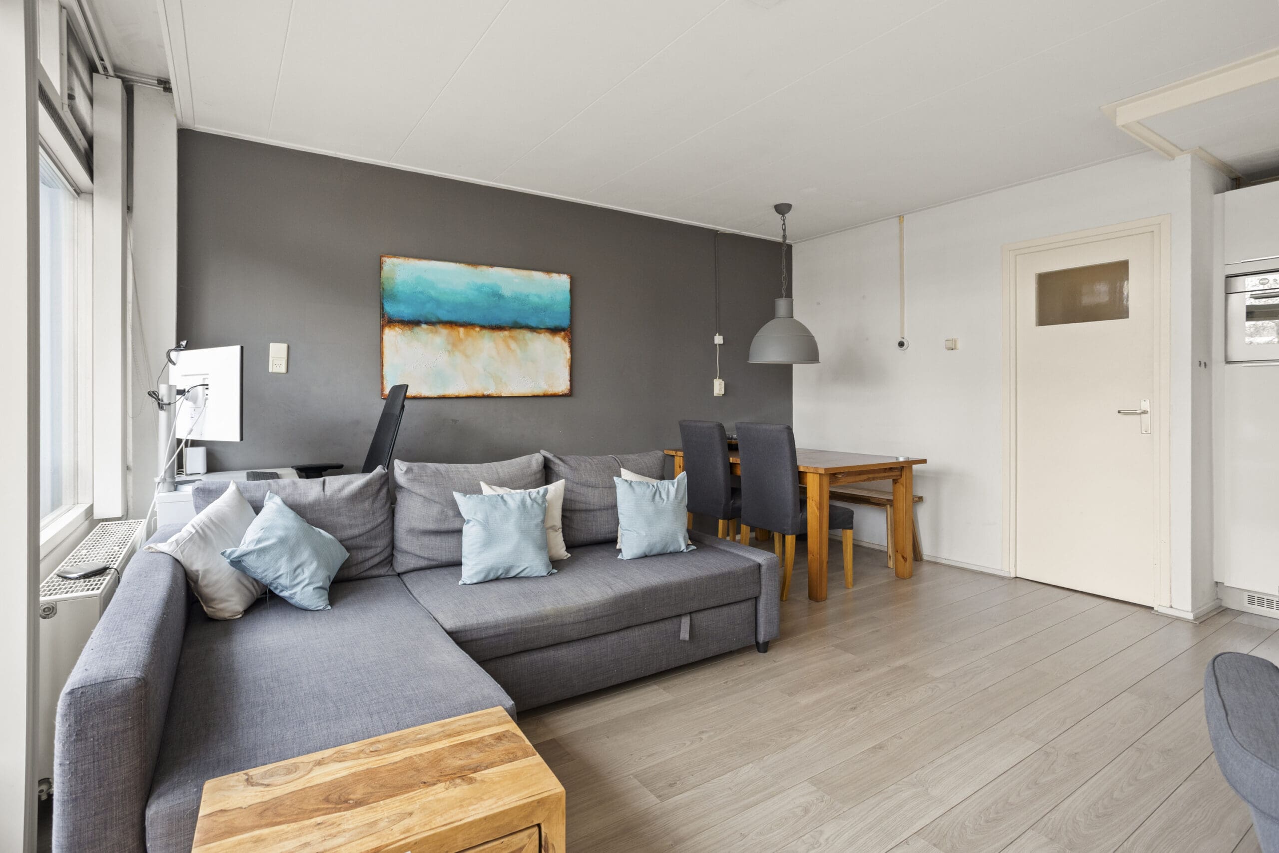 De lichte en ruime woonkamer ligt aan de achterzijde van het appartement en staat in open verbinding met de keuken. De keuken is praktisch ingericht en voorzien van een koelkast met vriesvak, combi-oven en gasfornuis. De wasmachineaansluiting is netjes weggewerkt achter een kastje.