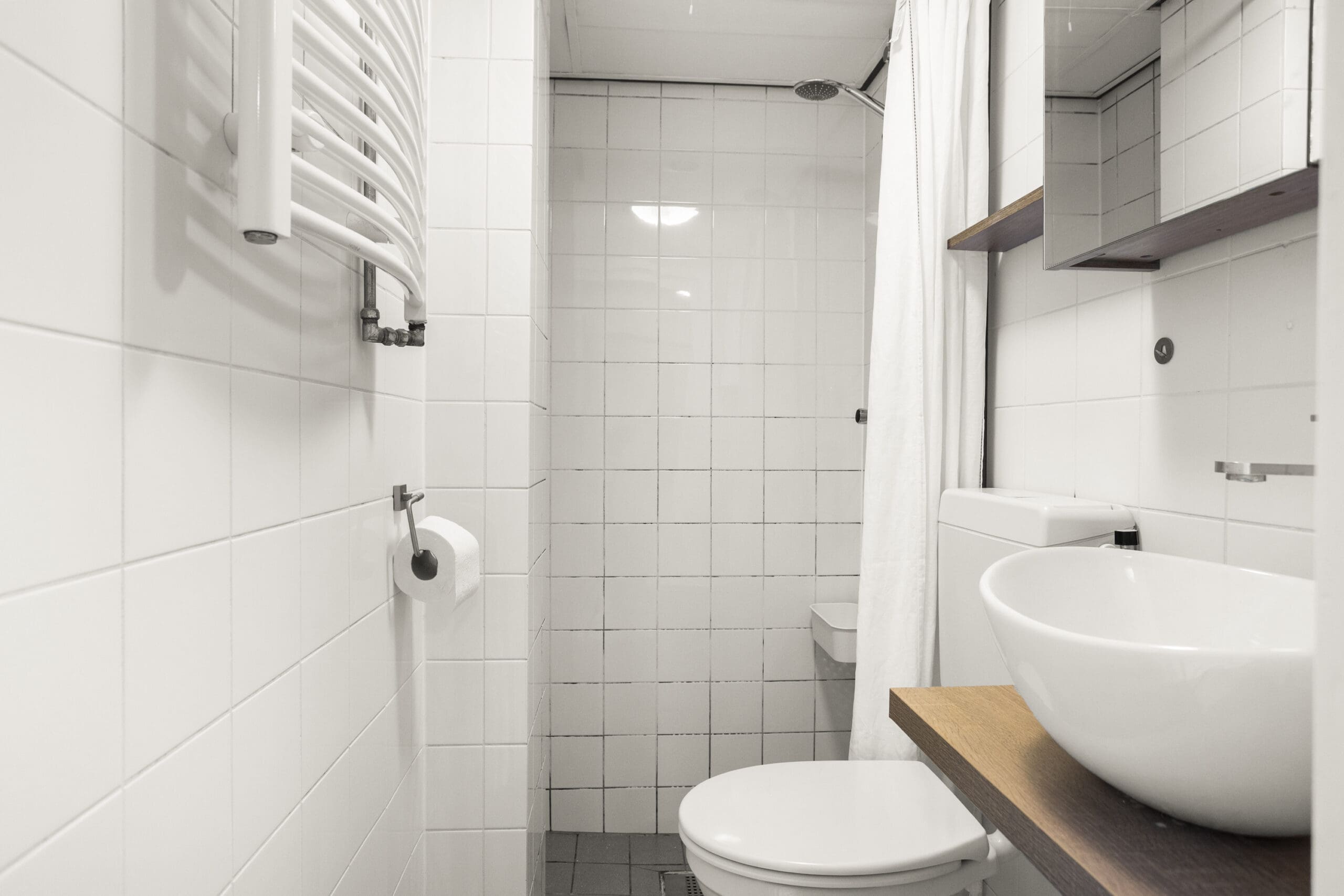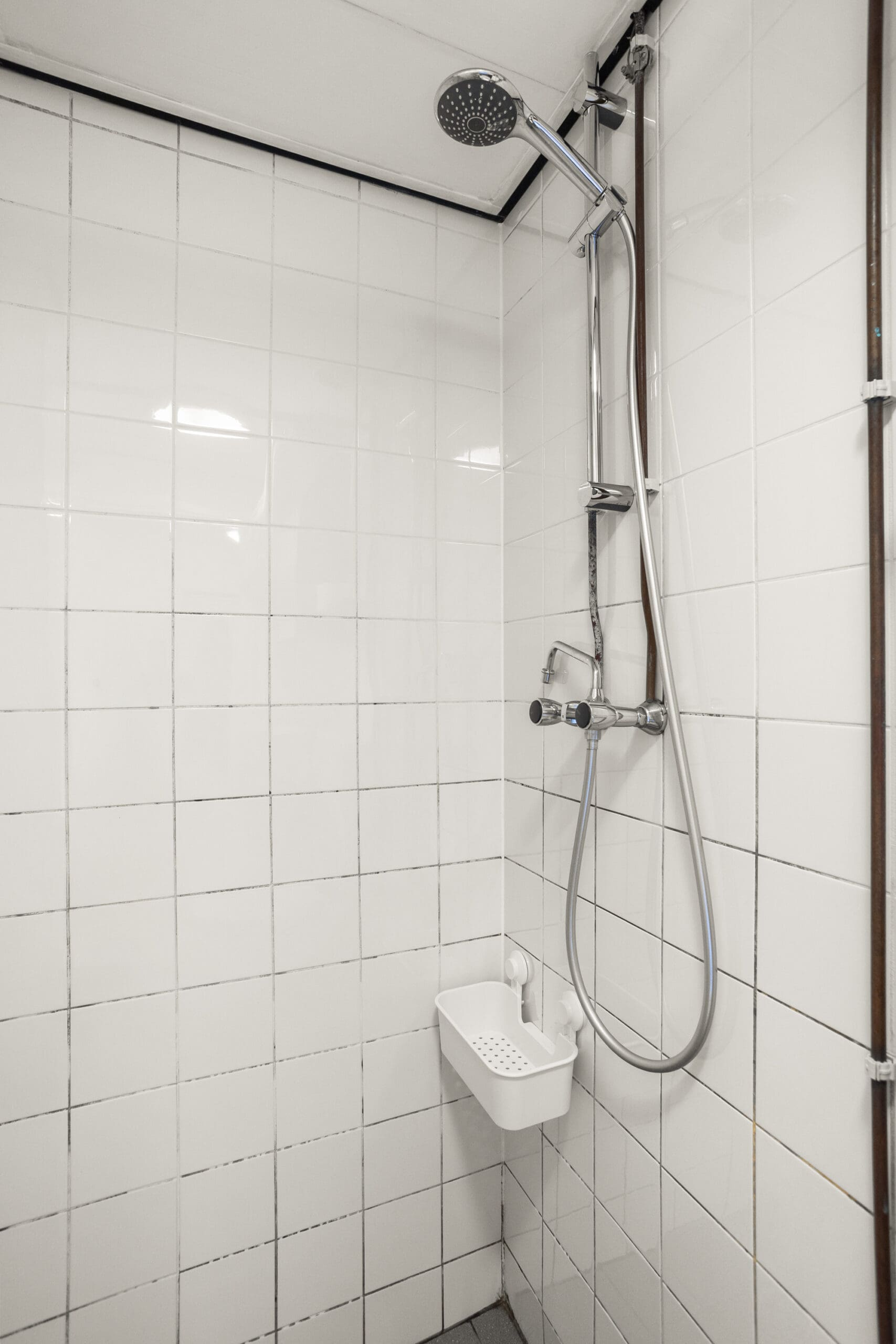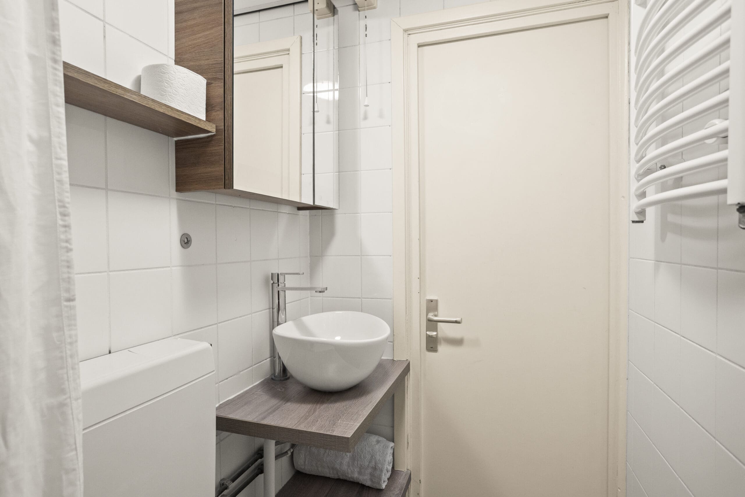 De badkamer is centraal gelegen en voorzien van een douche, wastafel en toilet.