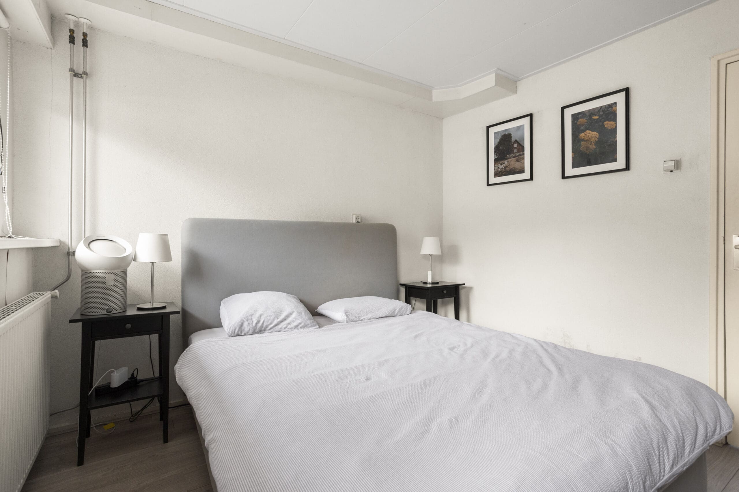 De slaapkamer bevindt zich aan de voorzijde en is ruim genoeg voor een tweepersoonsbed en een grote kledingkast.