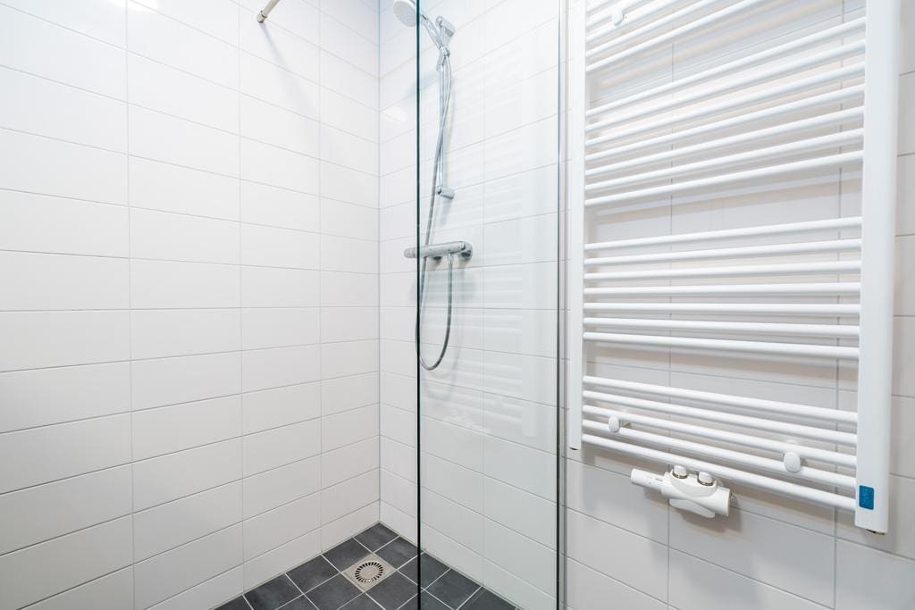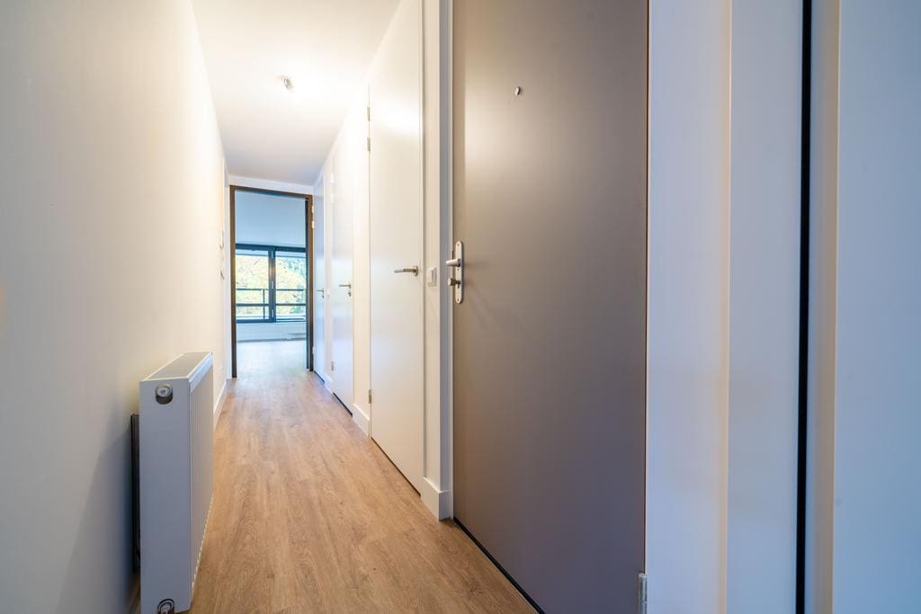 Via the central hall on the first floor, you can access the apartment. Upon entering, you will find two spacious bedrooms on the left side. Further along the hallway are the sleekly finished bathroom with a walk-in shower, double sink, and large mirror, a separate toilet, and a laundry room. The bright living room with an open kitchen forms the heart of the apartment. The modern white high-gloss kitchen is equipped with a composite countertop and various (Siemens) built-in appliances. The living room provides access to the spacious balcony.