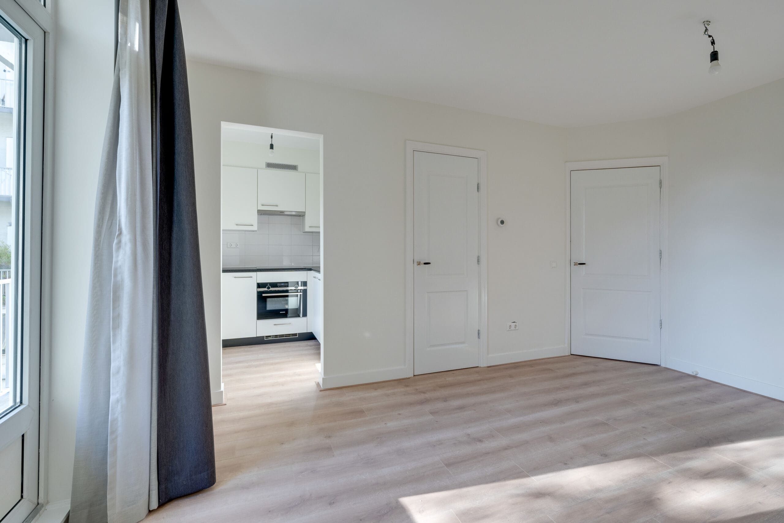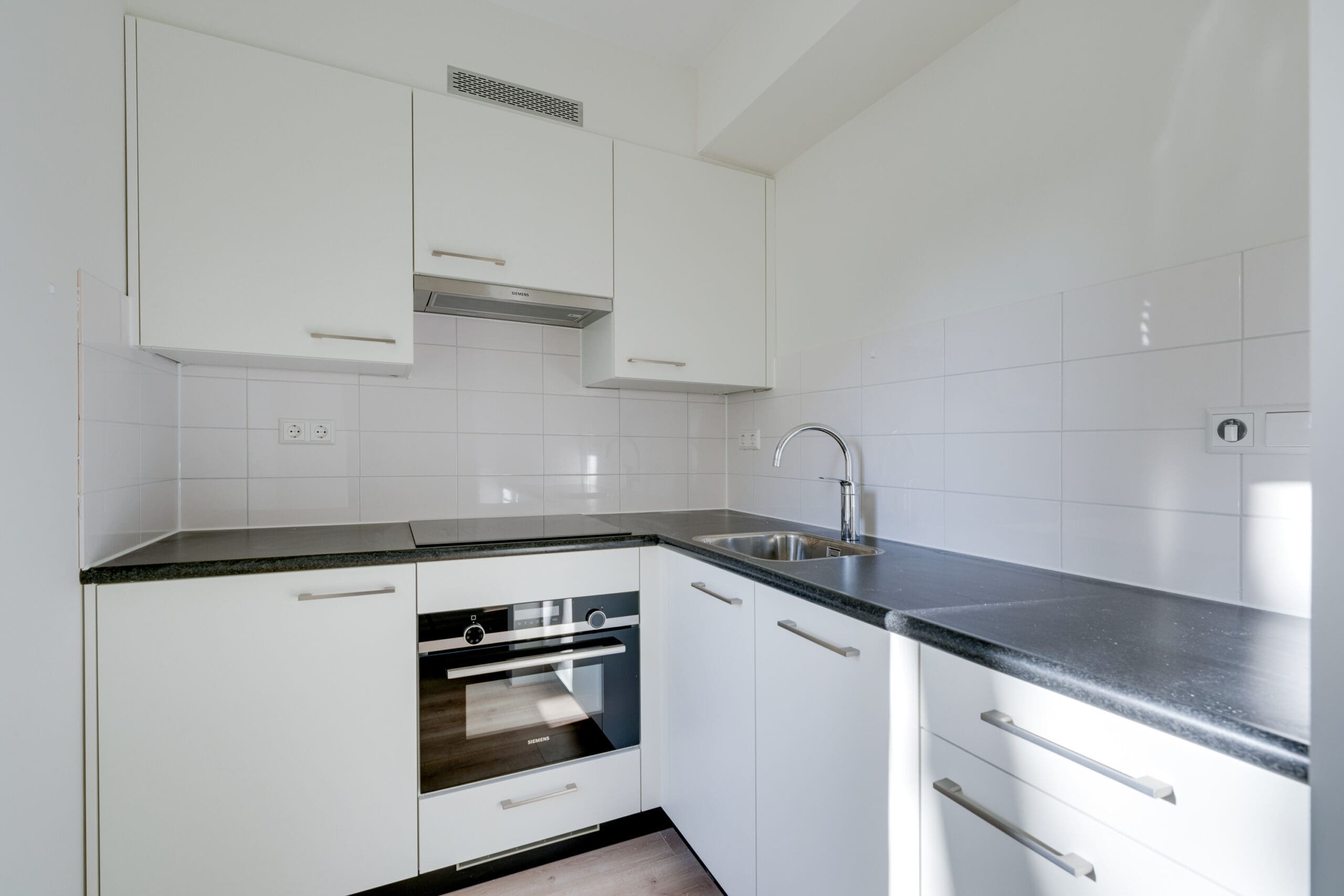 De ruime woonkamer met gedeeltelijk open keuken is gelegen aan de achterzijde van het appartement en biedt via openslaande deuren toegang tot het zonnige balkon op het zuiden. De moderne keuken is voorzien van diverse Siemens inbouwapparatuur zoals een inductiekookplaat, combi-oven, vaatwasmachine en koelkast met vriesvak.