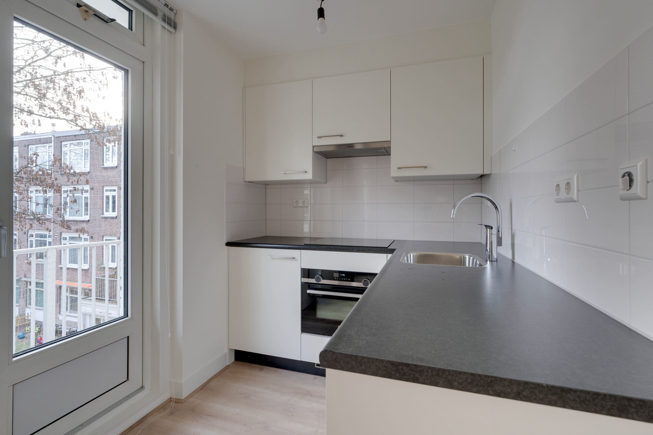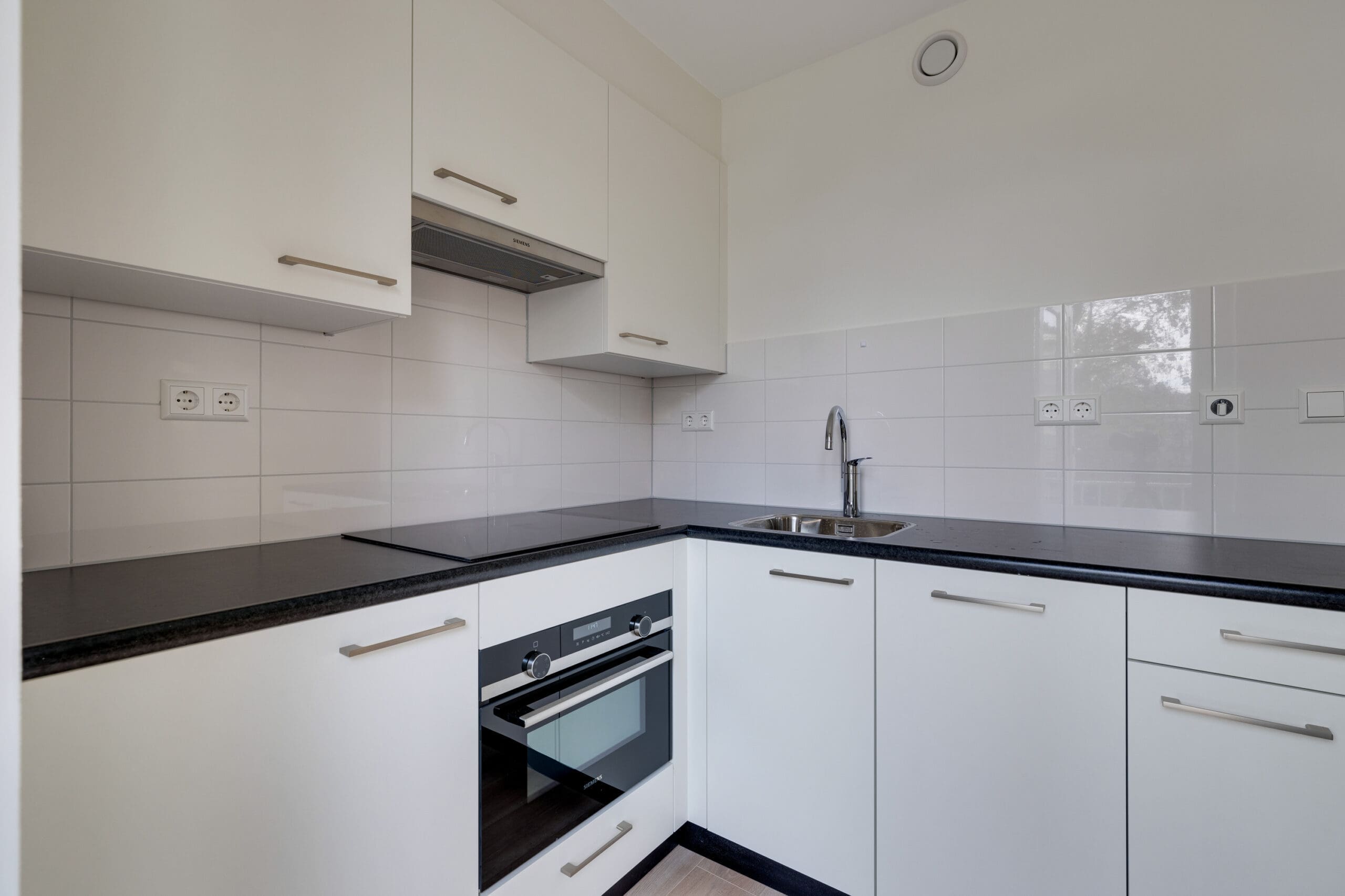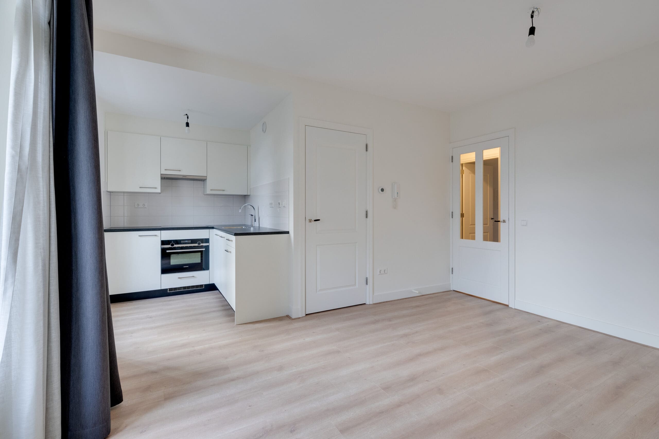 De woonkamer met open keuken is gelegen aan de achterzijde van het appartement waarbij openslaande deuren toegang geven tot het zonnige balkon op het zuiden. Het appartement beschikt over een moderne open keuken voorzien van diverse Siemens inbouwapparatuur zoals een inductiekookplaat met wasemkap, combimagnetron, vaatwasser en koelkast met vriesvak. De twee slaapkamers zijn gelegen aan de voorzijde van de woning en voorzien van verduisterende overgordijnen. De badkamer is voorzien van een inloopdouche, zwevend toilet, wastafel met spiegel en planchet en een design radiator.