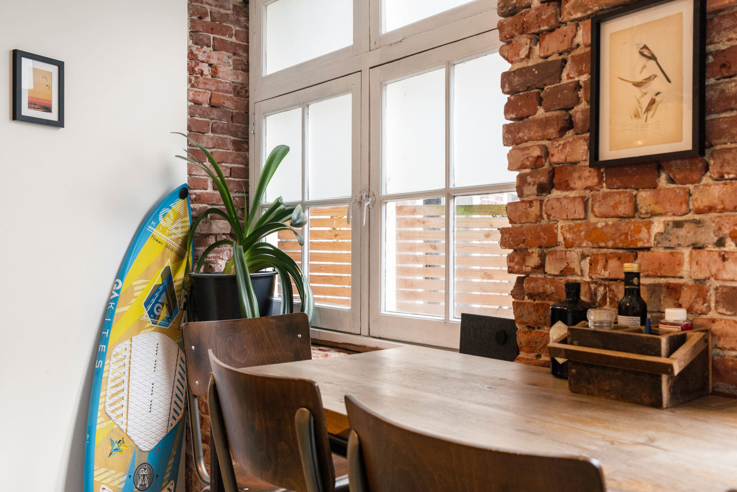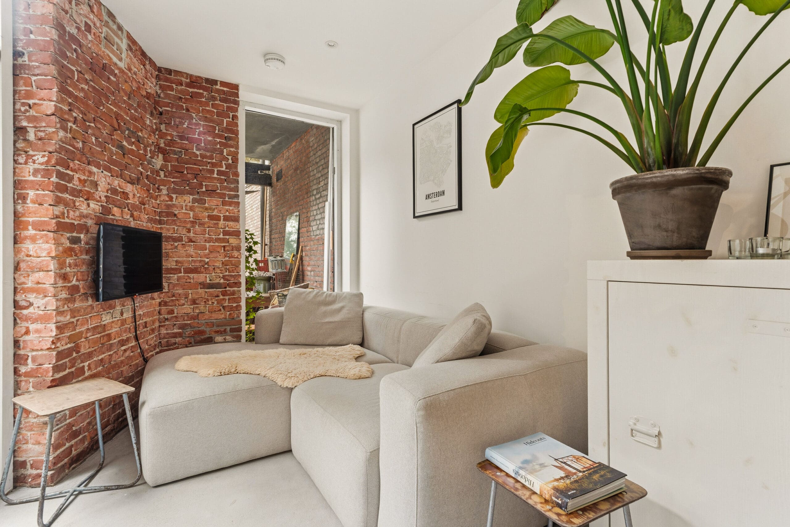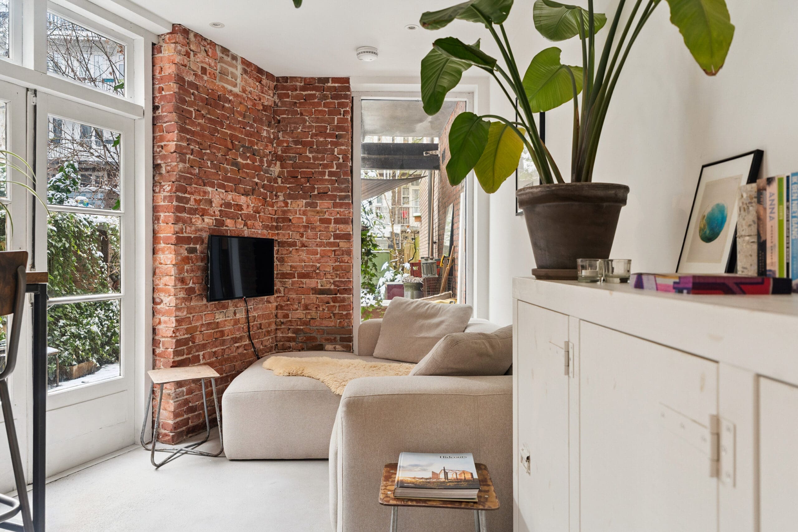 The living room is situated at the garden side, making it wonderfully quiet. This is an inviting and pleasant living space where indoor and outdoor living blend seamlessly; on sunny days, the garden becomes a natural extension of the living area.