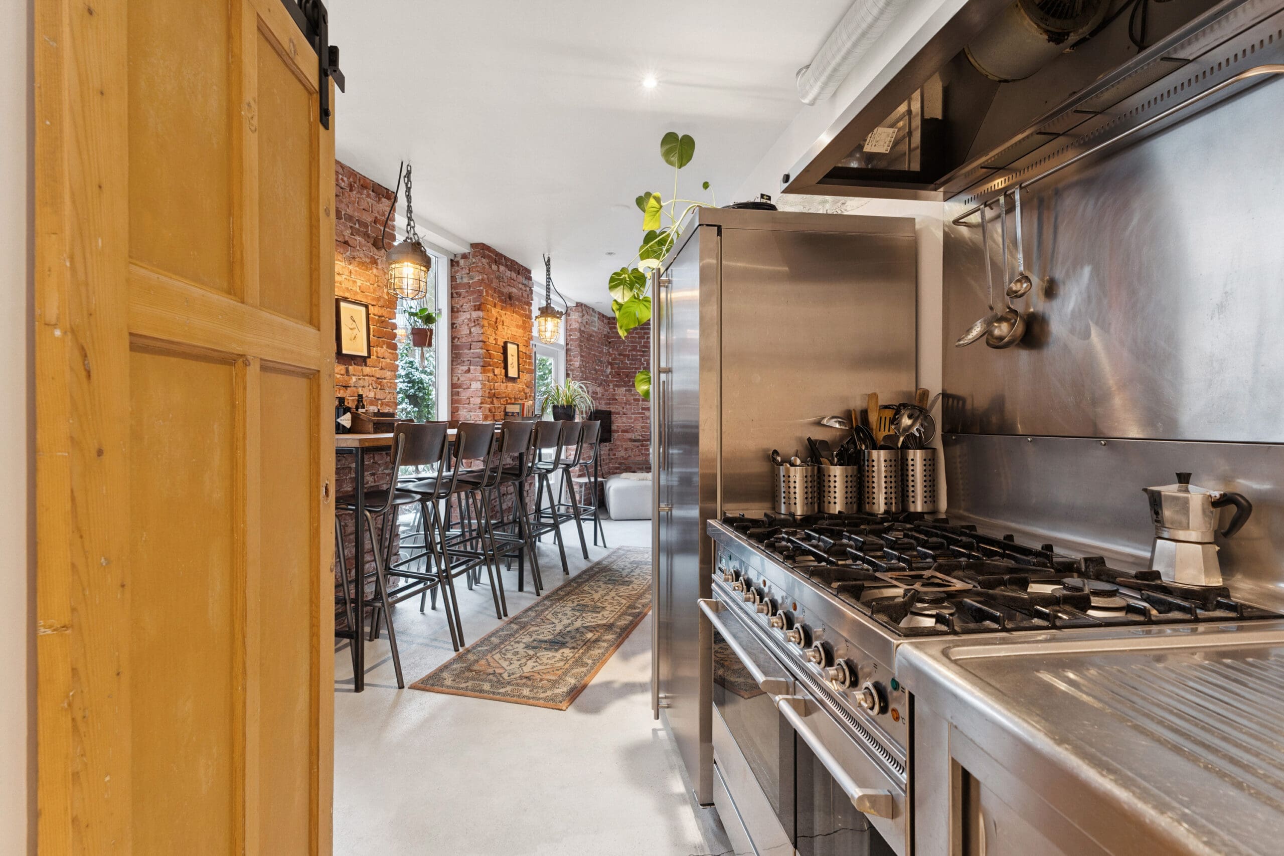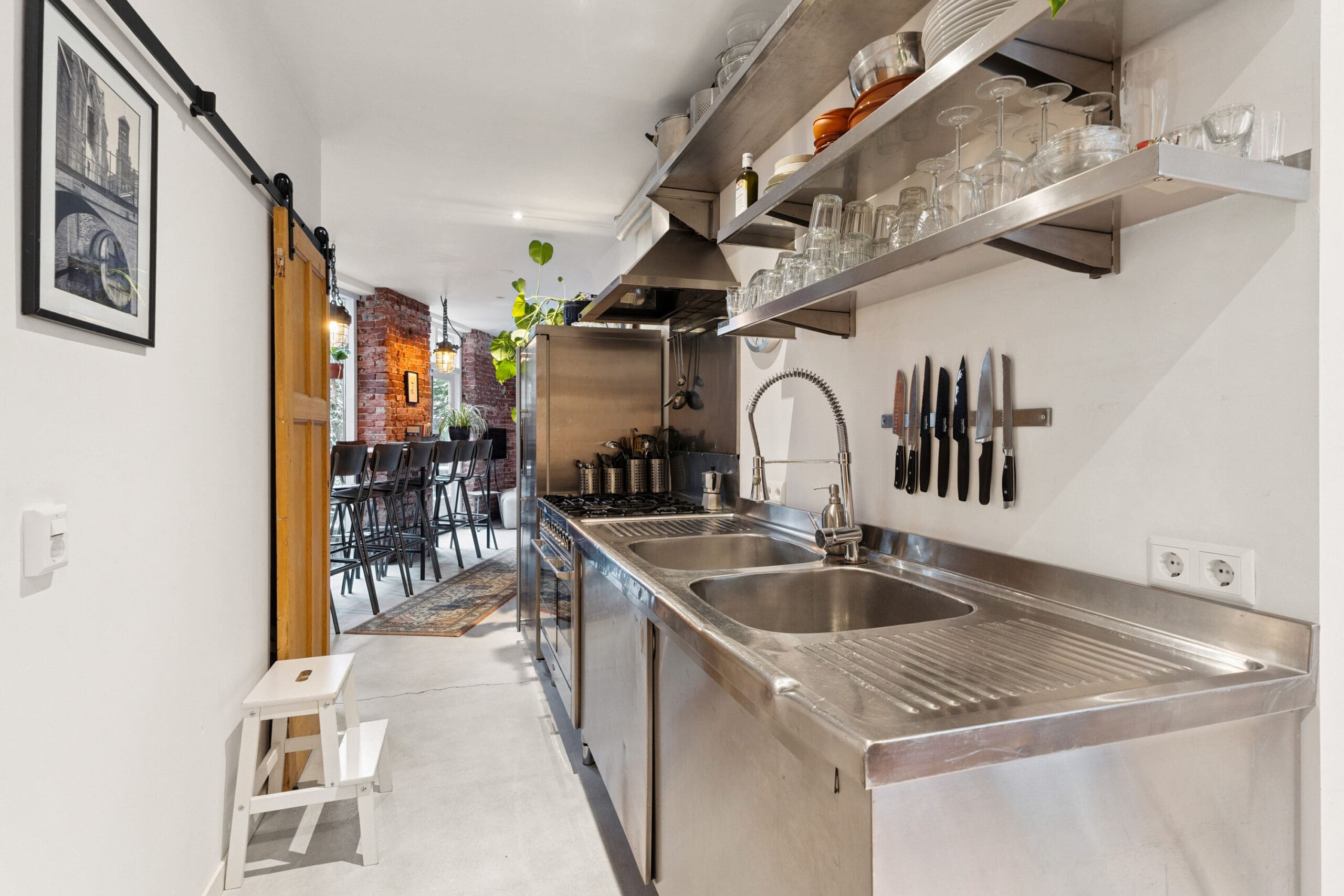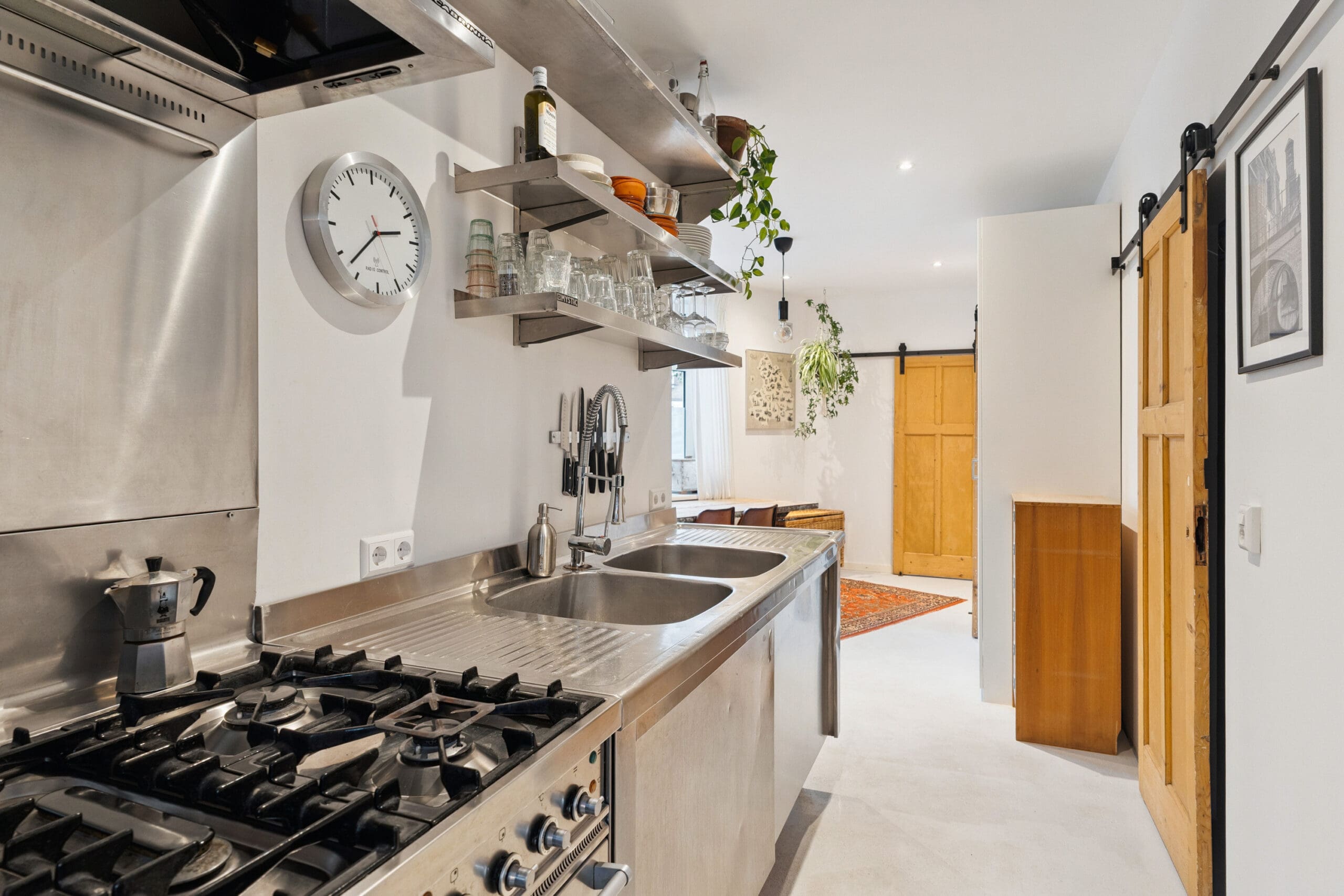 De keuken bevindt zich centraal in het appartement, in de doorloop naar de woonkamer. Deze roestvrijstalen keuken bestaat uit losse elementen die samen een strak en modern geheel vormen.