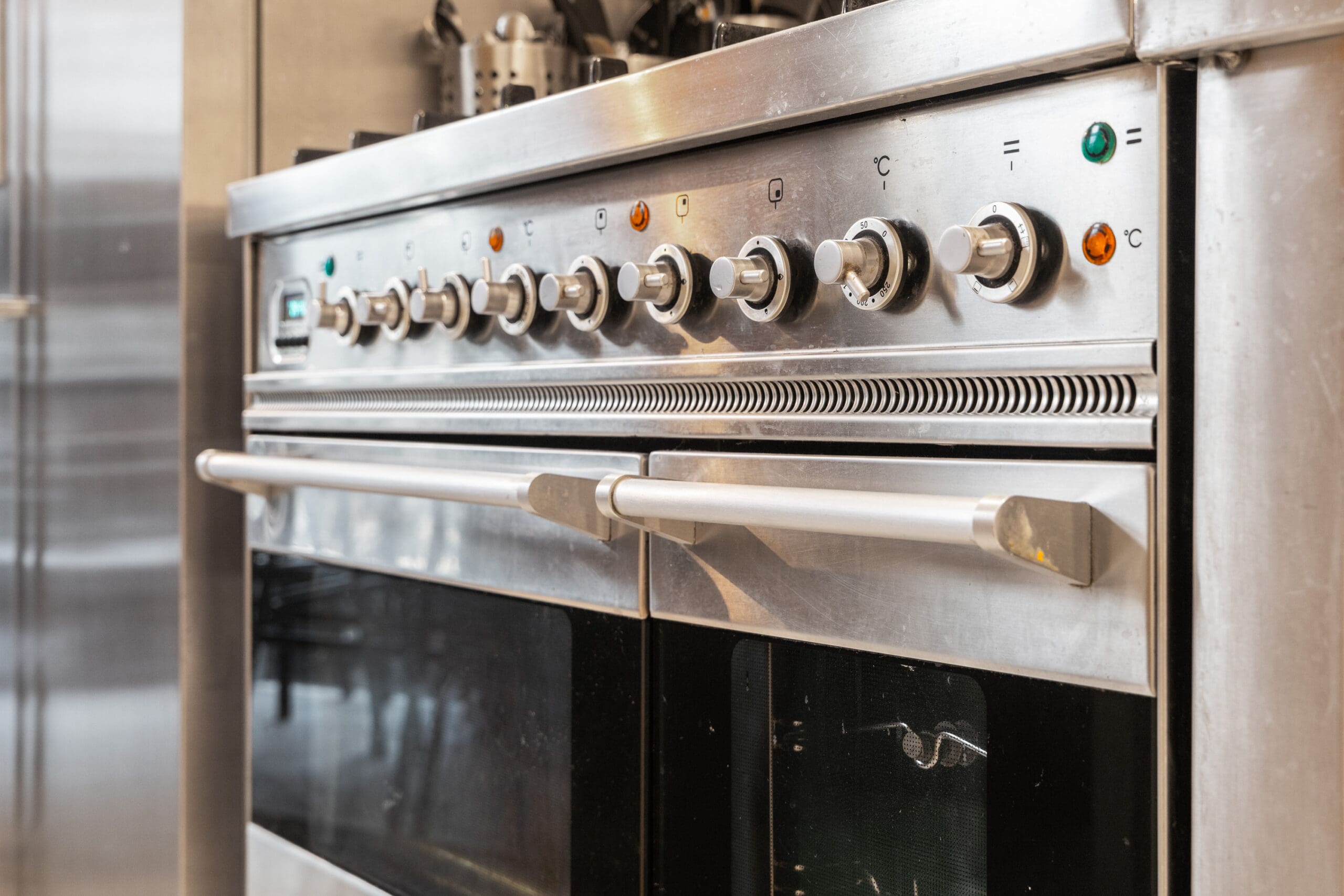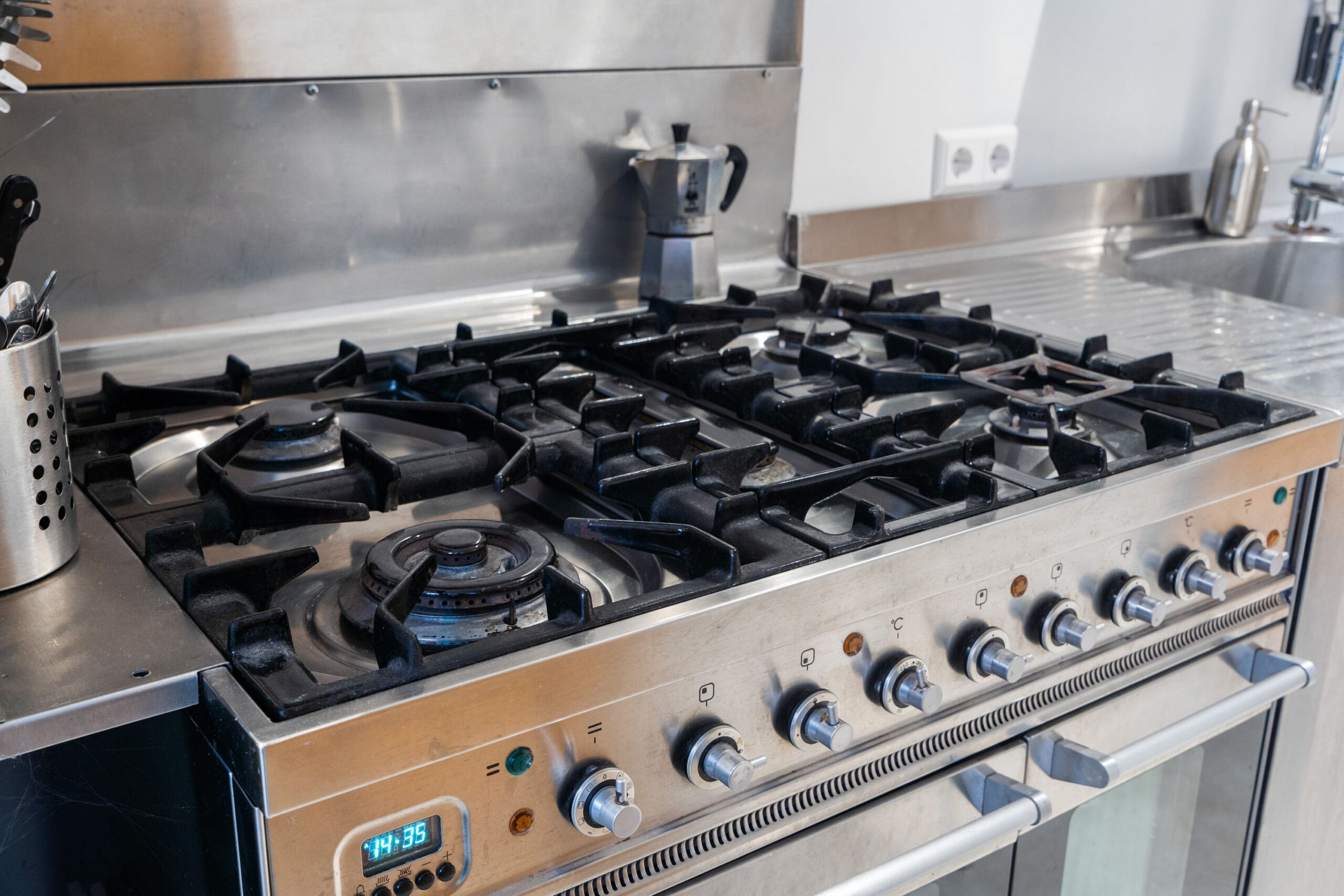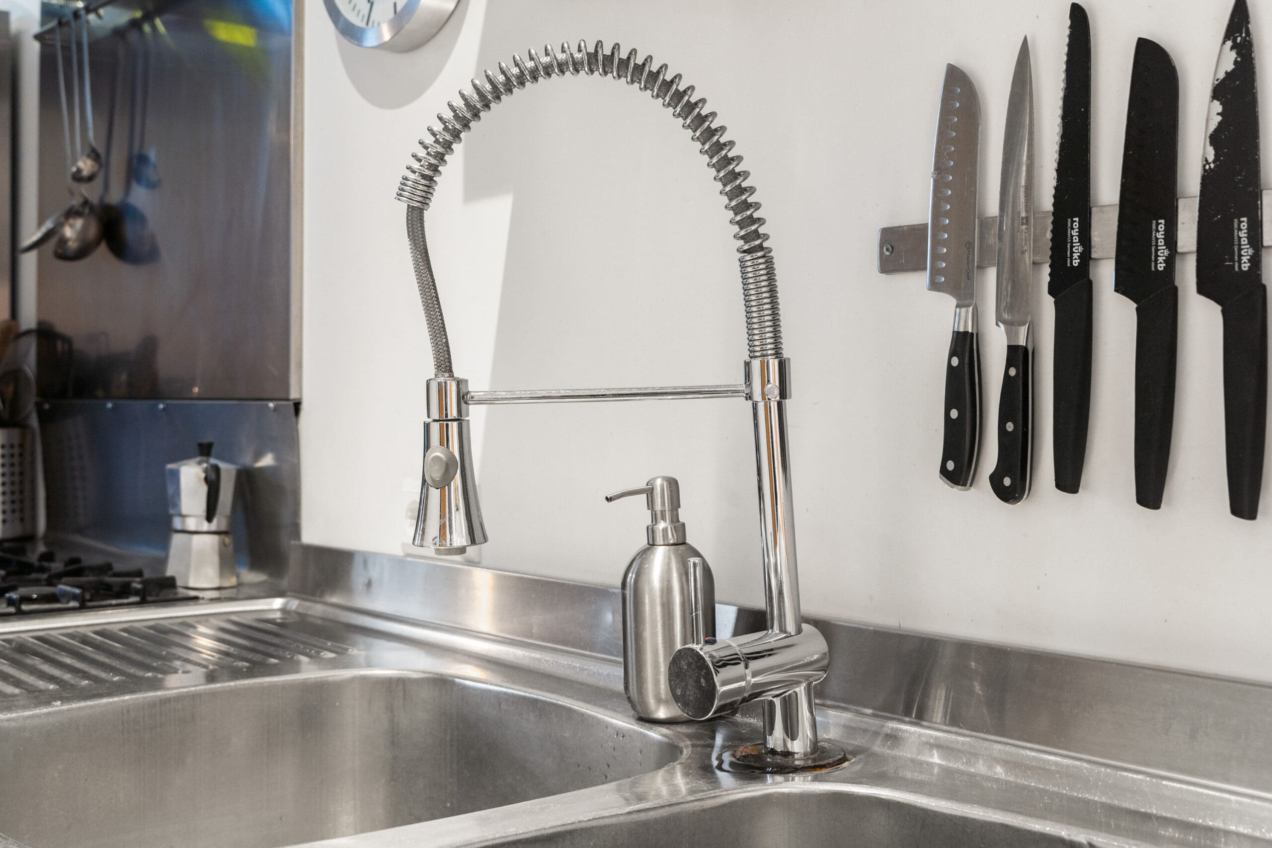 The kitchen is centrally located in the apartment, positioned along the passage to the living room. This stainless steel kitchen consists of separate elements that together create a sleek and modern design.