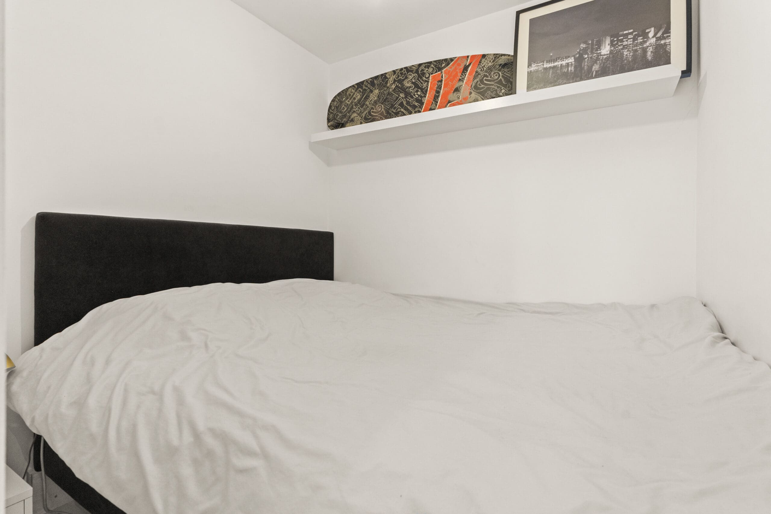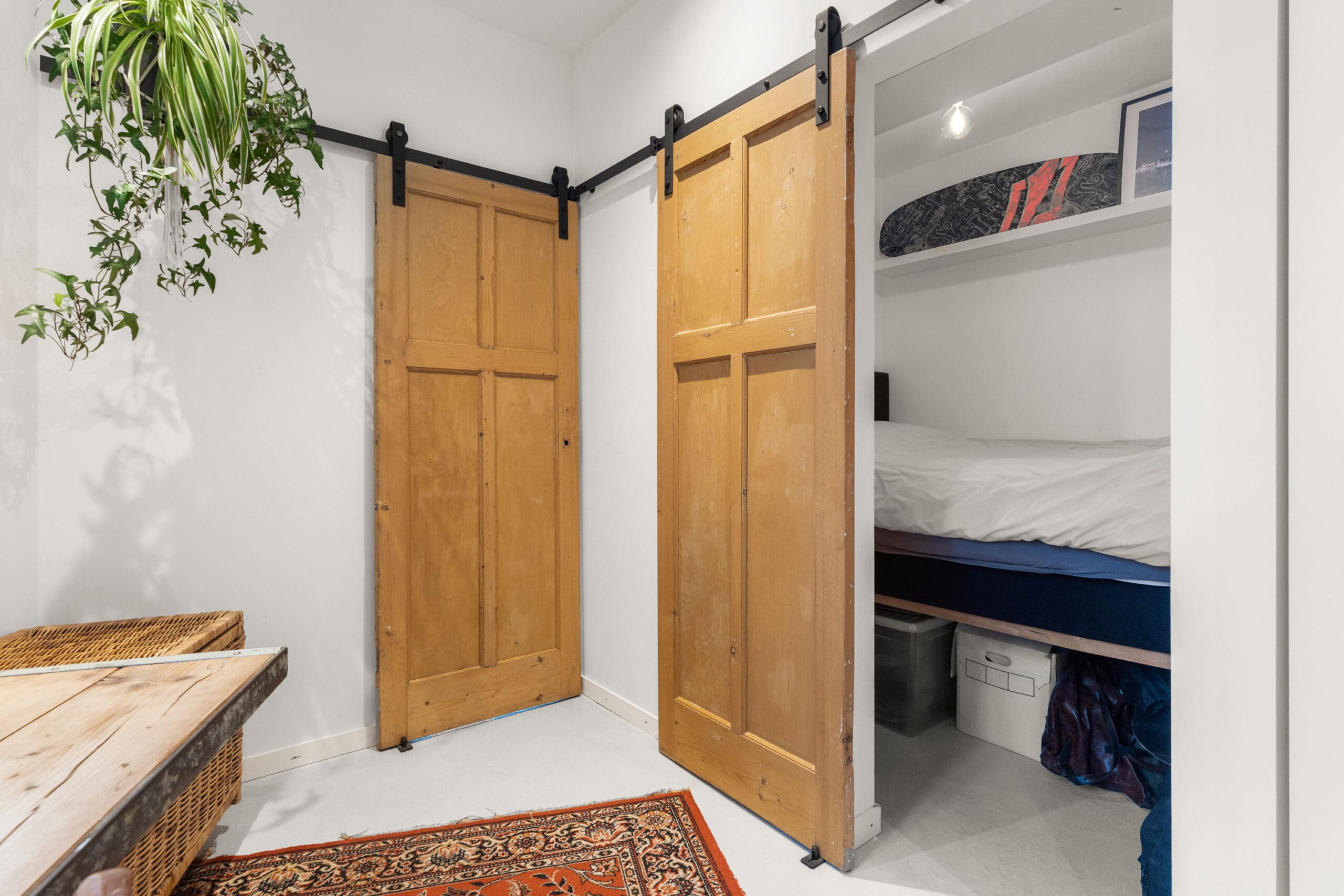 The first bedroom is located at the front of the apartment and is of a good size. The second bedroom has been cleverly designed as a sleeping alcove, featuring a built-in elevated bed with additional (storage) space underneath.
