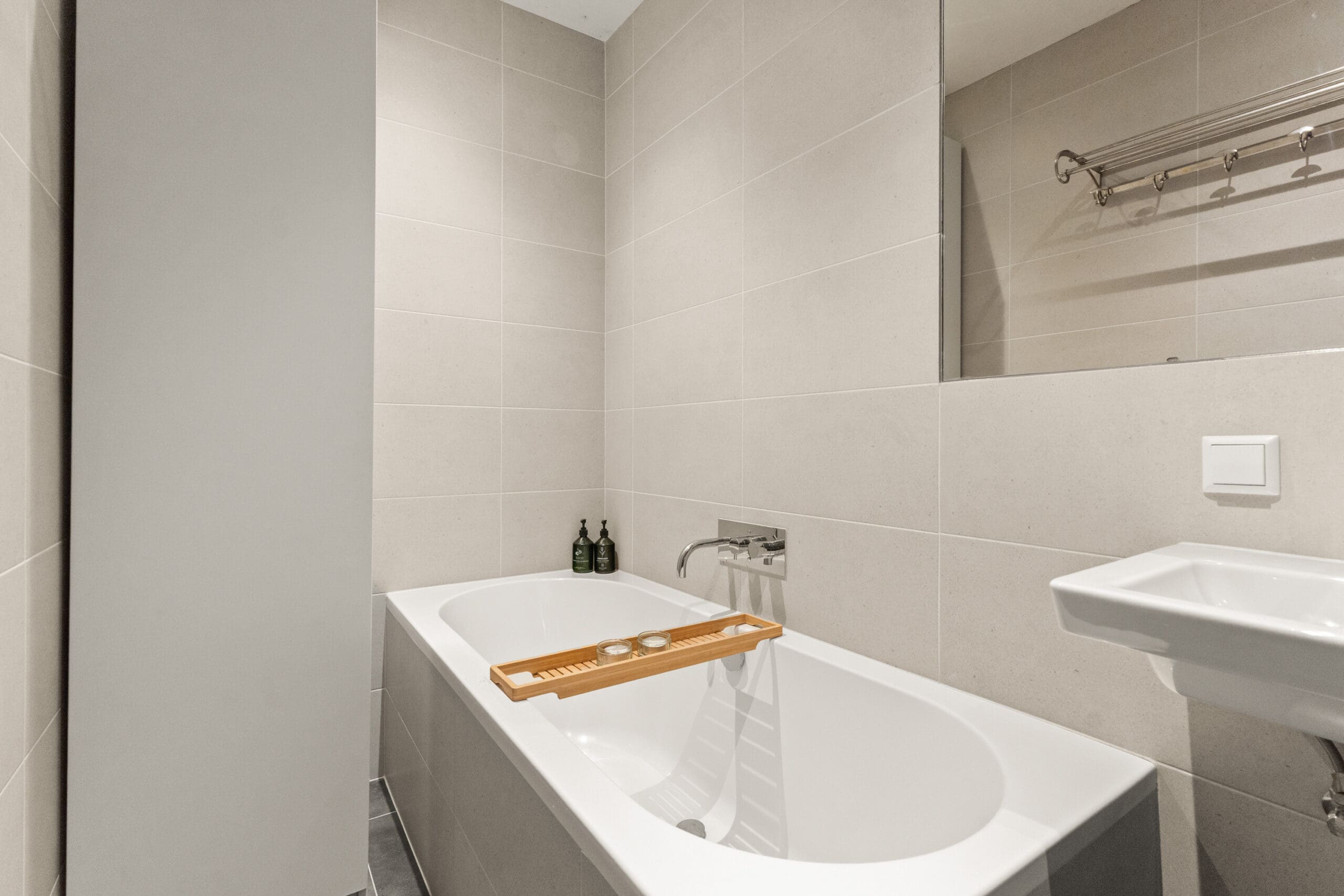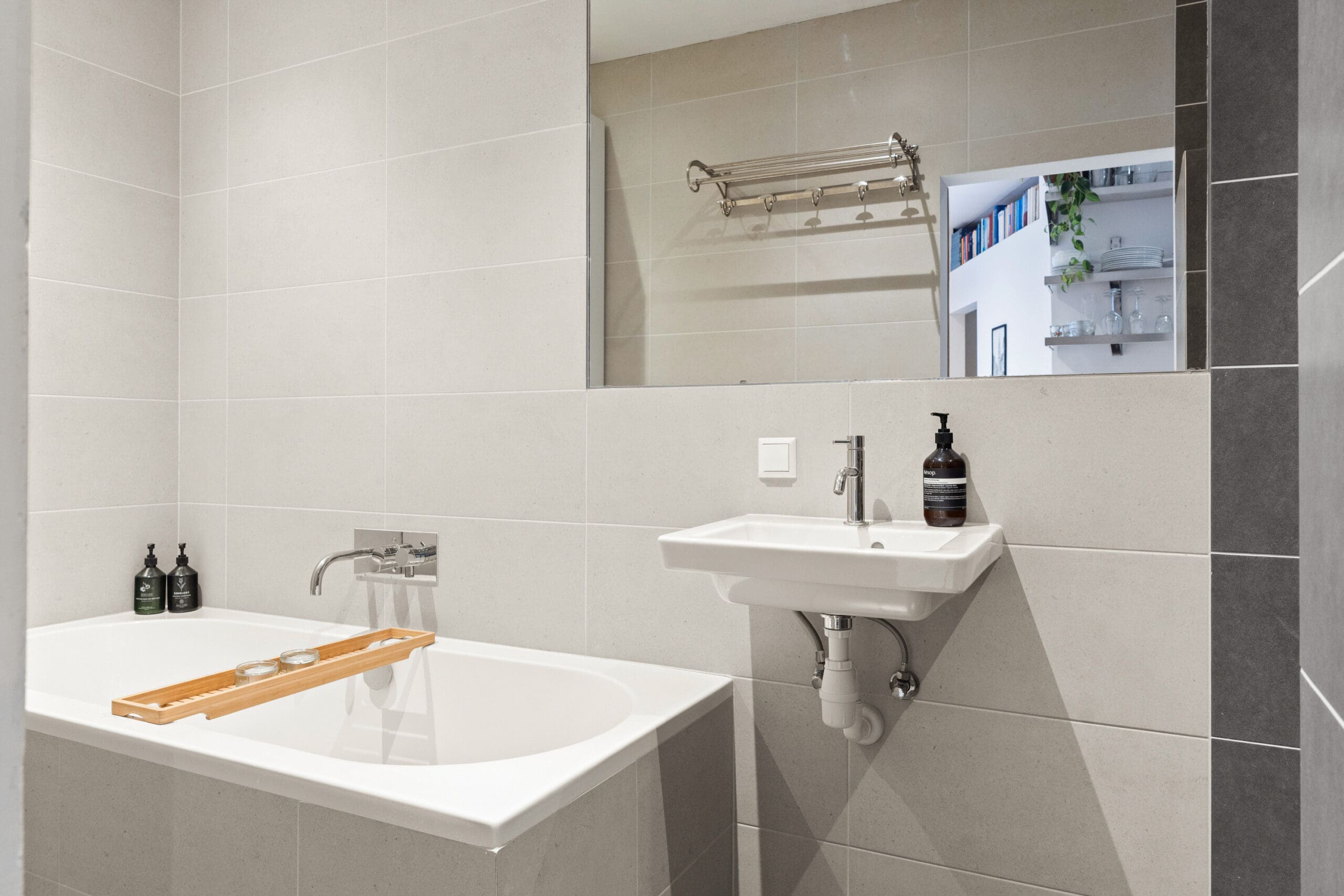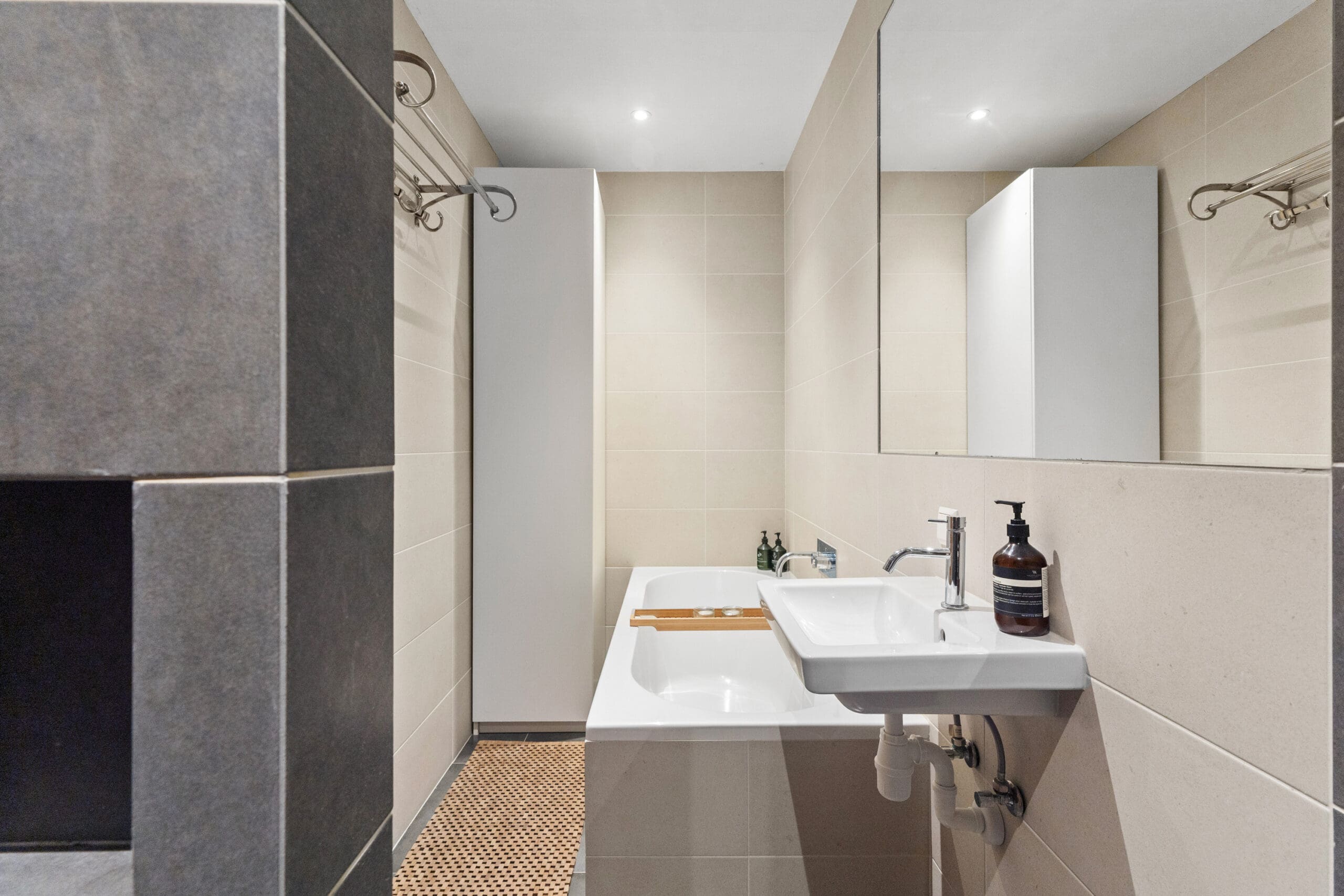De woonkamer is aan de tuinzijde gelegen en daardoor heerlijk rustig. Dit is een sfeervolle en prettige leefruimte waar binnen en buiten naadloos in elkaar overlopen; op zonnige dagen vormt de tuin een natuurlijke verlenging van de woonruimte. Tegenover de keuken ligt de moderne badkamer, een echte plek om te ontspannen, voorzien van een ligbad, een inloopdouche met dubbele stortdouche en een wastafel.