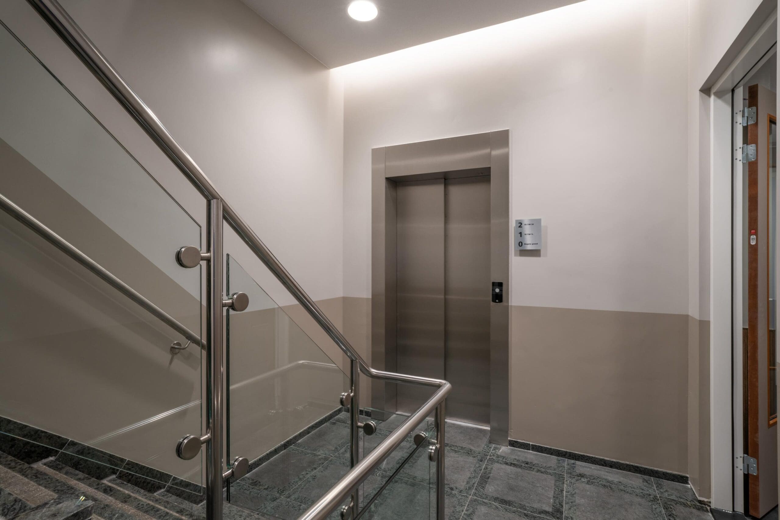 The entrance on the ground floor leads to the central hall with elevator and stairway to the first and second floors. The apartment is located on the first floor.