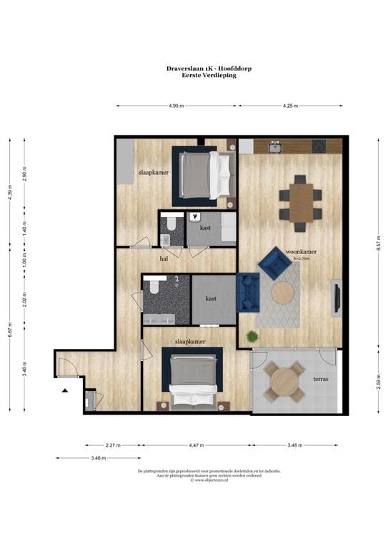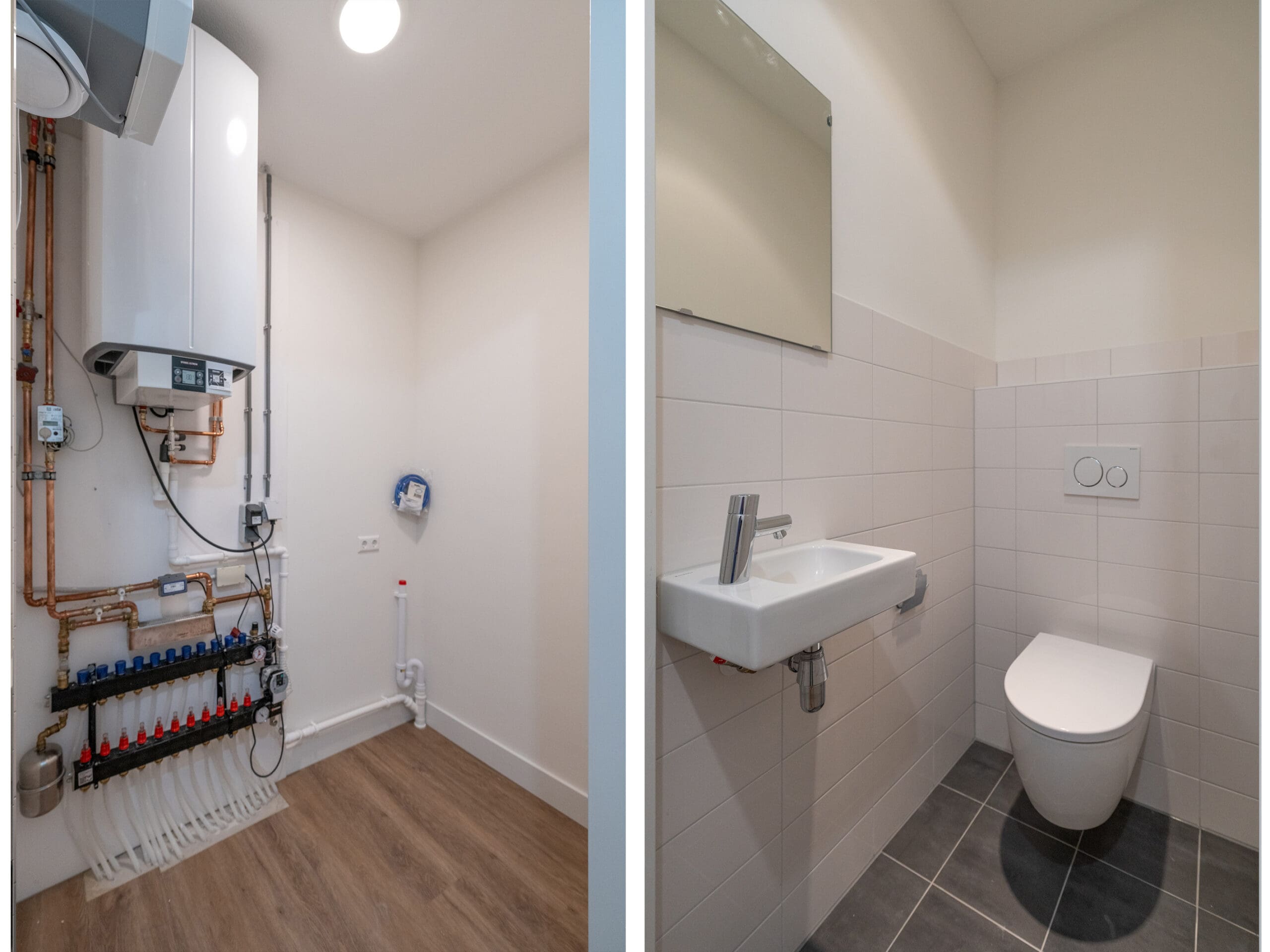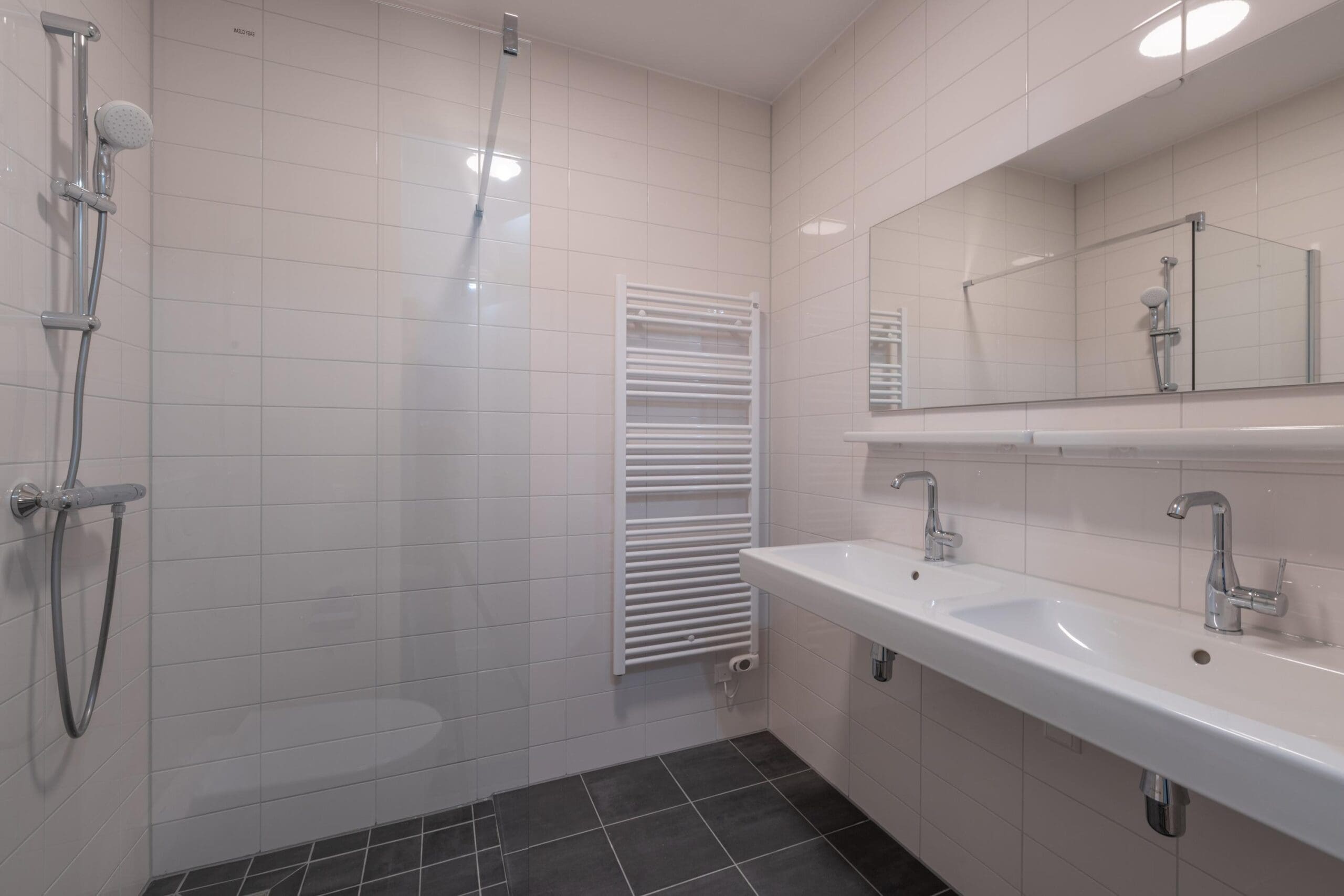 Upon entering the apartment, the hallway provides access to all rooms. The apartment features two spacious bedrooms, one of which includes a practical walk-in closet and direct access to the roof terrace. The generous living room with open kitchen – equipped with various built-in appliances – also offers access to the roof terrace. Centrally located within the apartment you will find a separate toilet, a laundry room with connections for a washing machine and/or dryer and a spacious bathroom equipped with a walk-in shower, double washbasin, and a second toilet.