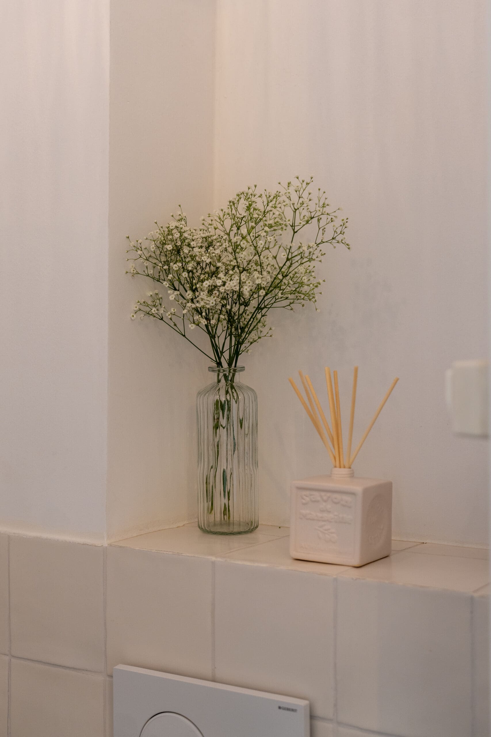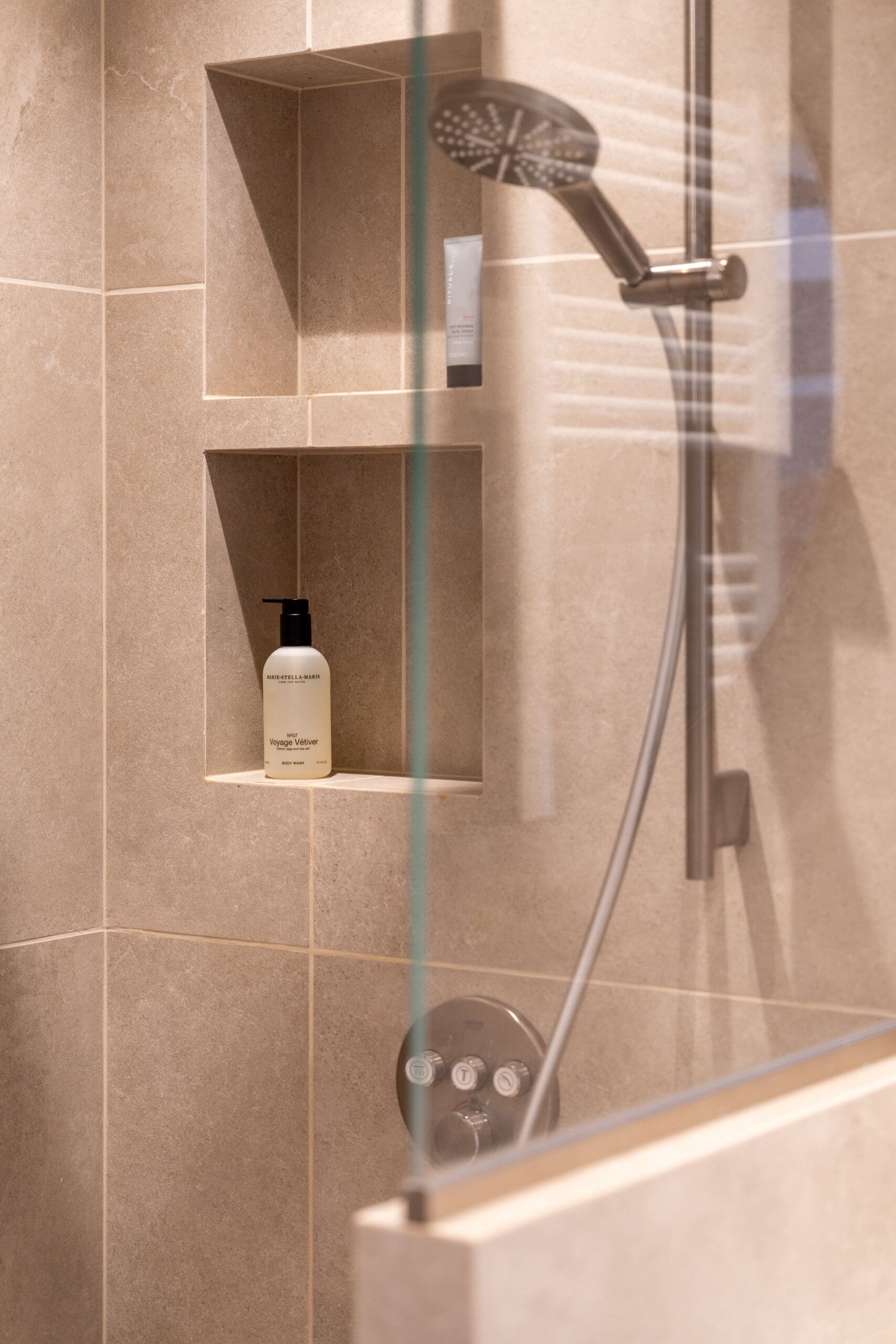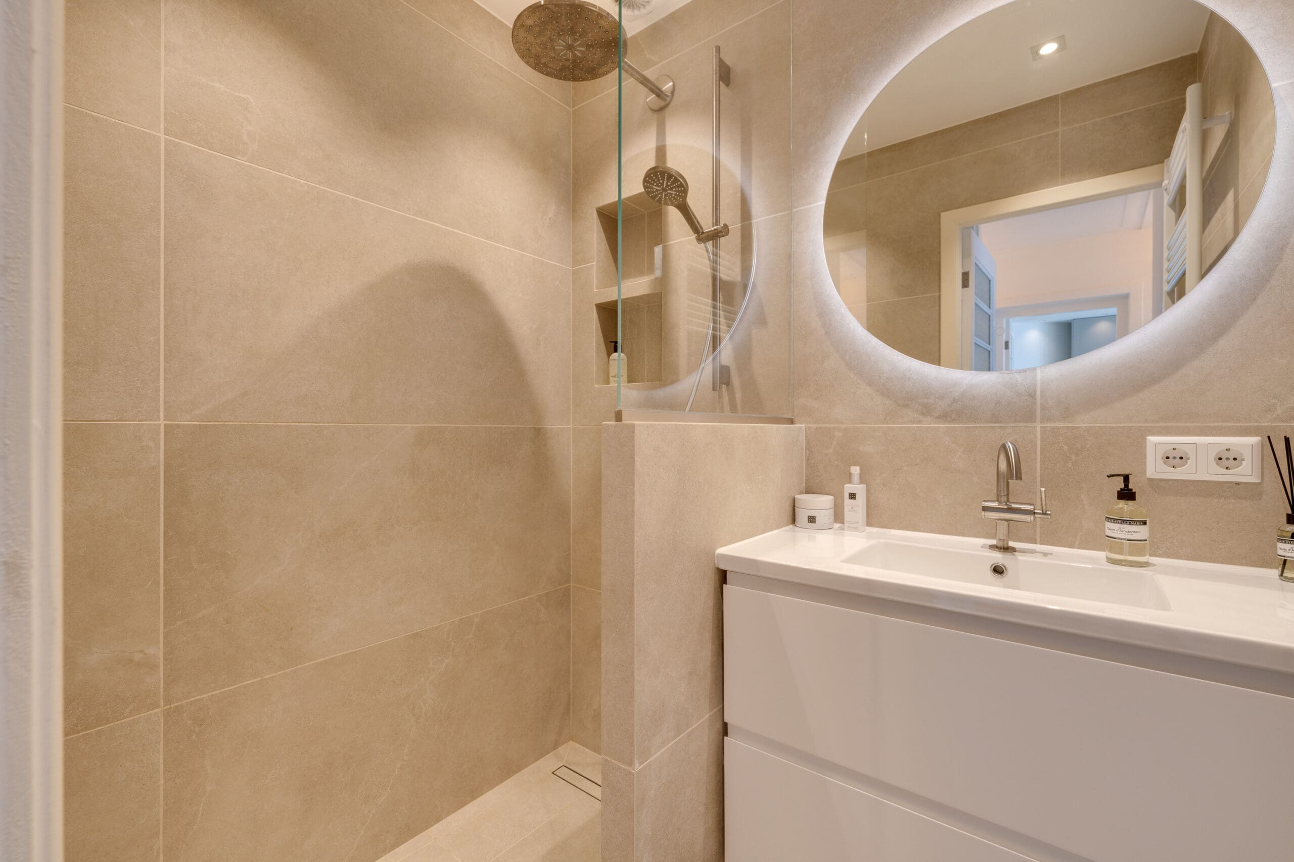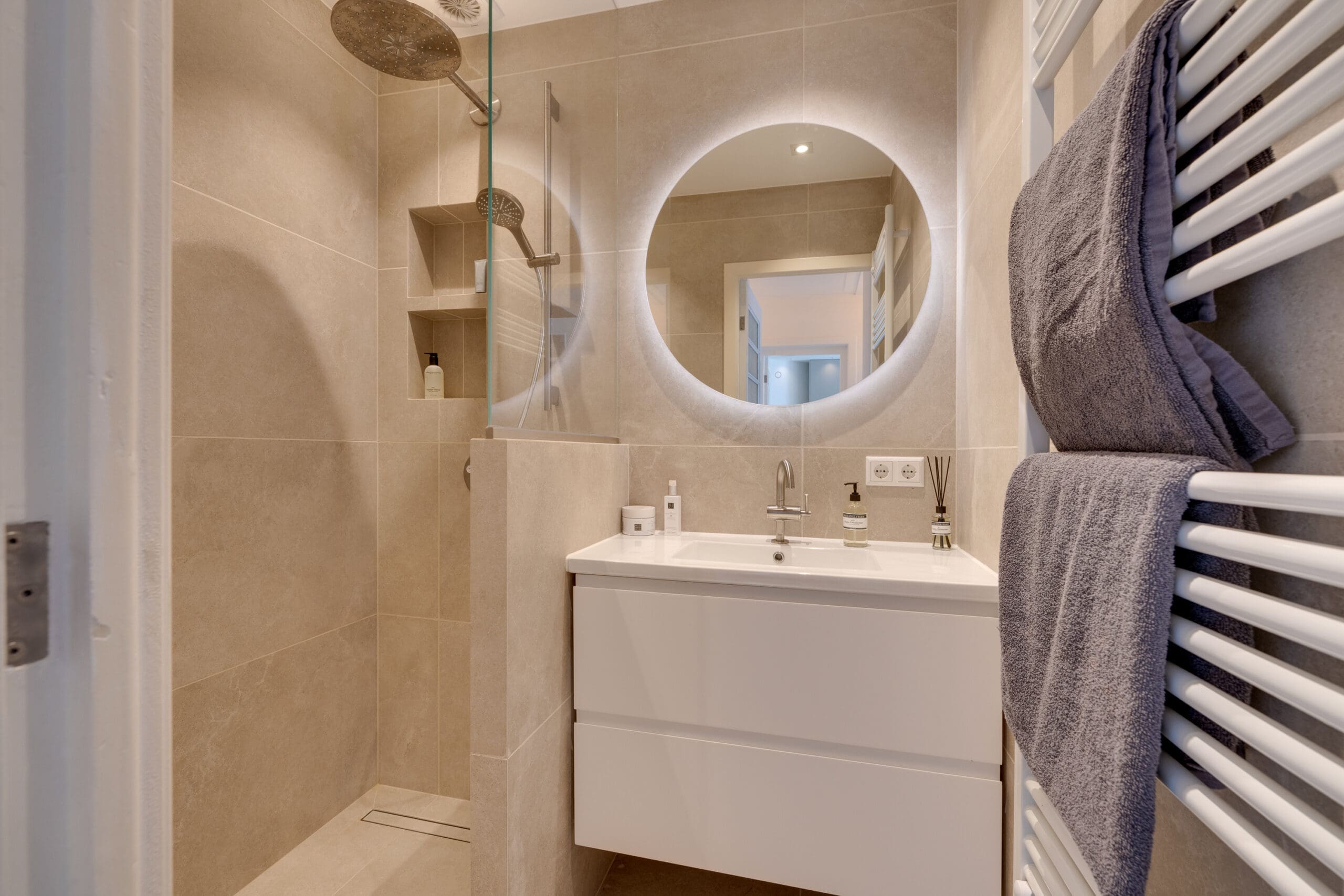 The modern bathroom (2023) includes a walk-in shower, a vanity with sink, and a designer radiator. The separate toilet was also renovated at the same time.