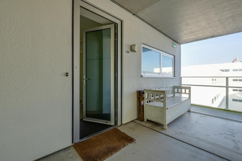Het overdekte portiek biedt toegang tot de entree van het appartement, met zitbankje aan de voorzijde.