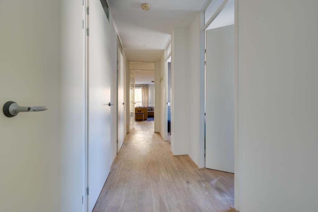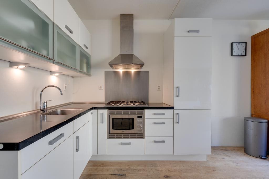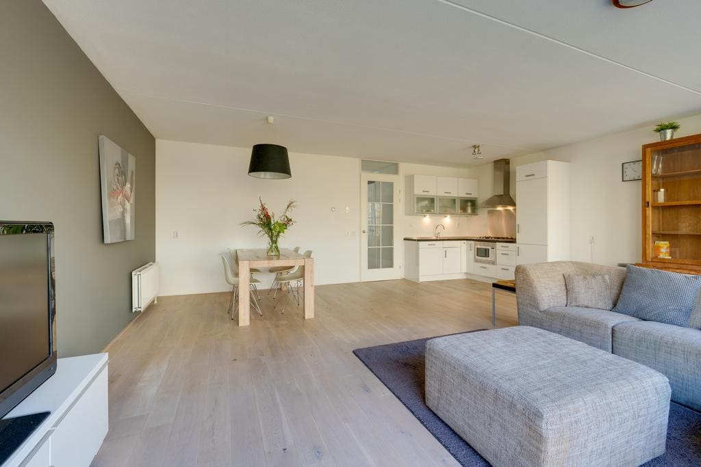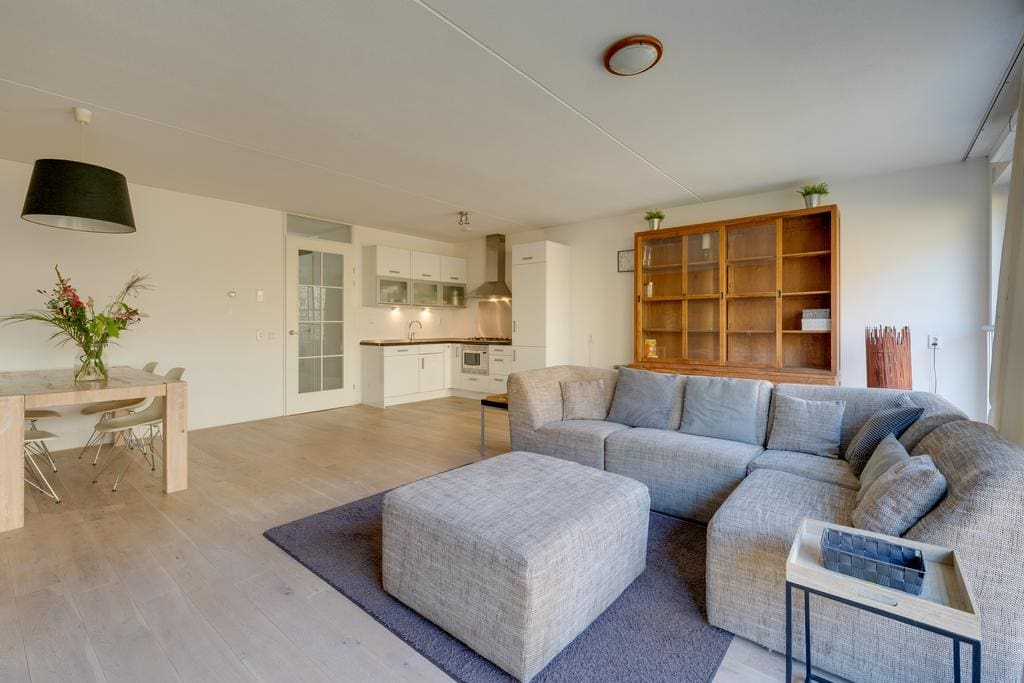 De centrale hal verbindt alle vertrekken. Aan de achterzijde bevindt zich de ruime en lichte woonkamer met open keuken. De keuken is voorzien van diverse inbouwapparatuur, waaronder een koelkast, vriezer, magnetron, 5-pits gasfornuis en vaatwasser, en beschikt over voldoende kastruimte.