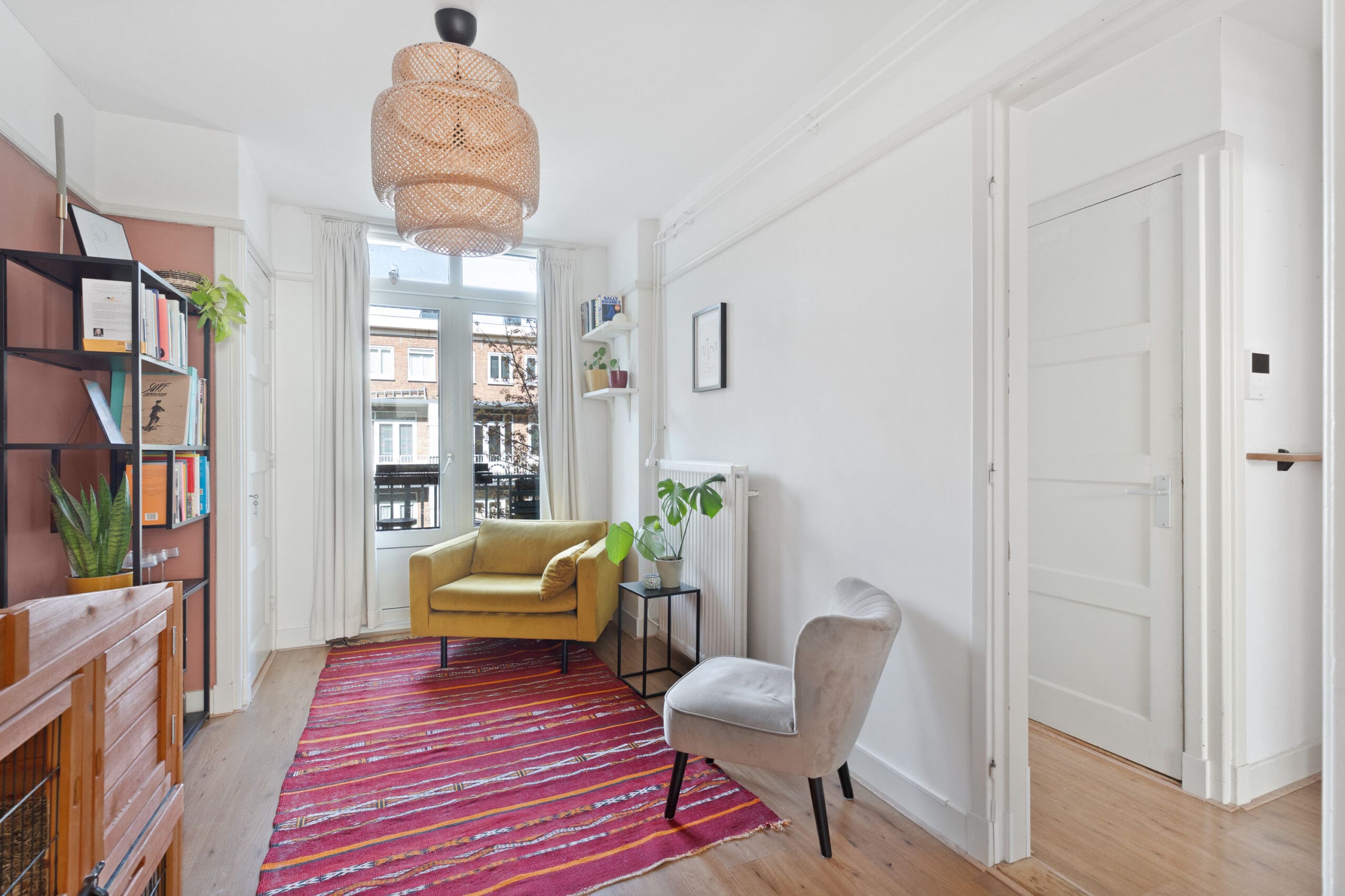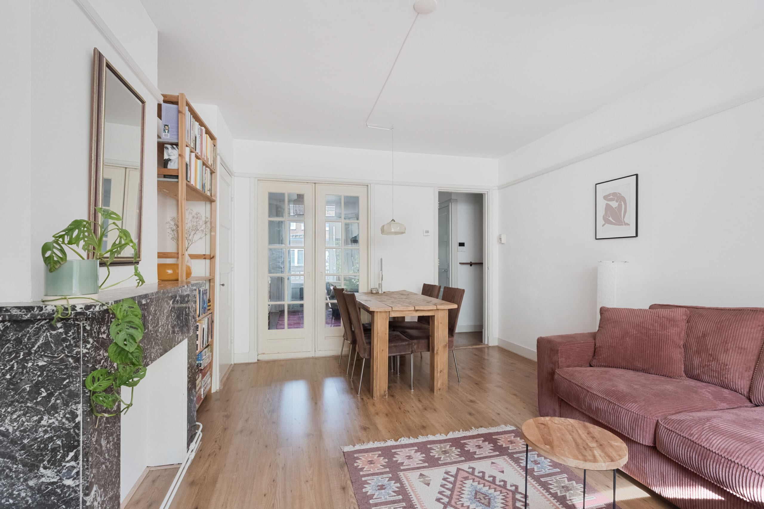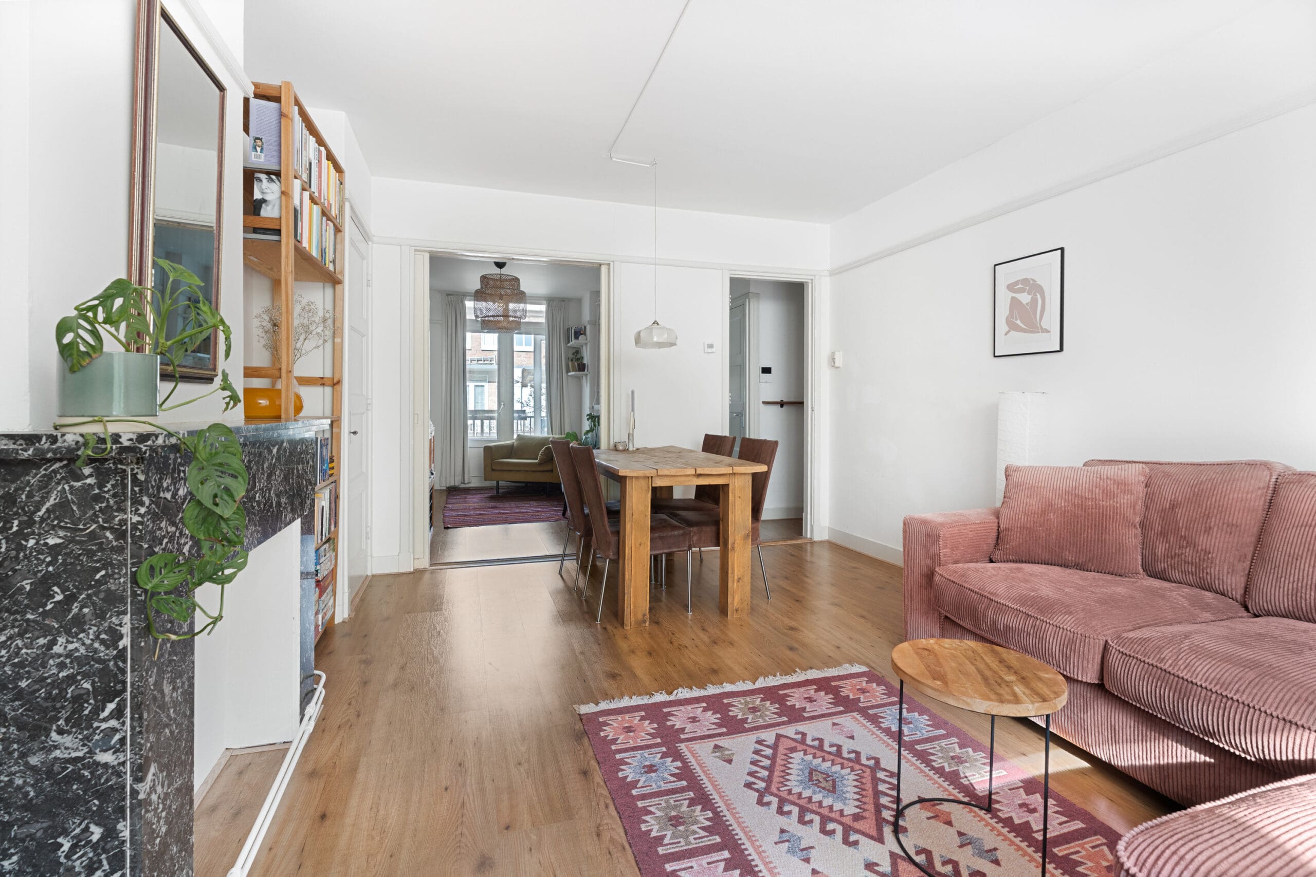 Bij binnenkomst kom je in de hal, die toegang biedt tot alle vertrekken en beschikt over een praktische garderobekast. Aan de voorzijde bevindt zich de sfeervolle en charmante woonkamer met erker. Dankzij de grote raampartijen geniet je hier van een prettige lichtinval en een levendig uitzicht op de straat. De originele marmeren schouw zorgt voor een karaktervolle uitstraling. De aangrenzende achterkamer is middels en suite deuren met inbouwkasten af te sluiten, waardoor deze ruimte desgewenst uitstekend kan dienen als extra slaapkamer.