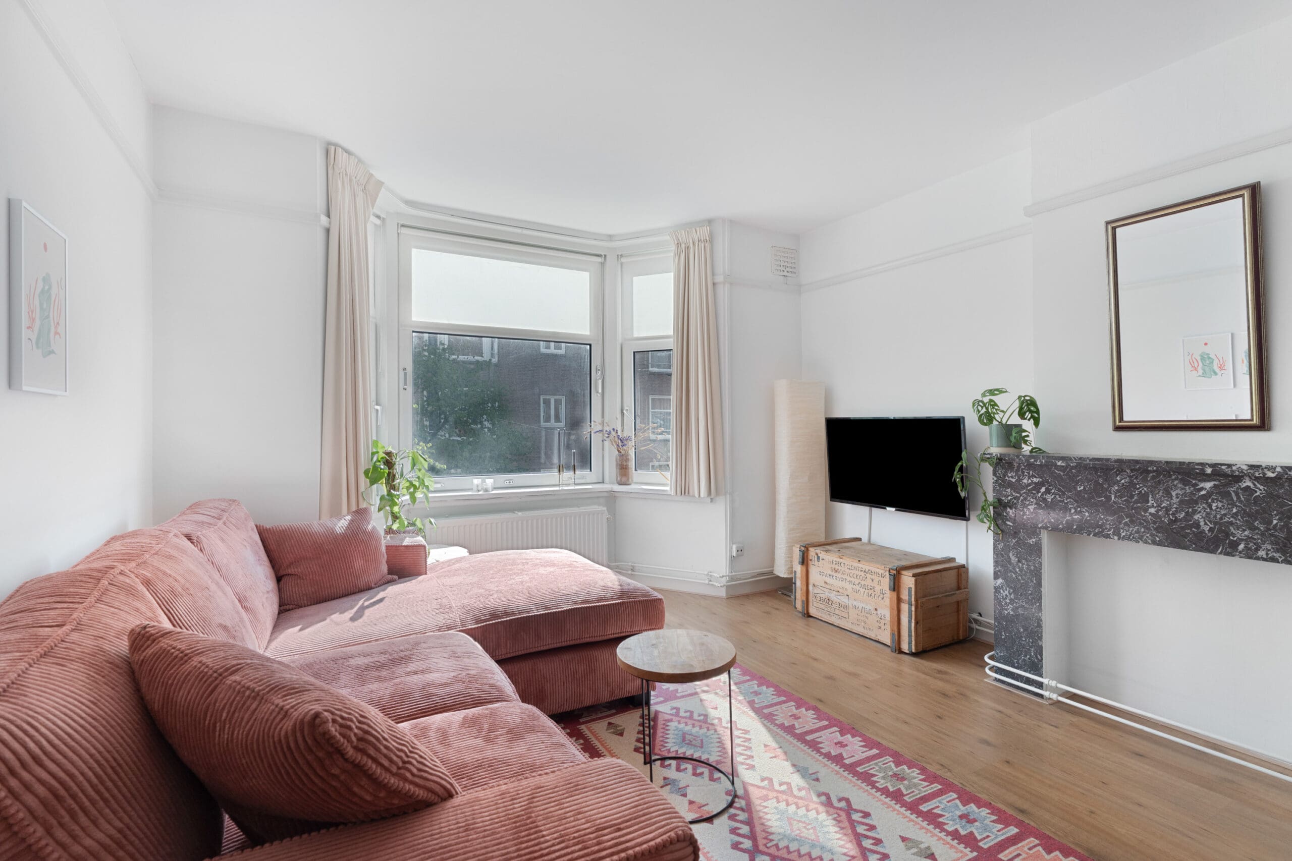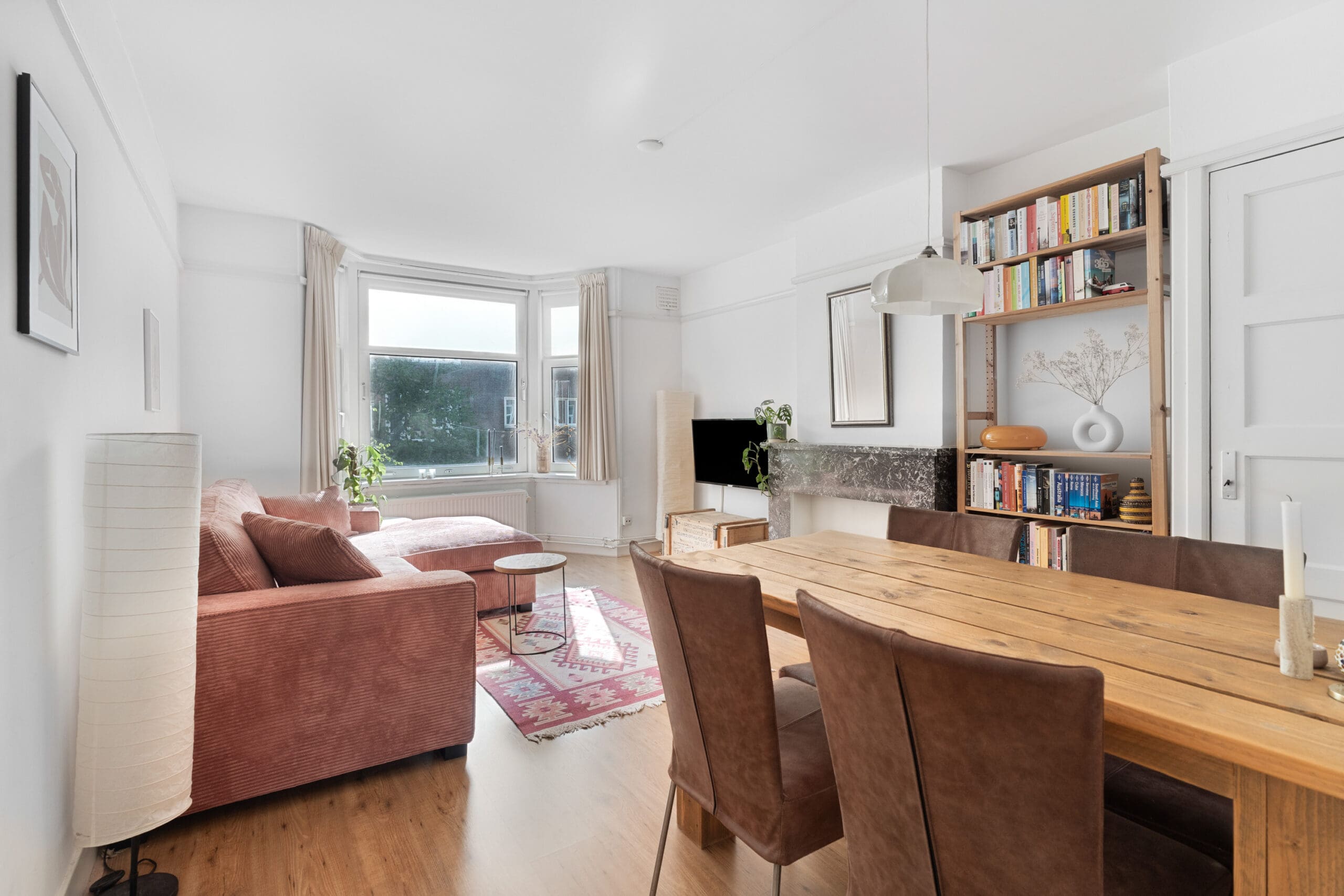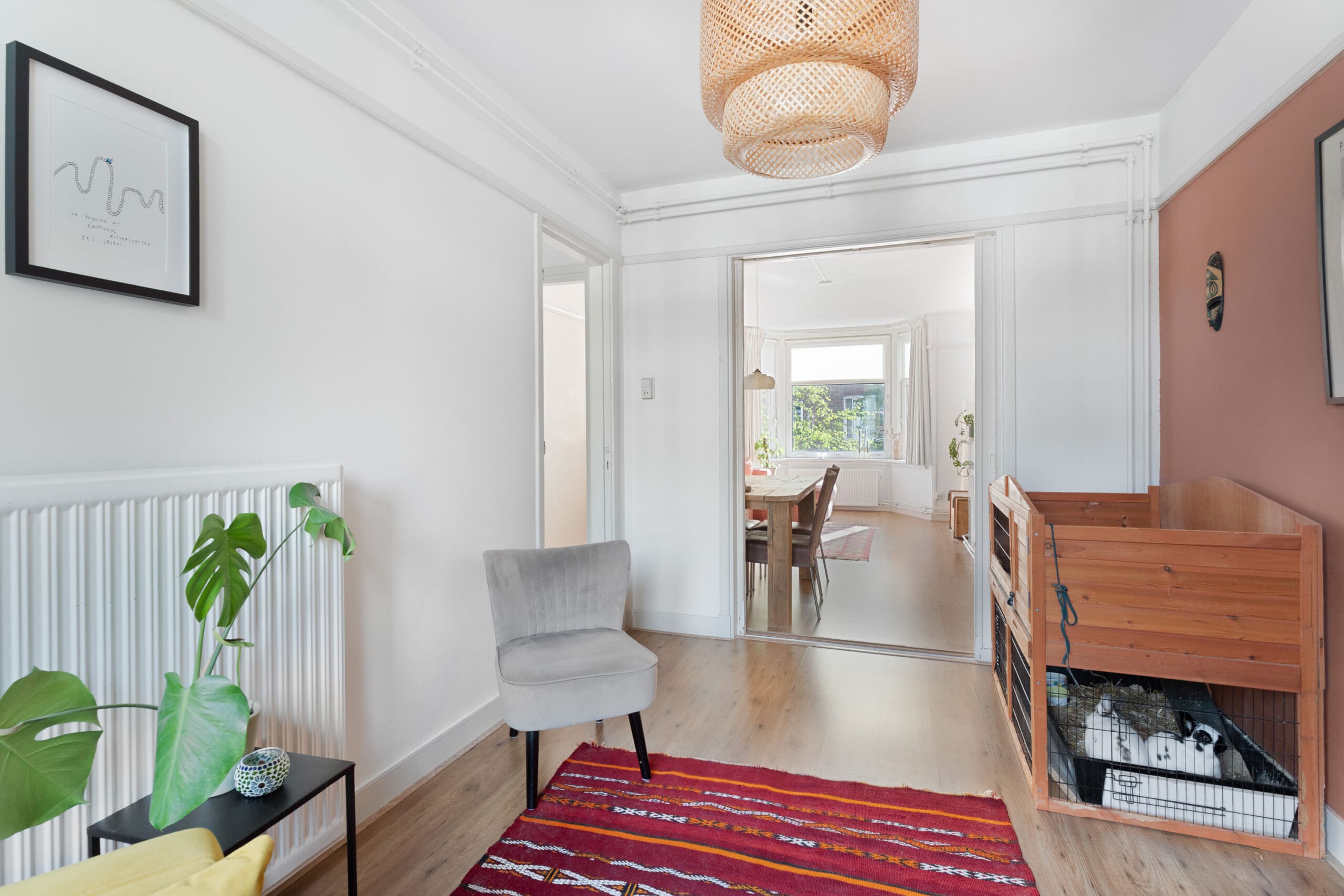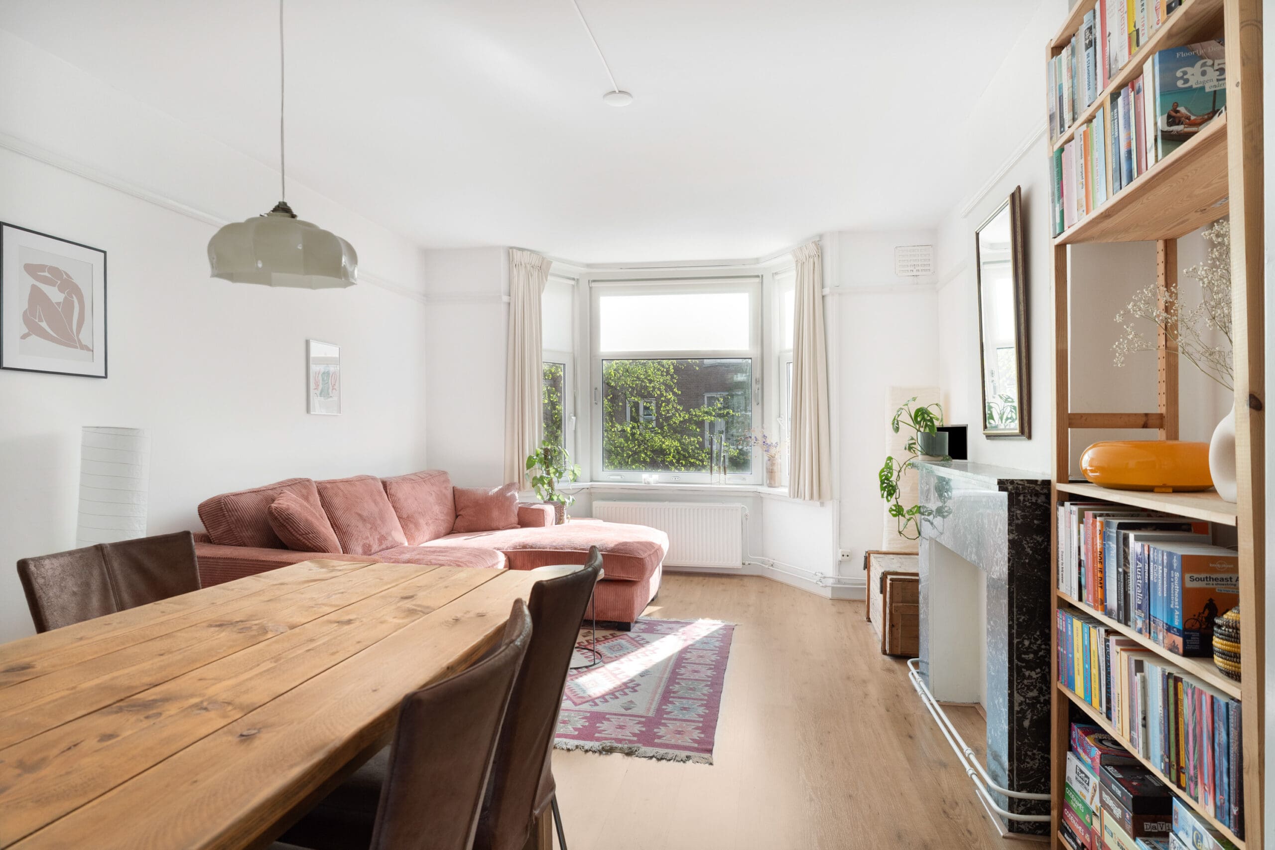 Bij binnenkomst kom je in de hal, die toegang biedt tot alle vertrekken en beschikt over een praktische garderobekast. Aan de voorzijde bevindt zich de sfeervolle en charmante woonkamer met erker. Dankzij de grote raampartijen geniet je hier van een prettige lichtinval en een levendig uitzicht op de straat. De originele marmeren schouw zorgt voor een karaktervolle uitstraling. De aangrenzende achterkamer is middels en suite deuren met inbouwkasten af te sluiten, waardoor deze ruimte desgewenst uitstekend kan dienen als extra slaapkamer.
