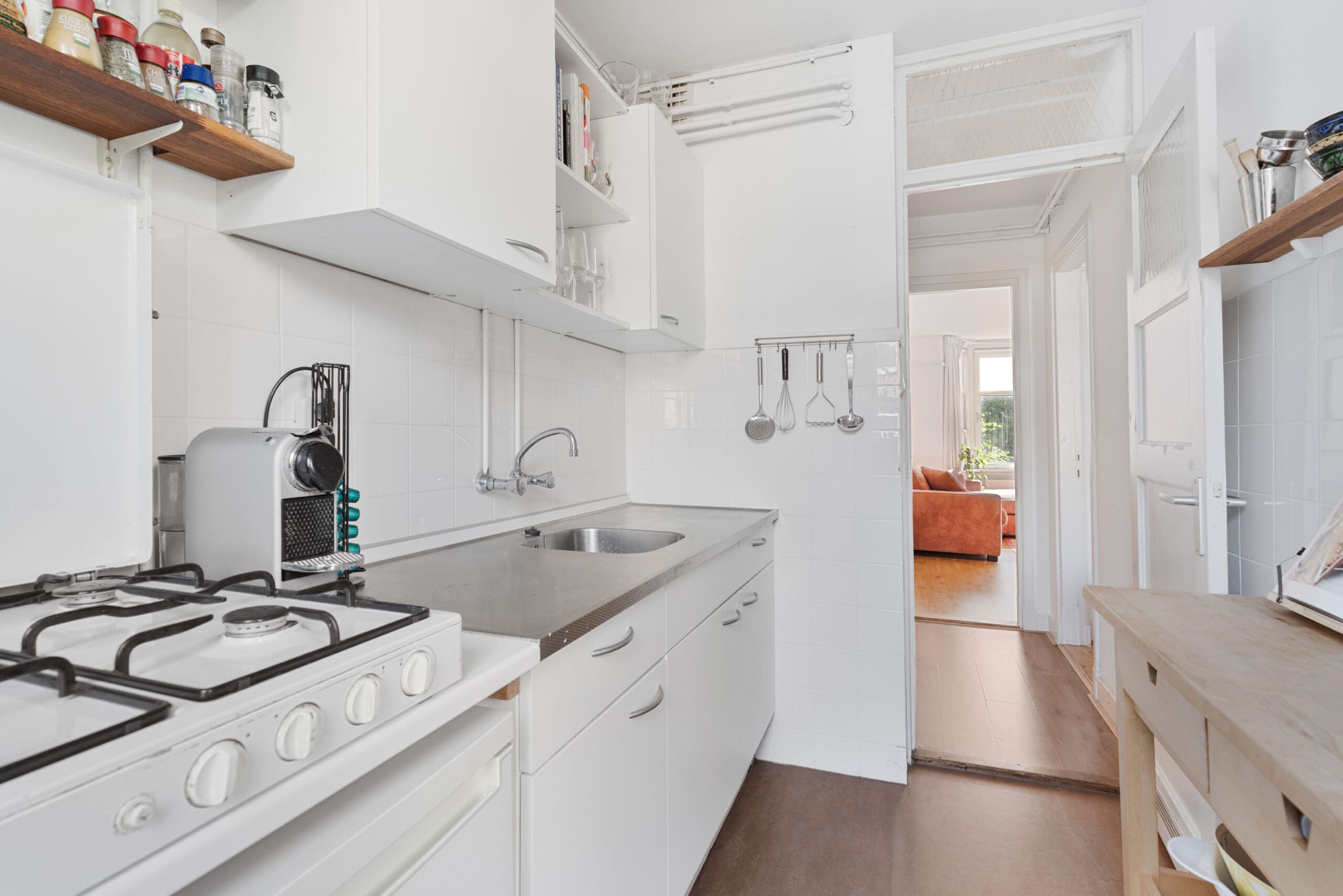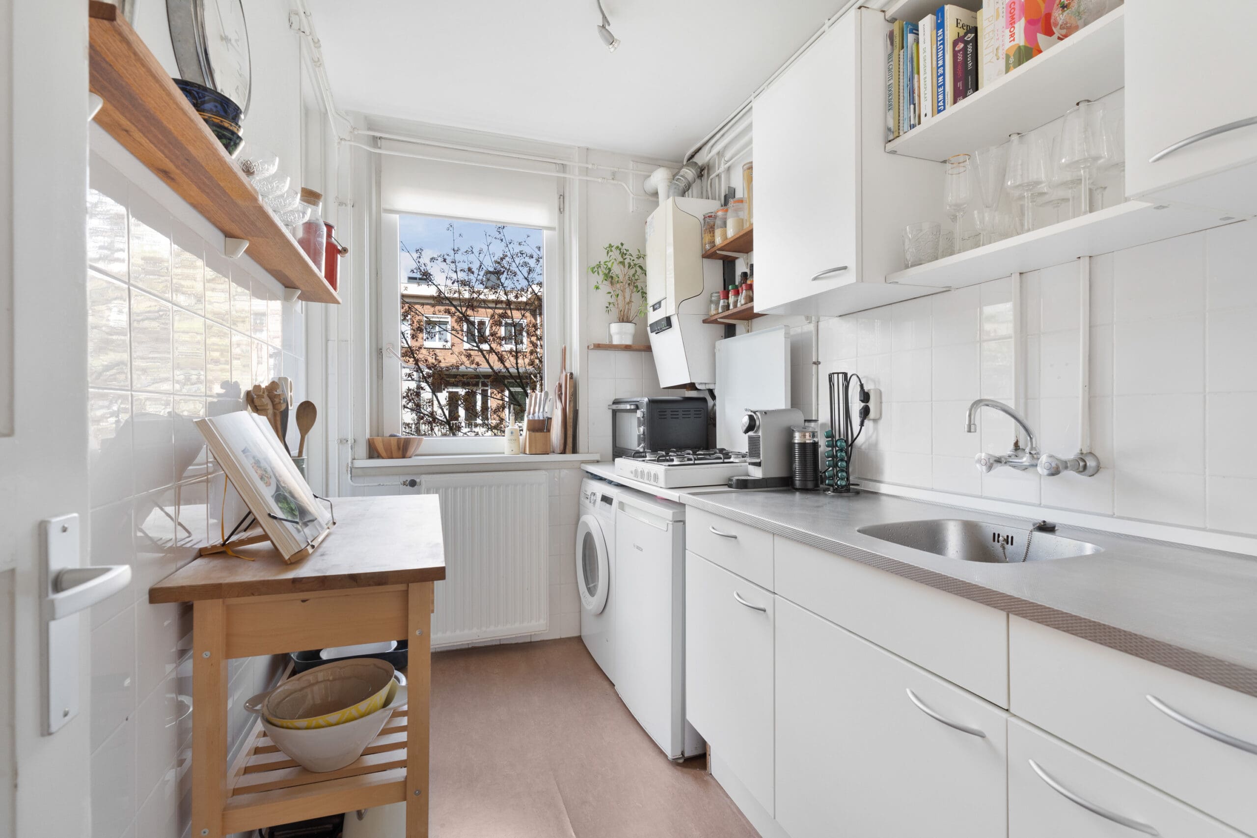 Naast de achterkamer ligt de keuken, voorzien van een keukenblok en eveneens toegang tot het balkon. De slaapkamer bevindt zich aan de achterzijde en beschikt ook over een handige inbouwkast.