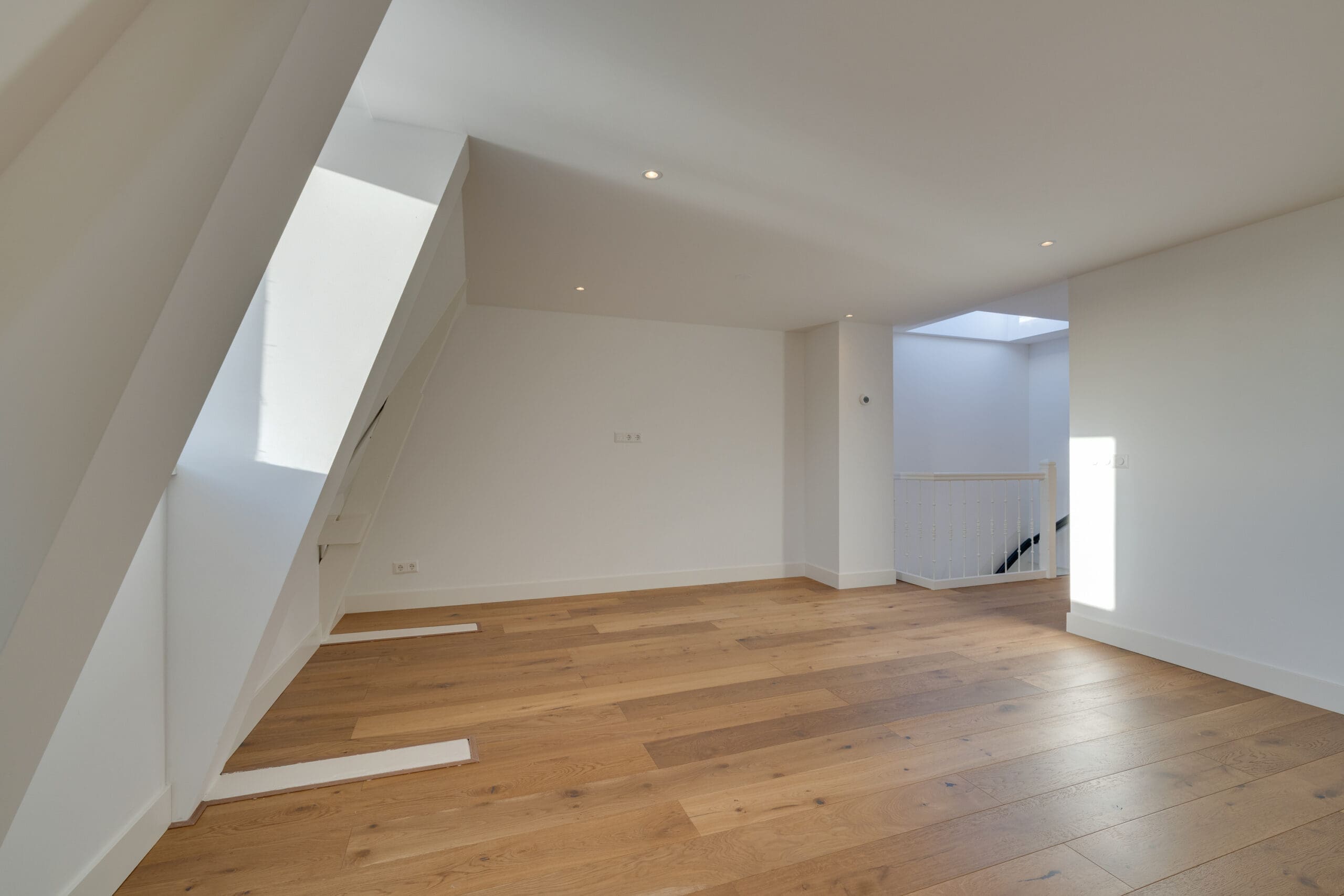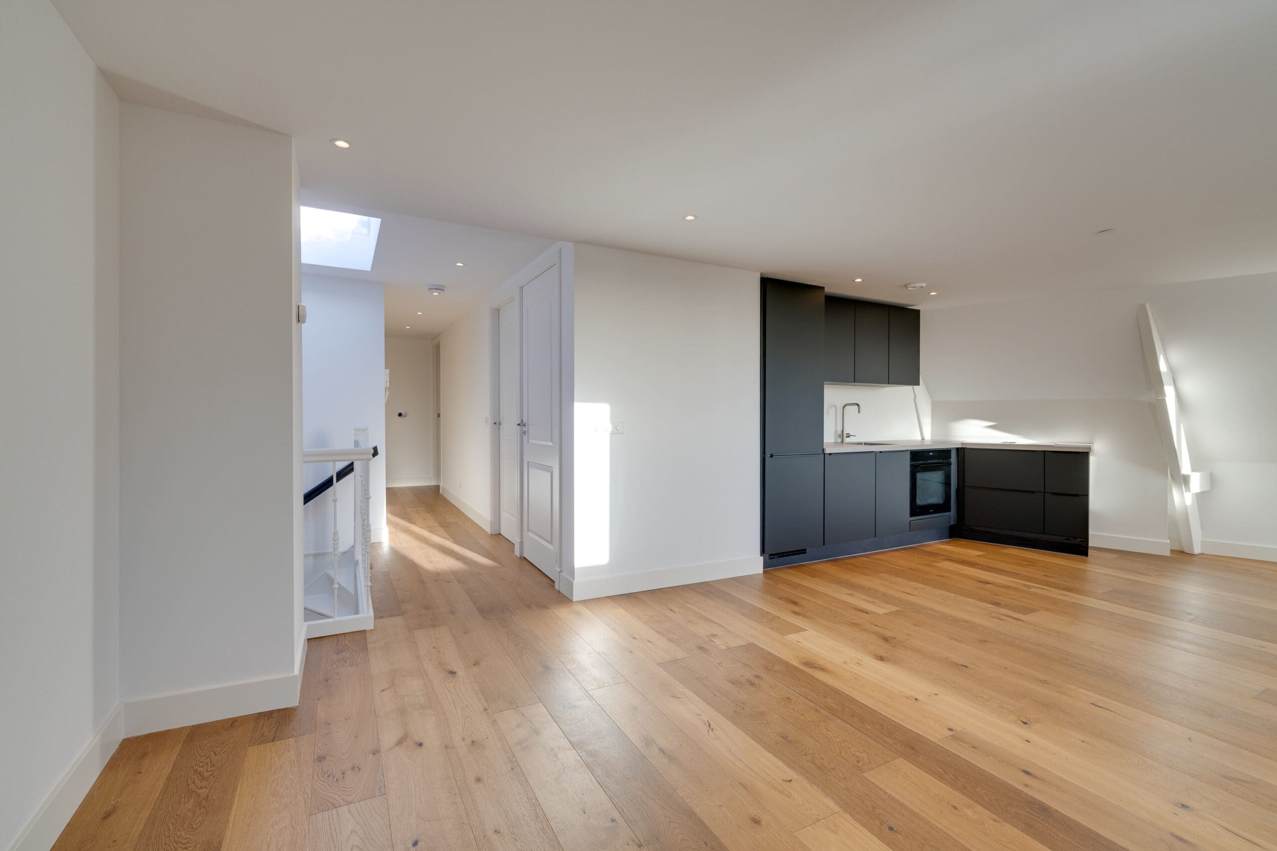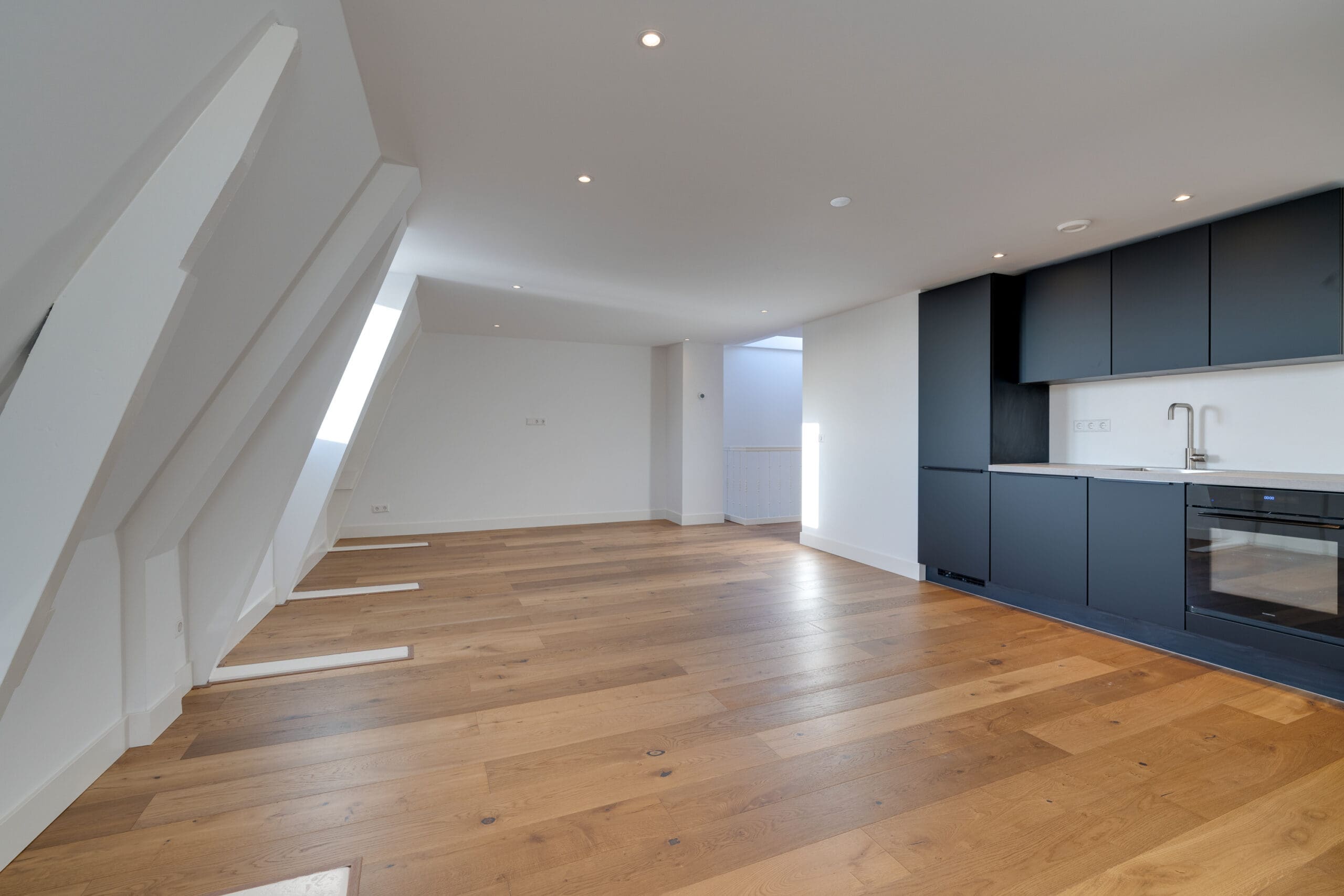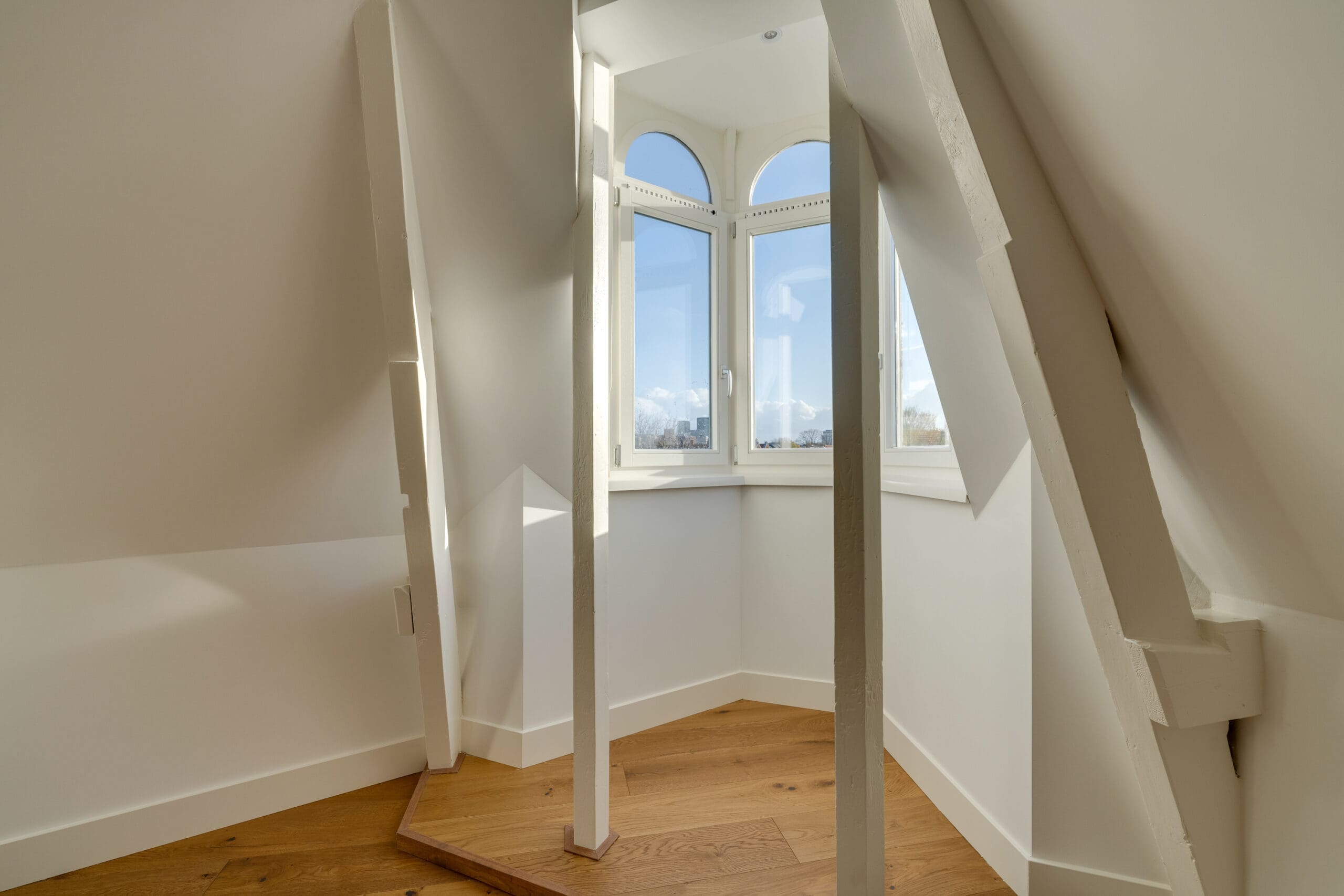 Upon entering, the hallway is generously illuminated by a large skylight. Adjacent you find the spacious living room with characteristic support beams and a unique corner turret offering beautiful views over the Nassaukade and the Eerste Marnixplantsoen. The living room also includes the modern open kitchen, equipped with a refrigerator, freezer, dishwasher, combi-oven, and induction cooktop with integrated extraction system.