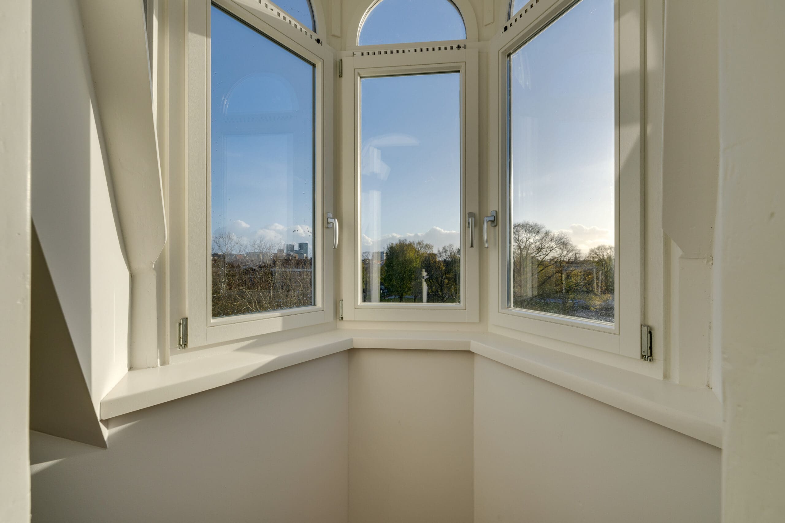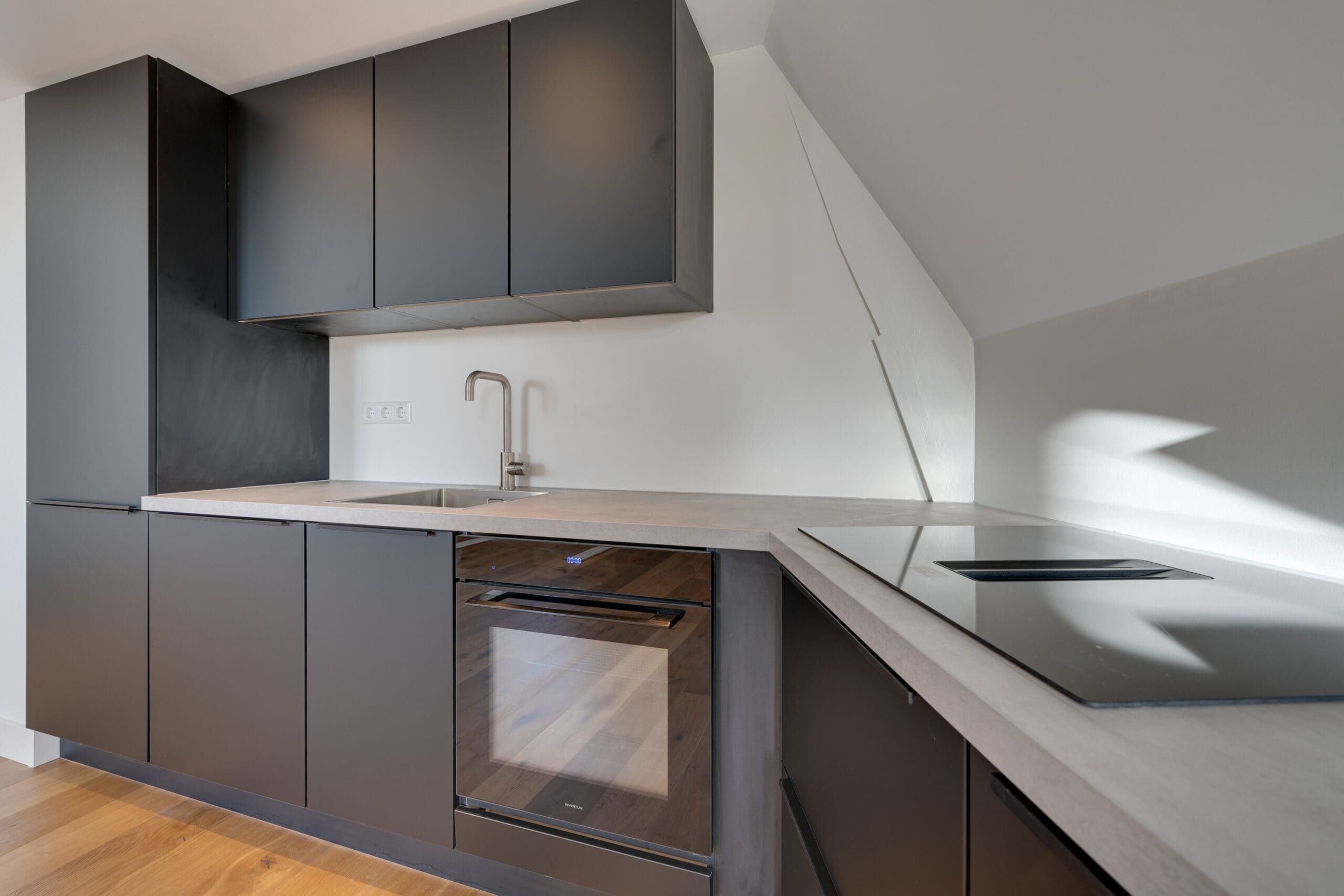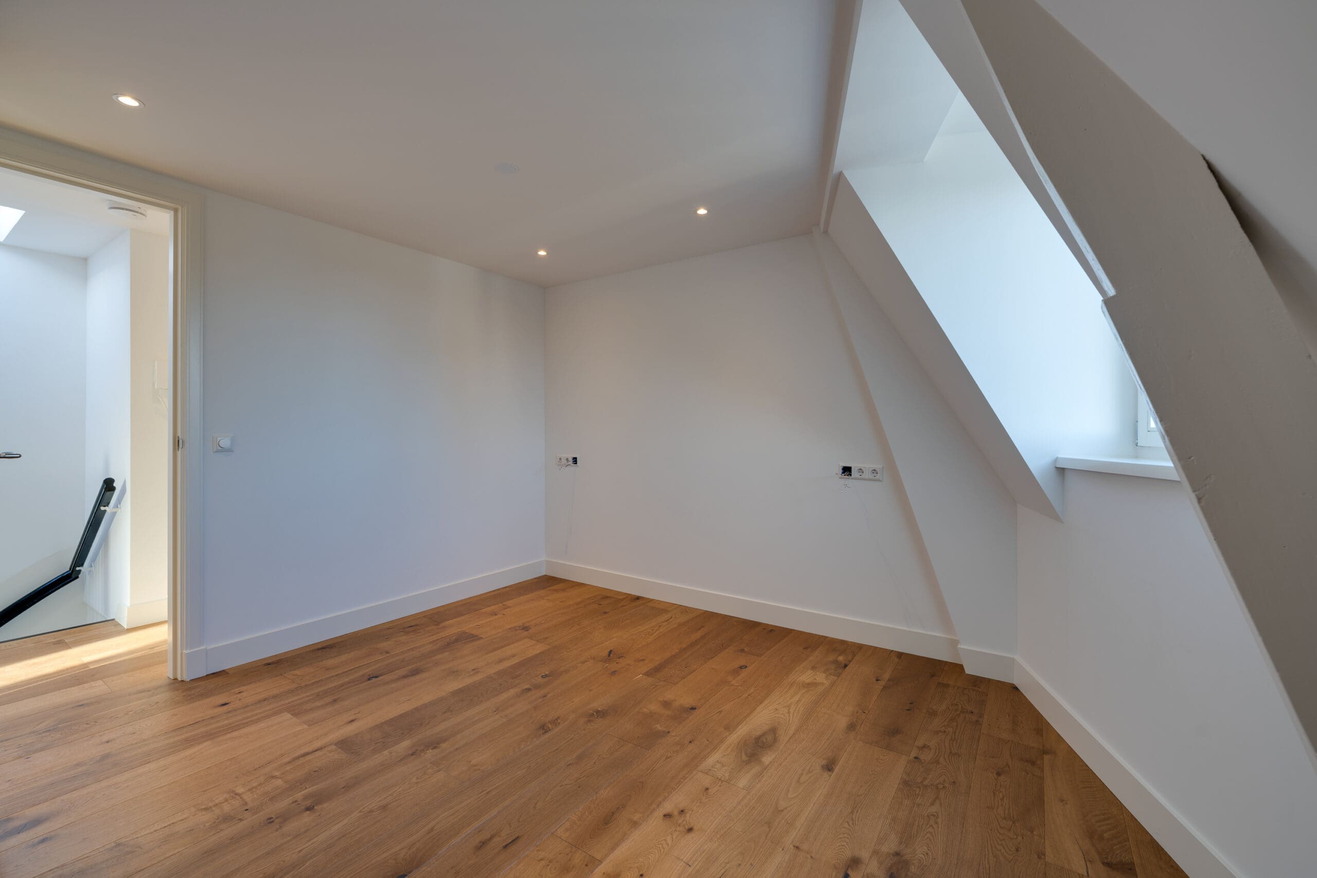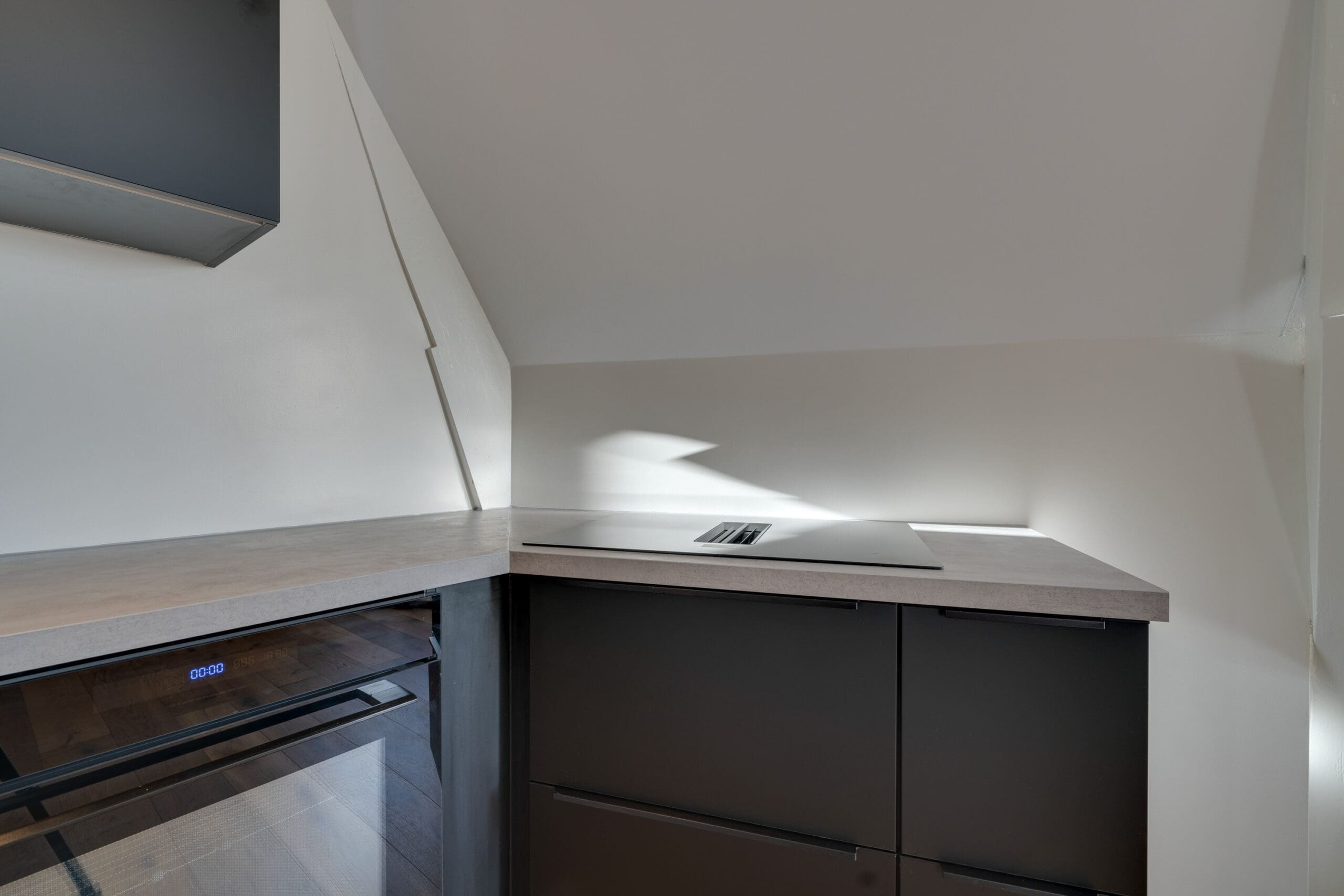 Upon entering, the hallway is generously illuminated by a large skylight. Adjacent you find the spacious living room with characteristic support beams and a unique corner turret offering beautiful views over the Nassaukade and the Eerste Marnixplantsoen. The living room also includes the modern open kitchen, equipped with a refrigerator, freezer, dishwasher, combi-oven, and induction cooktop with integrated extraction system.