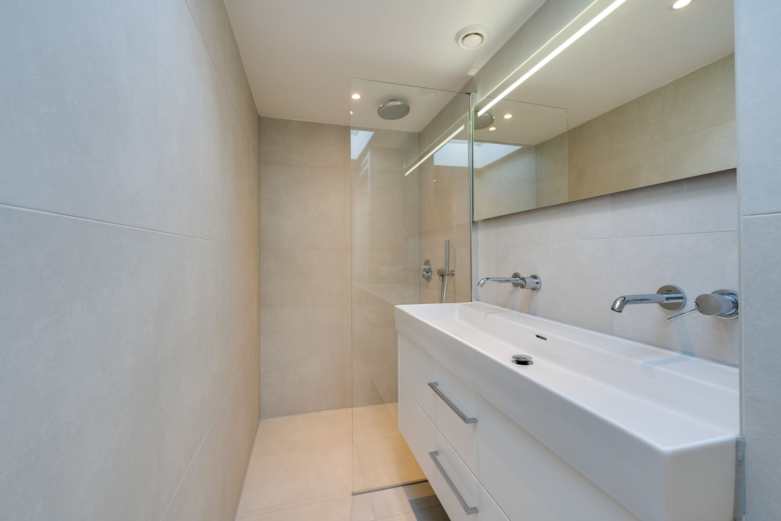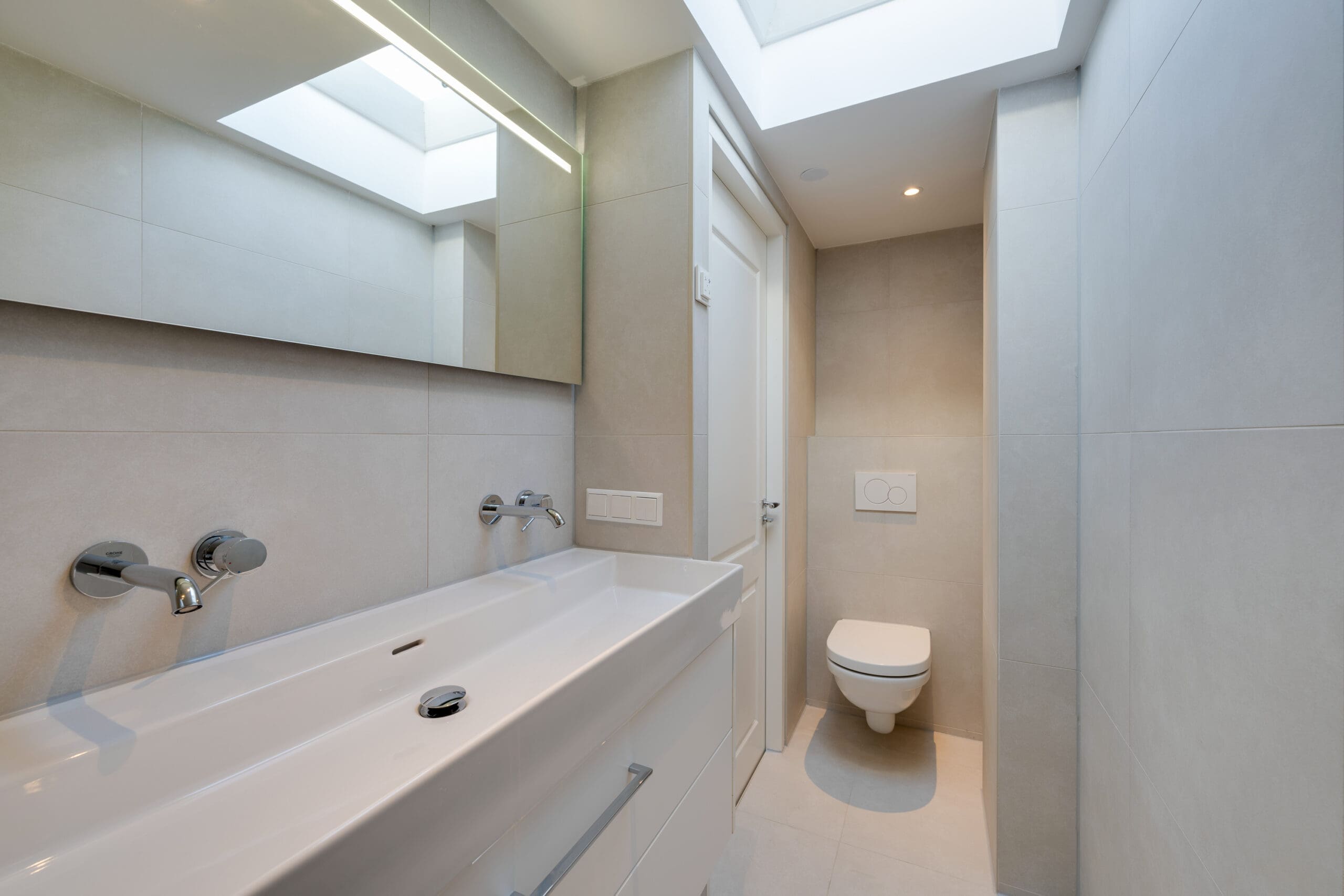 Aan de achterzijde van het appartement liggen de twee royale slaapkamers en de luxe badkamer, uitgevoerd met een inloopdouche, dubbele wastafel met -meubel en verlichte wandspiegel en toilet. In de hal bevindt zich een tweede separaat toilet, evenals een aparte ruimte voor de wasmachine en/of droger.