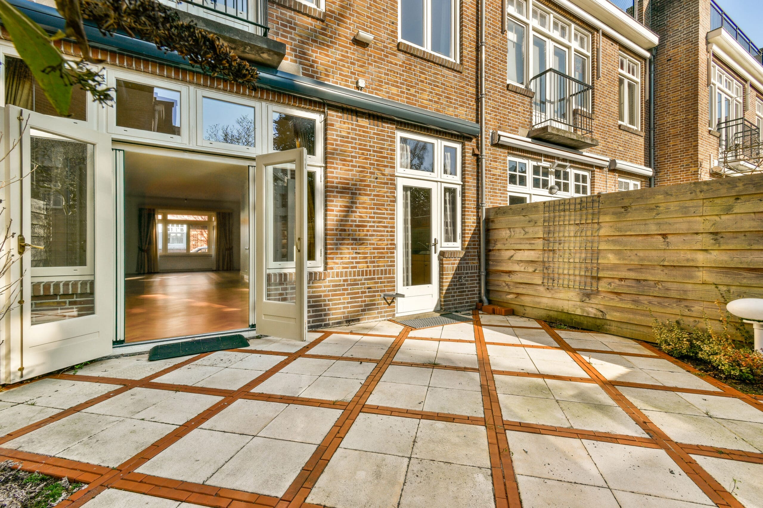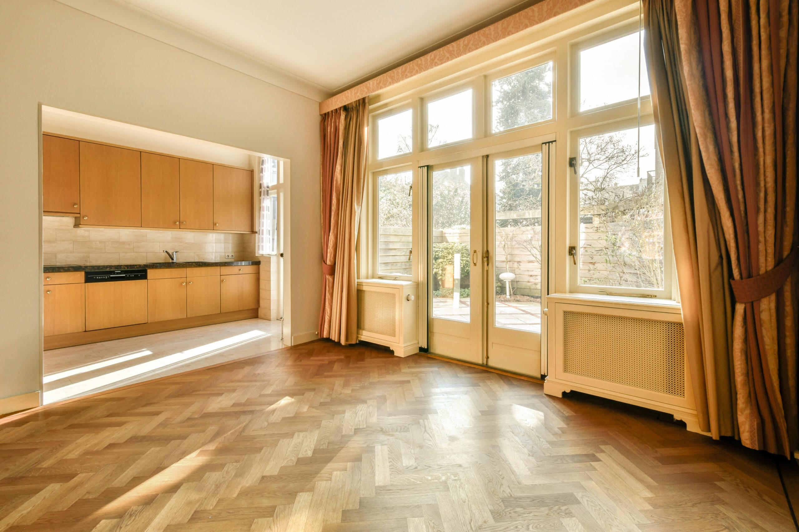 Via the impressive entrance with authentic marble tiles you reach the spacious hall. This hall, equipped with a vestibule, toilet and fixed staircase to the upper floor, provides access to the living room. The living room exudes space and light thanks to the impressive ceiling height of over 3 meters and the beautiful herringbone oak floor. The open kitchen connects seamlessly to the living space and offers plenty of possibilities for modernization according to your own wishes. The French doors give access to the sunny garden of approximately 34 m², ideal for long summer evenings with a good dinner and a comfortable lounge area.