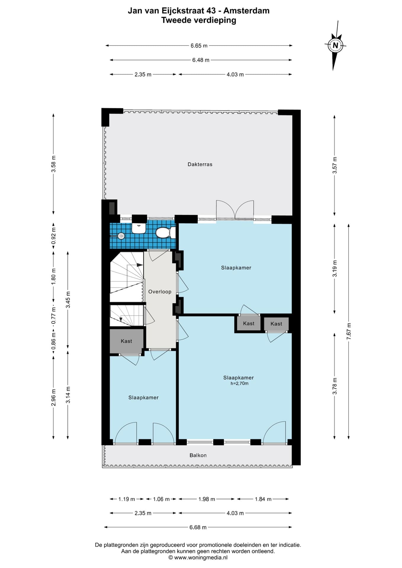 De tweede verdieping biedt drie slaapkamers van goed formaat, waarvan twee aan de voorzijde en één aan de achterzijde. Deze laatste slaapkamer heeft openslaande deuren naar het royale dakterras van circa 24m², gelegen op het zuiden. Daarnaast bevindt zich op deze verdieping een tweede badkamer met douche, wastafel en toilet.
