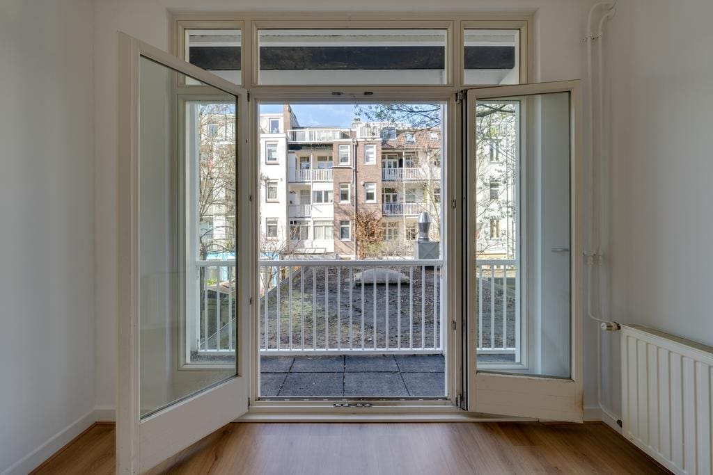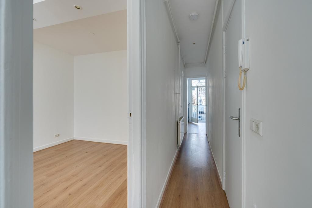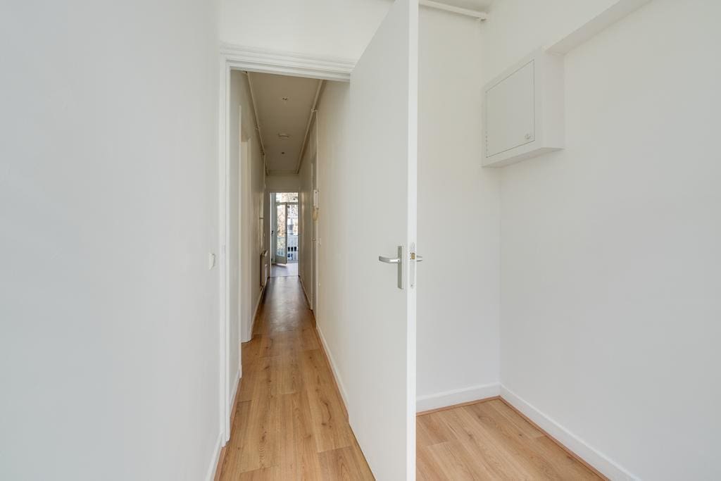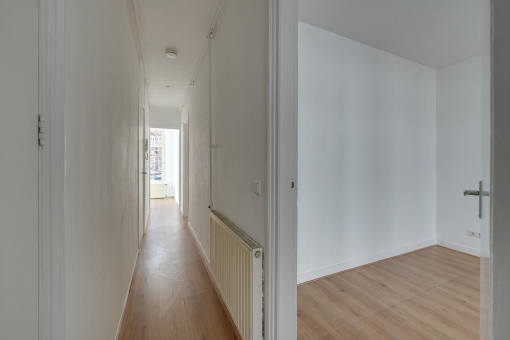 The hallway provides access to all rooms. At the front is the spacious, bright living room with recessed lighting, which, thanks to the large windows, allows plenty of natural light and offers a lovely view of Javastraat. Adjacent is the first (bed)room, which is ideal as a work or study room. In the center of the apartment is the bathroom with a shower and toilet, and at the rear of the apartment are the well sized second bedroom and the kitchen. Both rooms provide access to the balcony that stretches across the full width of the apartment.
