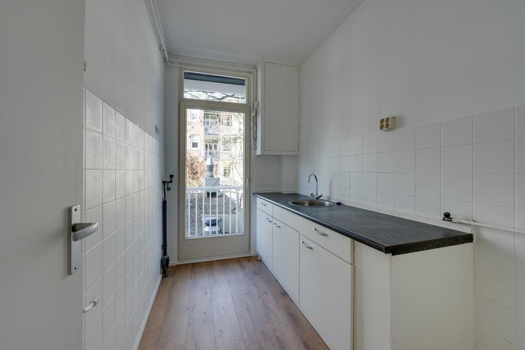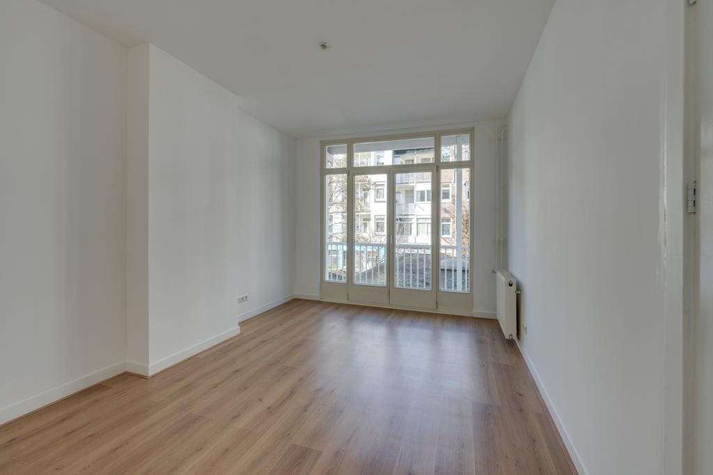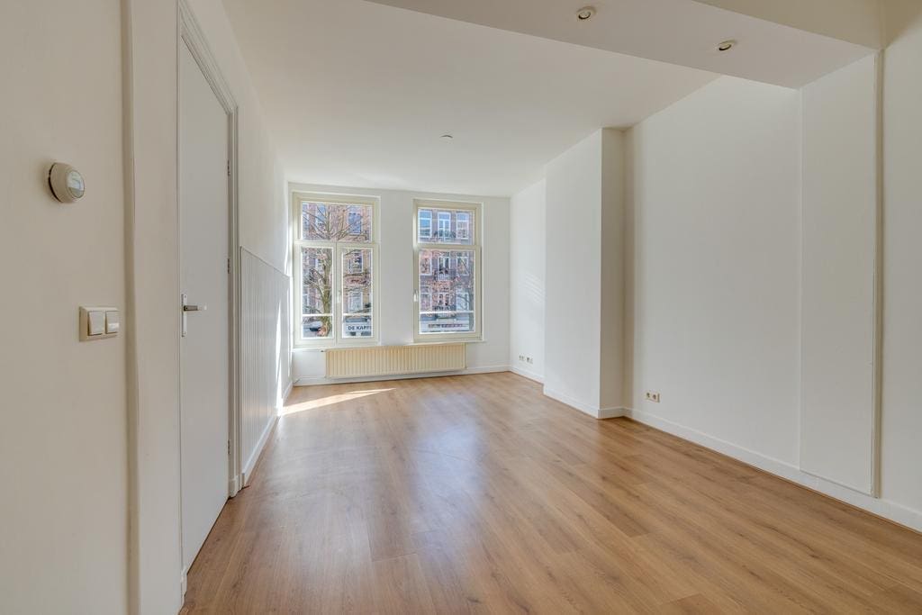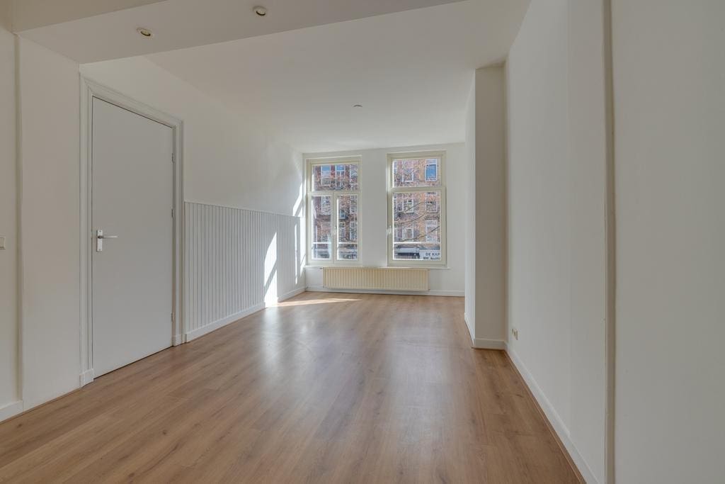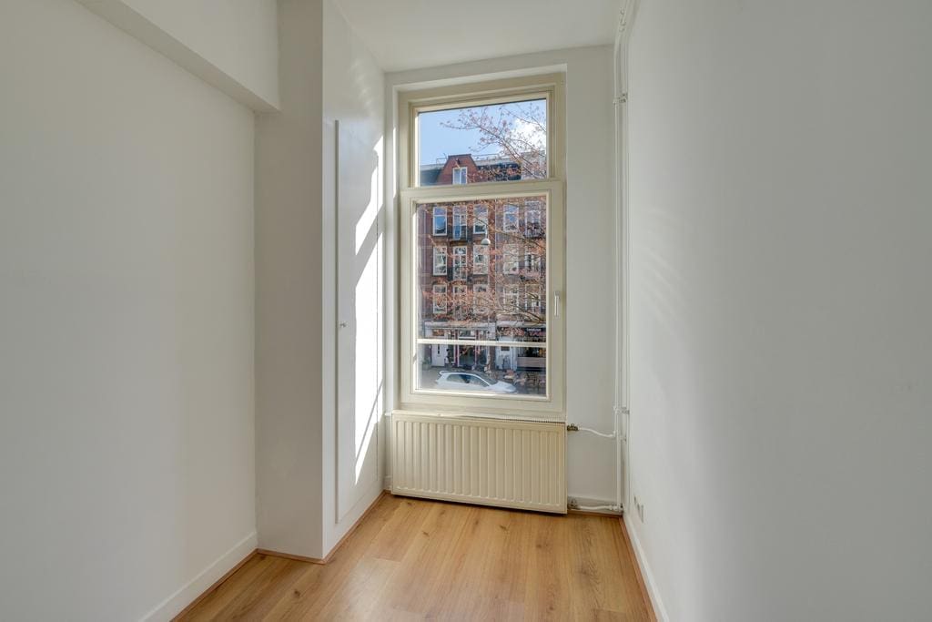 The hallway provides access to all rooms. At the front is the spacious, bright living room with recessed lighting, which, thanks to the large windows, allows plenty of natural light and offers a lovely view of Javastraat. Adjacent is the first (bed)room, which is ideal as a work or study room. In the center of the apartment is the bathroom with a shower and toilet, and at the rear of the apartment are the well sized second bedroom and the kitchen. Both rooms provide access to the balcony that stretches across the full width of the apartment.