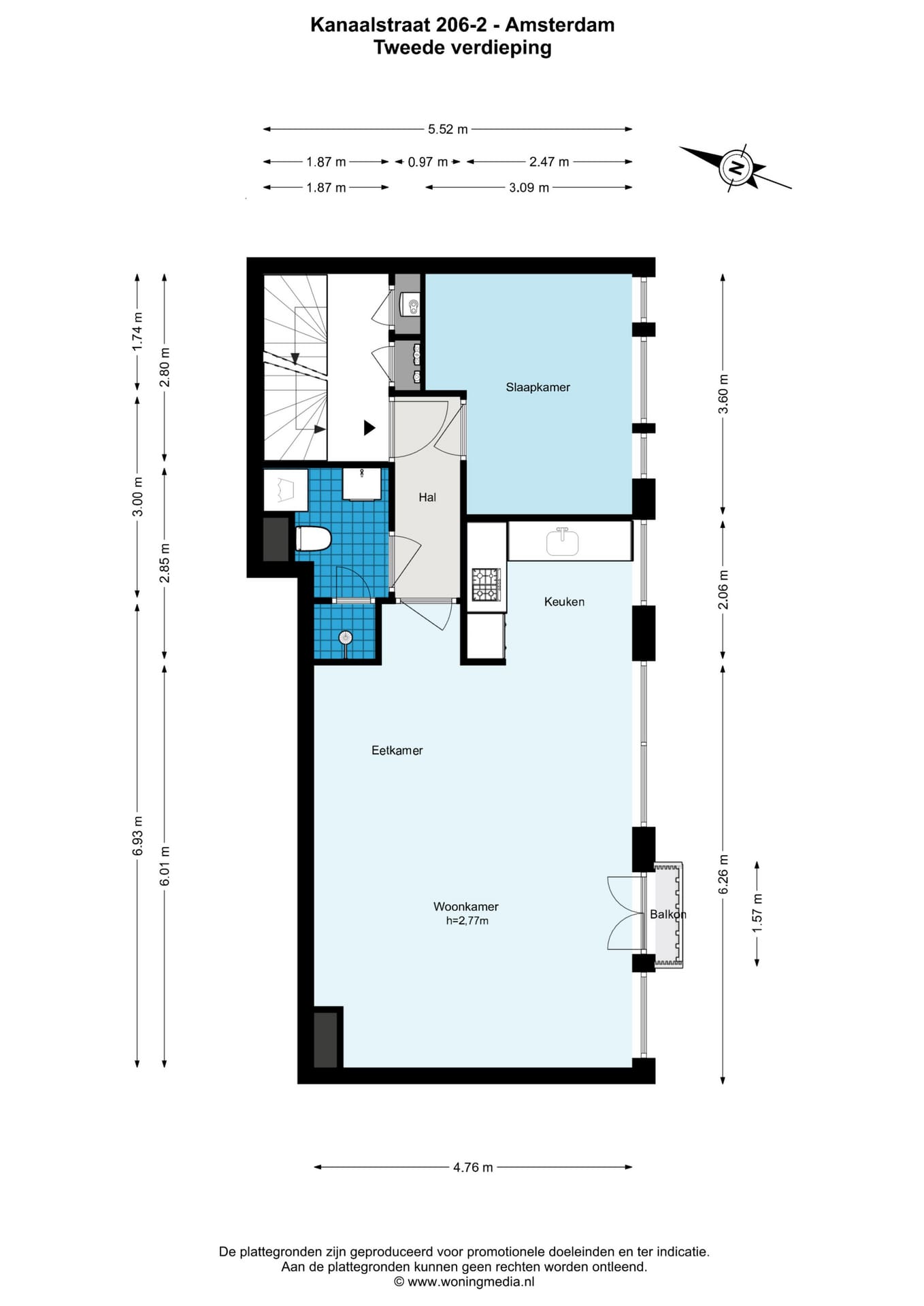 Entree, hal met toegang tot alle vertrekken. Dankzij de unieke indeling ligt het appartement volledig over de breedte van het pand. Grote raampartijen aan zowel de woon- als slaapkamerzijde zorgen voor veel lichtinval en een wijds uitzicht over de Kostverlorenvaart. De woonkamer beschikt over een open keuken, voorzien van diverse Siemens inbouwapparatuur, en biedt toegang tot een Frans balkon op het zuiden. Hierdoor is het mogelijk om al vroeg in het voorjaar, uit de wind, van de zon en het vrije uitzicht te genieten. De slaapkamer is eveneens aan de voorzijde gelegen. De badkamer is voorzien van een inloopdouche, zwevend toilet, wastafel met meubel, designradiator en aansluiting voor wasmachine en/of droger.