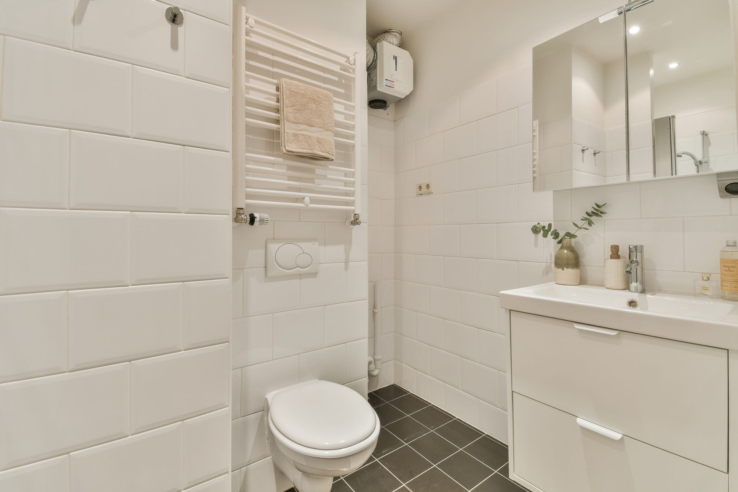 Entrance hall with access to all rooms. Thanks to its unique layout, the apartment spans the entire width of the building. Large windows at both the living room and bedroom sides provide plenty of natural light and wide views over the Kostverlorenvaart canal. The living room features an open kitchen equipped with various Siemens built-in appliances and offers access to the south-facing French balcony. This allows you to enjoy the sun and open views early in the spring, sheltered from the wind. The bedroom is also located at the front. The bathroom includes a walk-in shower, wall-mounted toilet, washbasin with vanity unit, designer radiator, and connections for a washing machine and/or dryer.
