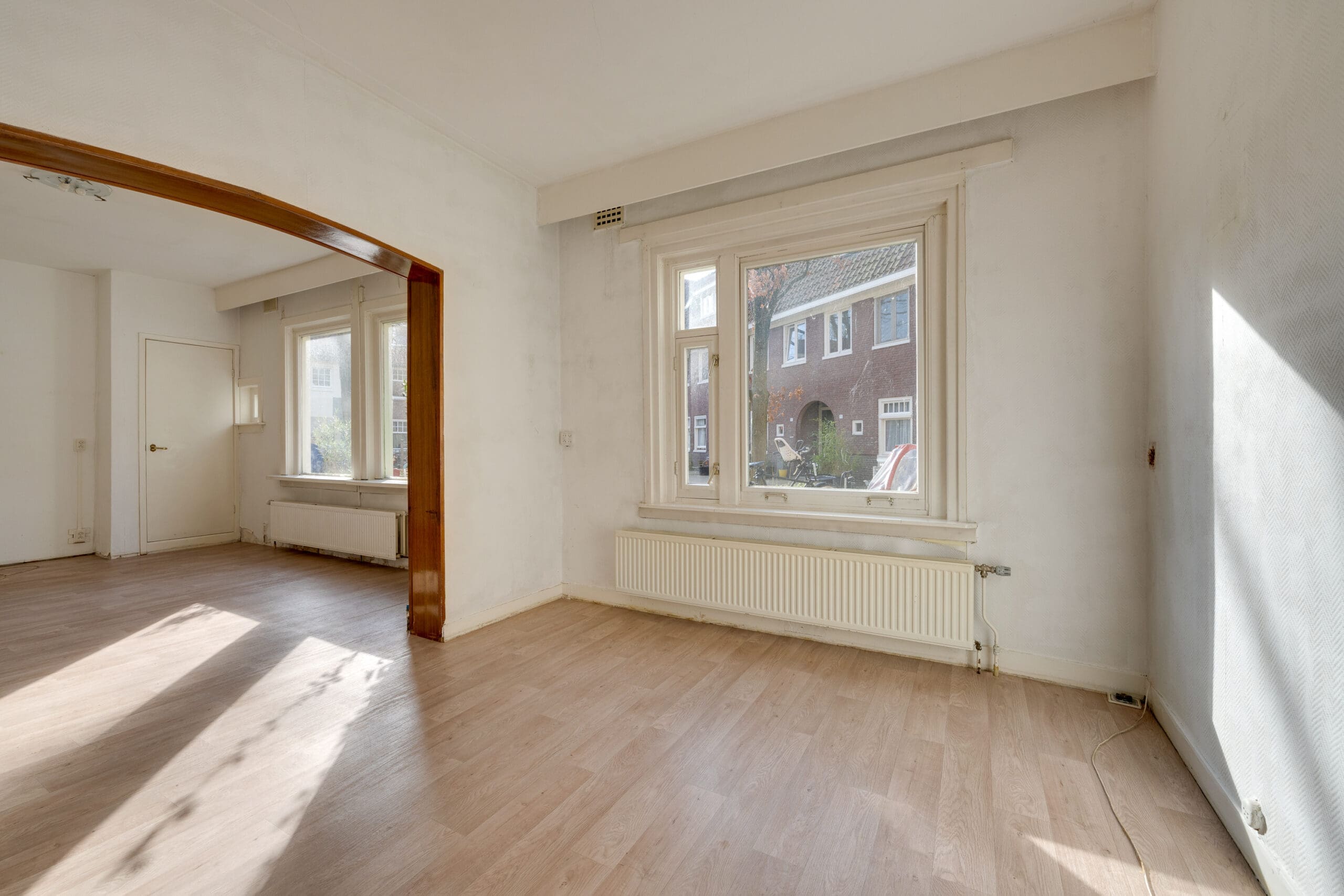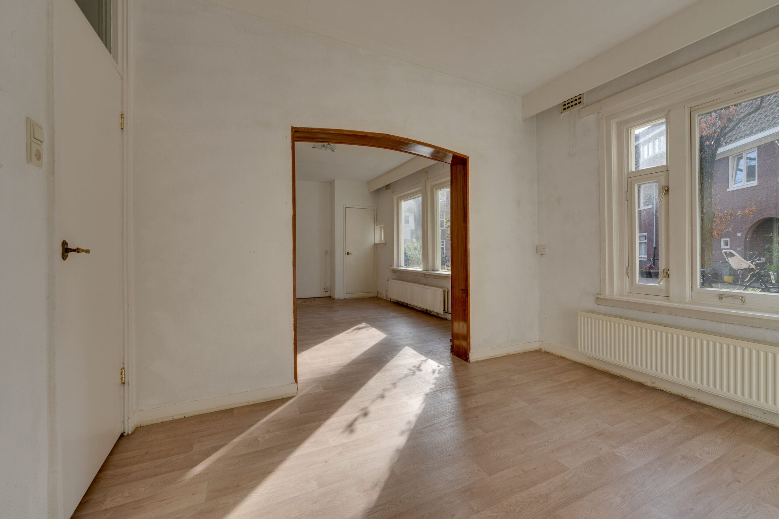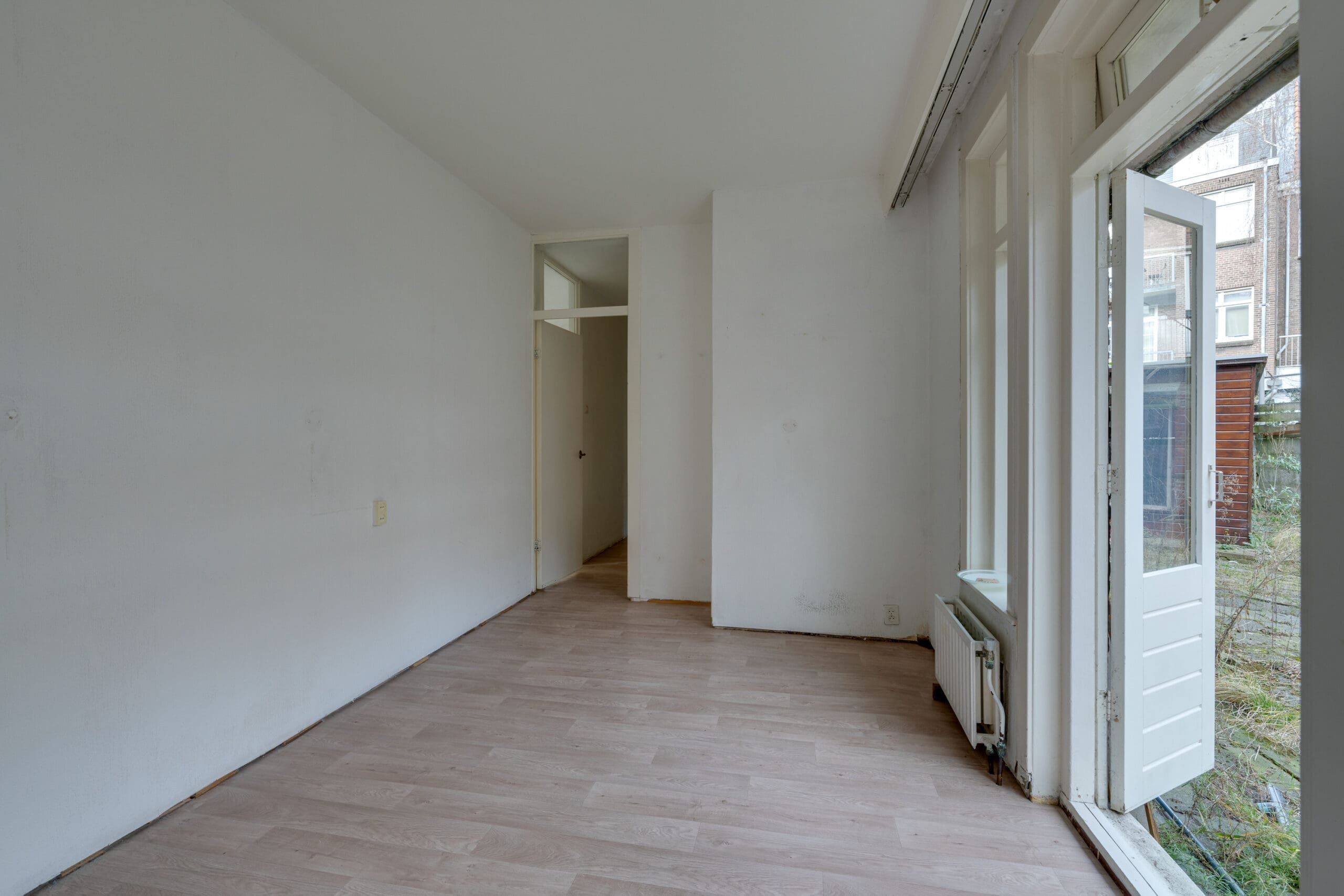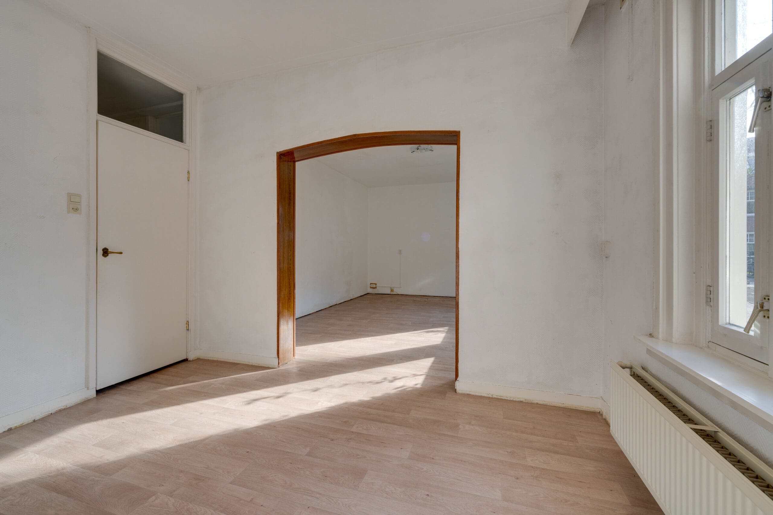 Entrance in the hall with the meter cupboard, from which the corridor gives access to all rooms in the apartment. At the front is the spacious and bright living room with en suite dining room. With a view of the cozy courtyard, this is a perfect space to relax and create cozy living room.