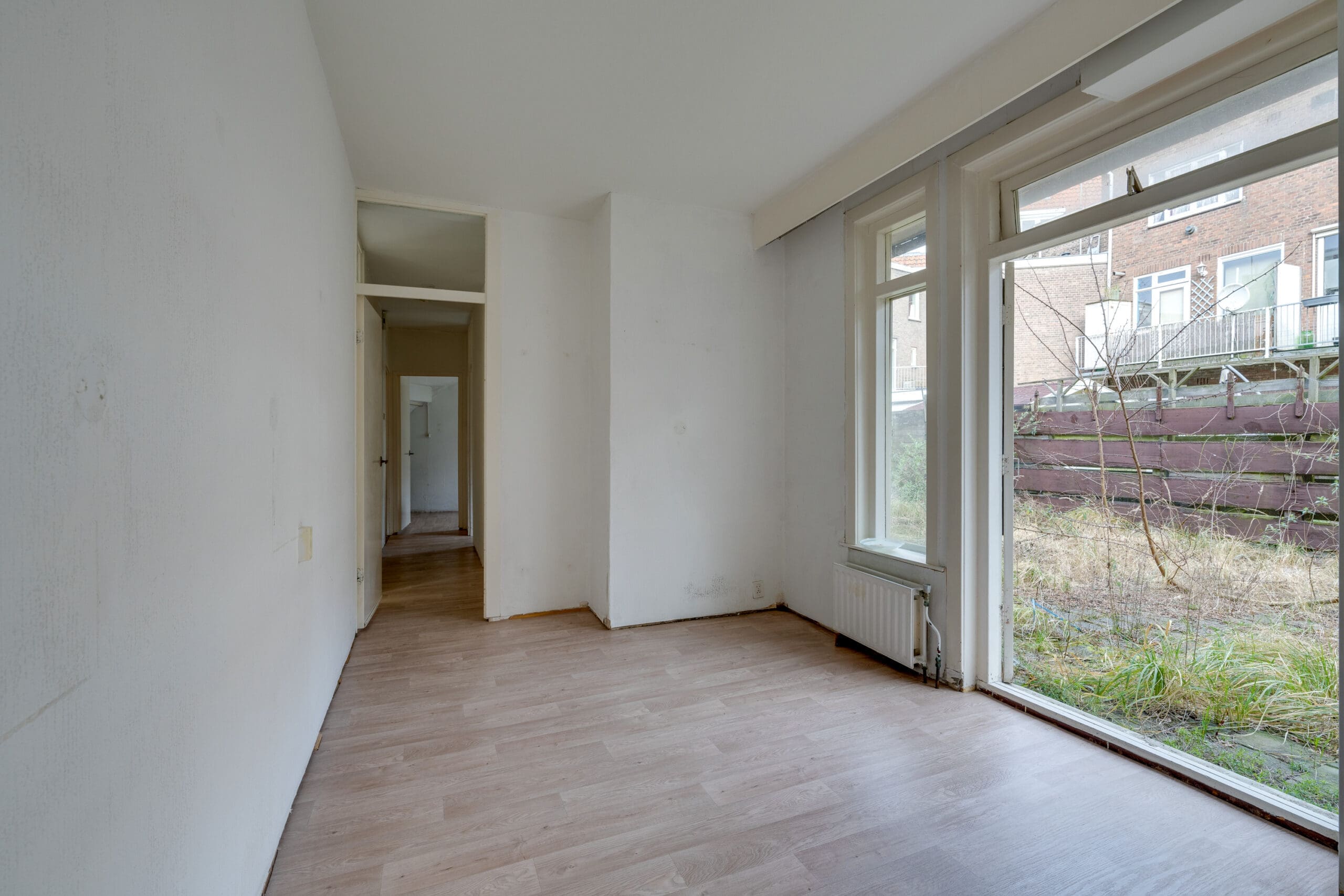 Binnenkomst in hal met de meterkast, van waaruit de gang toegang geeft tot alle vertrekken in het appartement. Aan de voorzijde ligt de ruime en lichte woonkamer met een en suite eetkamer. Met zicht op het gezellige hofje is dit een perfecte ruimte om te ontspannen en gezellige living te creëren.