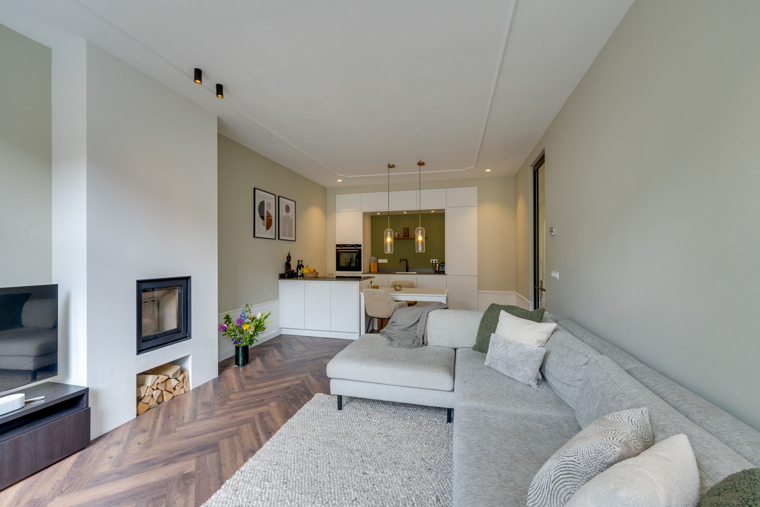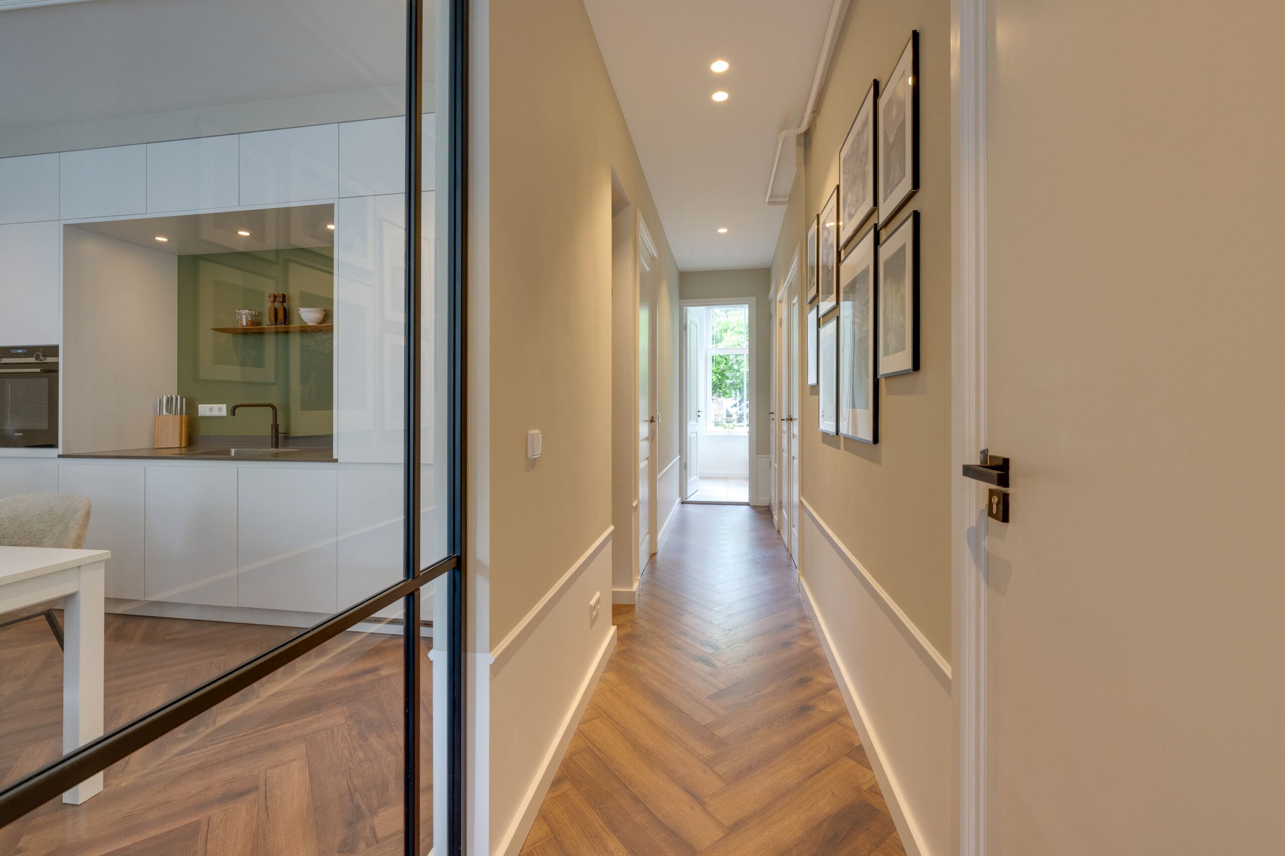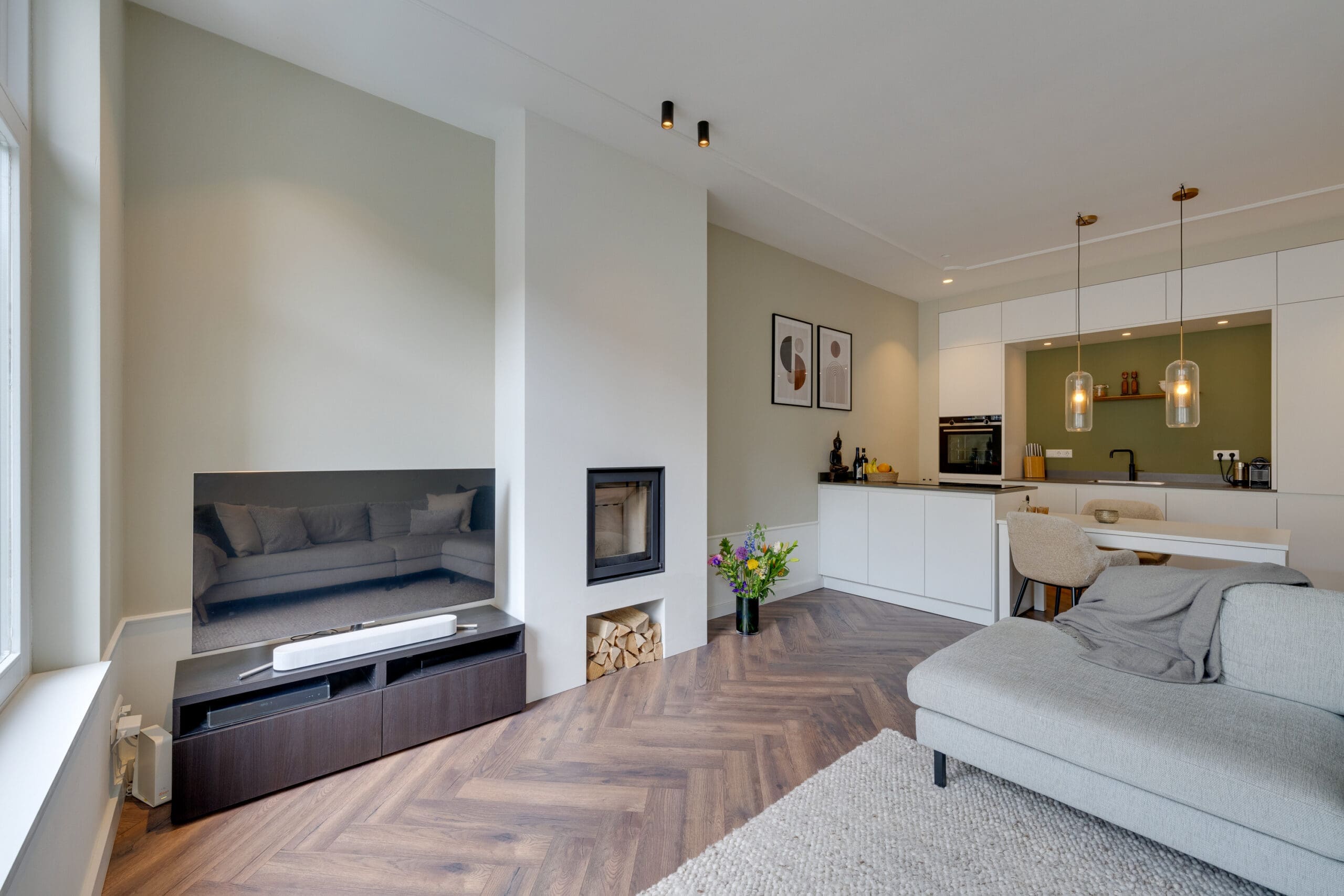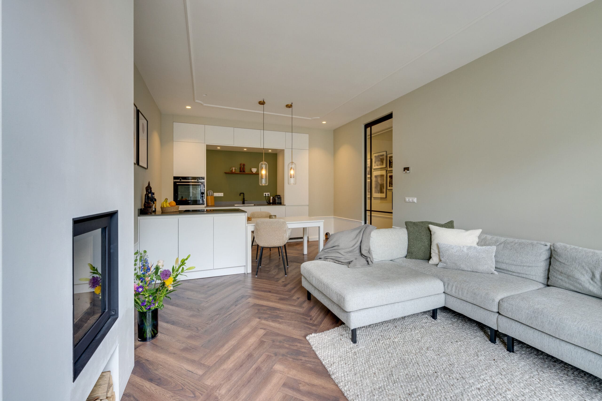 Een mooie visgraat laminaatvloer met vloerverwarming ligt door het gehele appartement.
