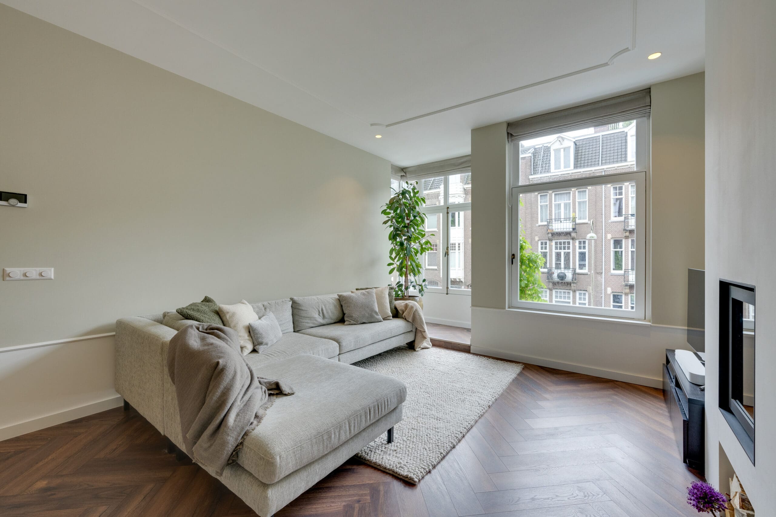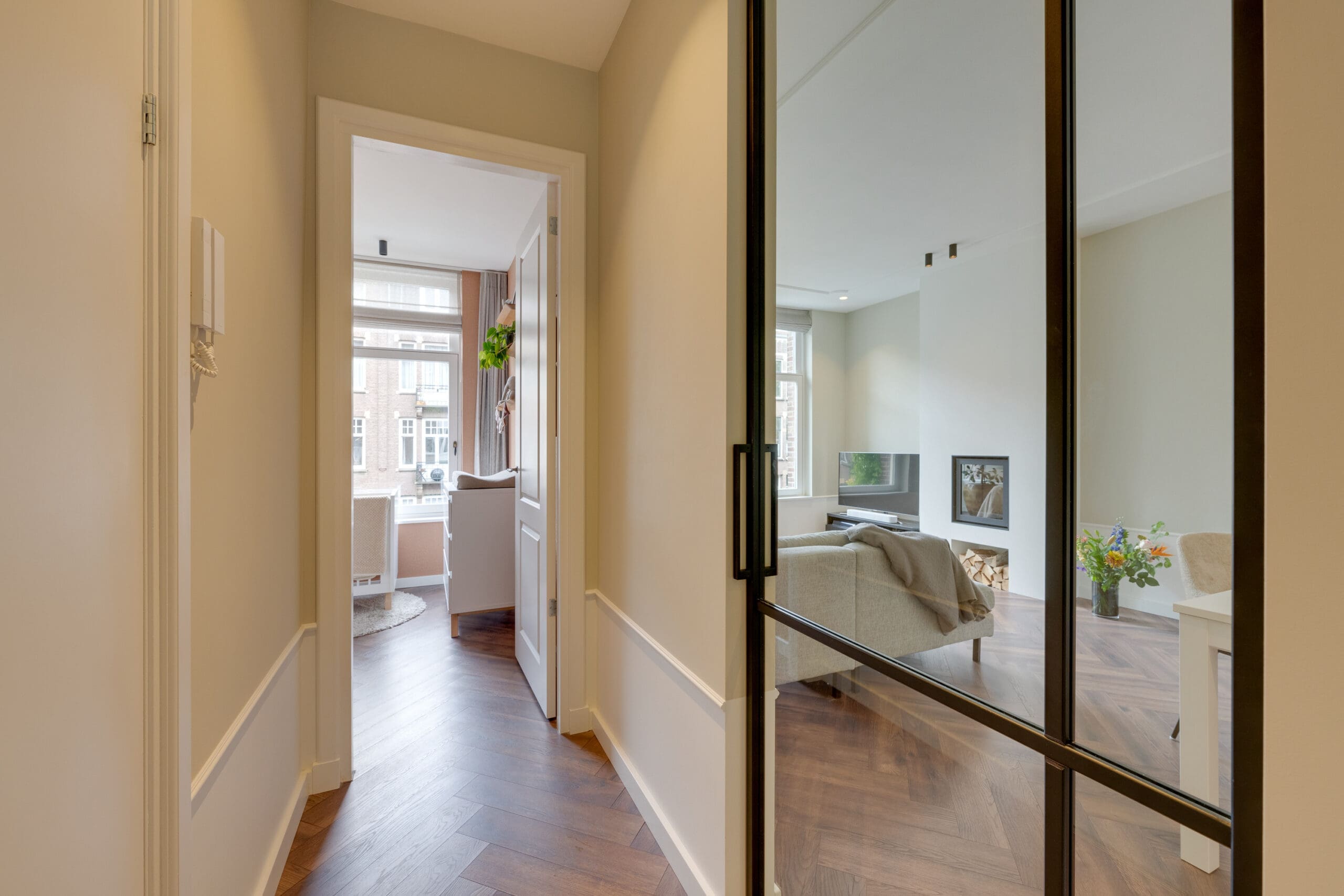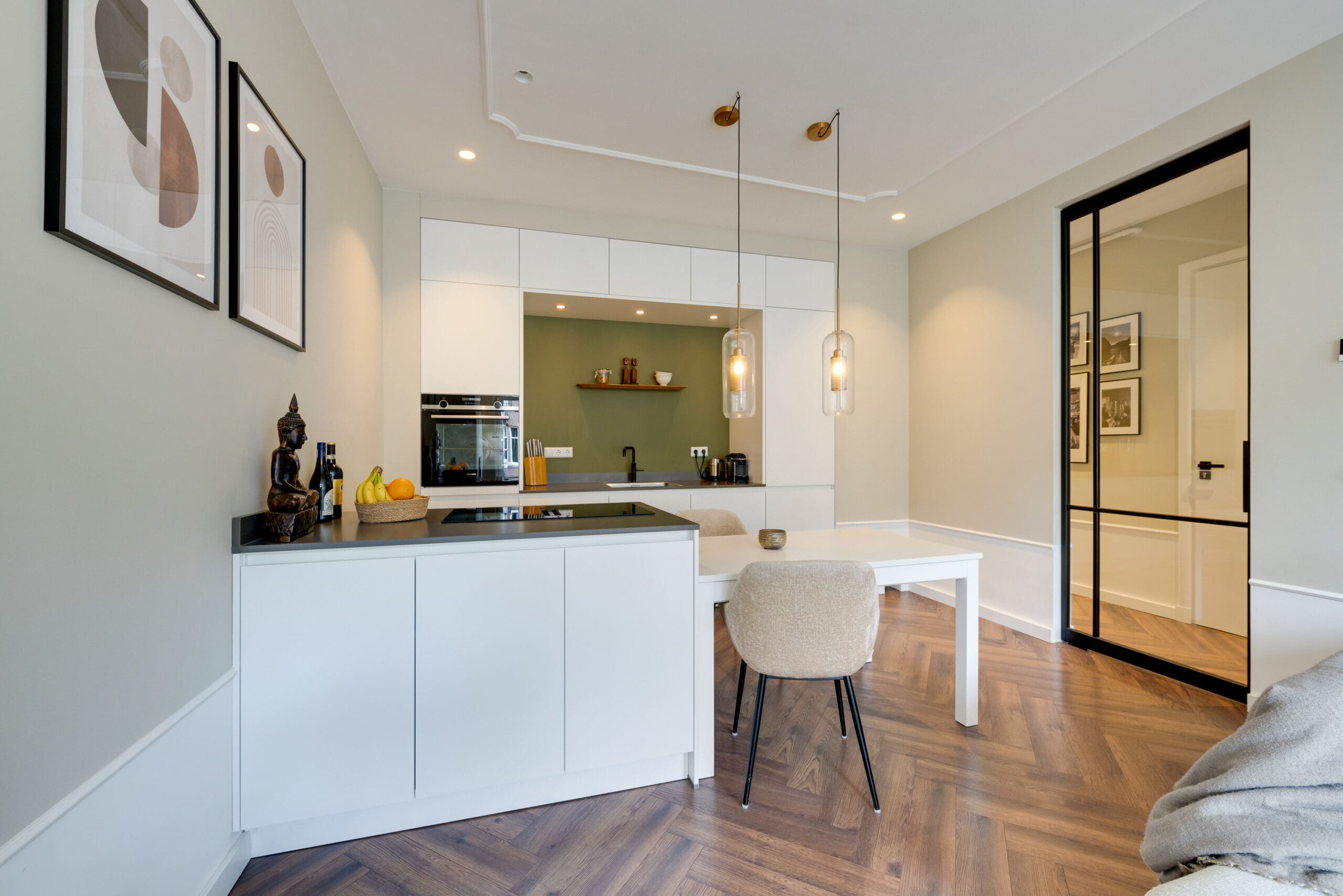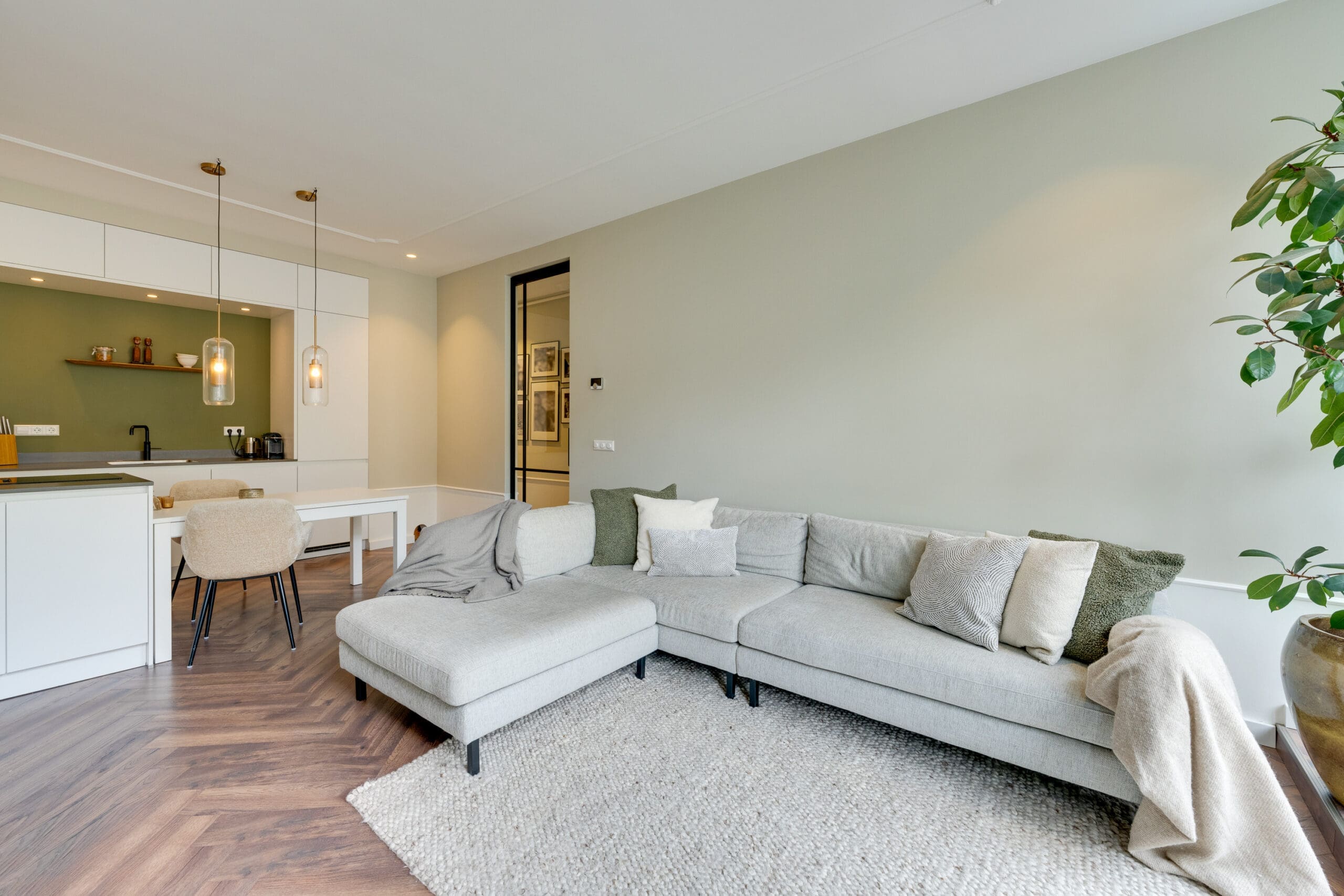 Een mooie visgraat laminaatvloer met vloerverwarming ligt door het gehele appartement.