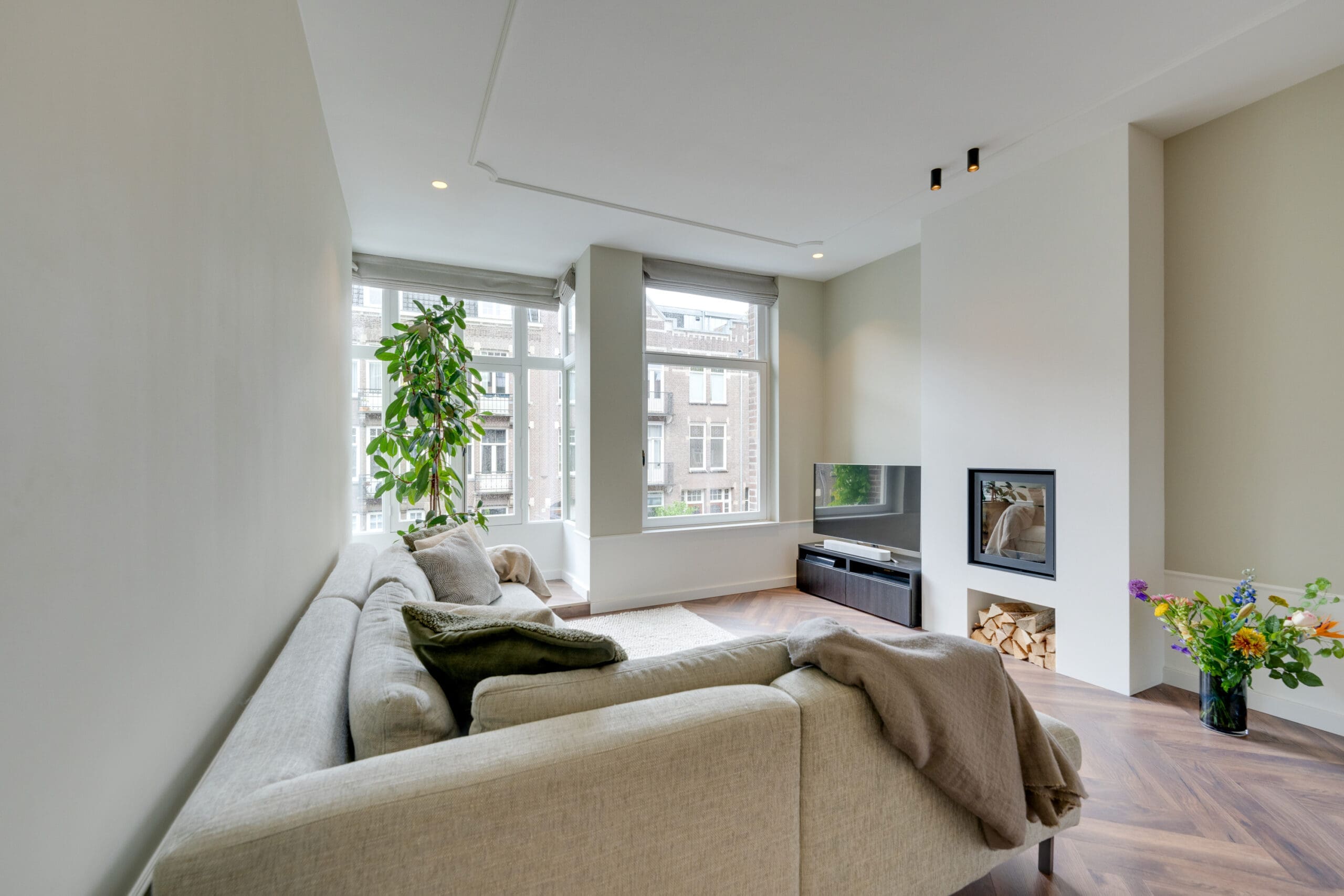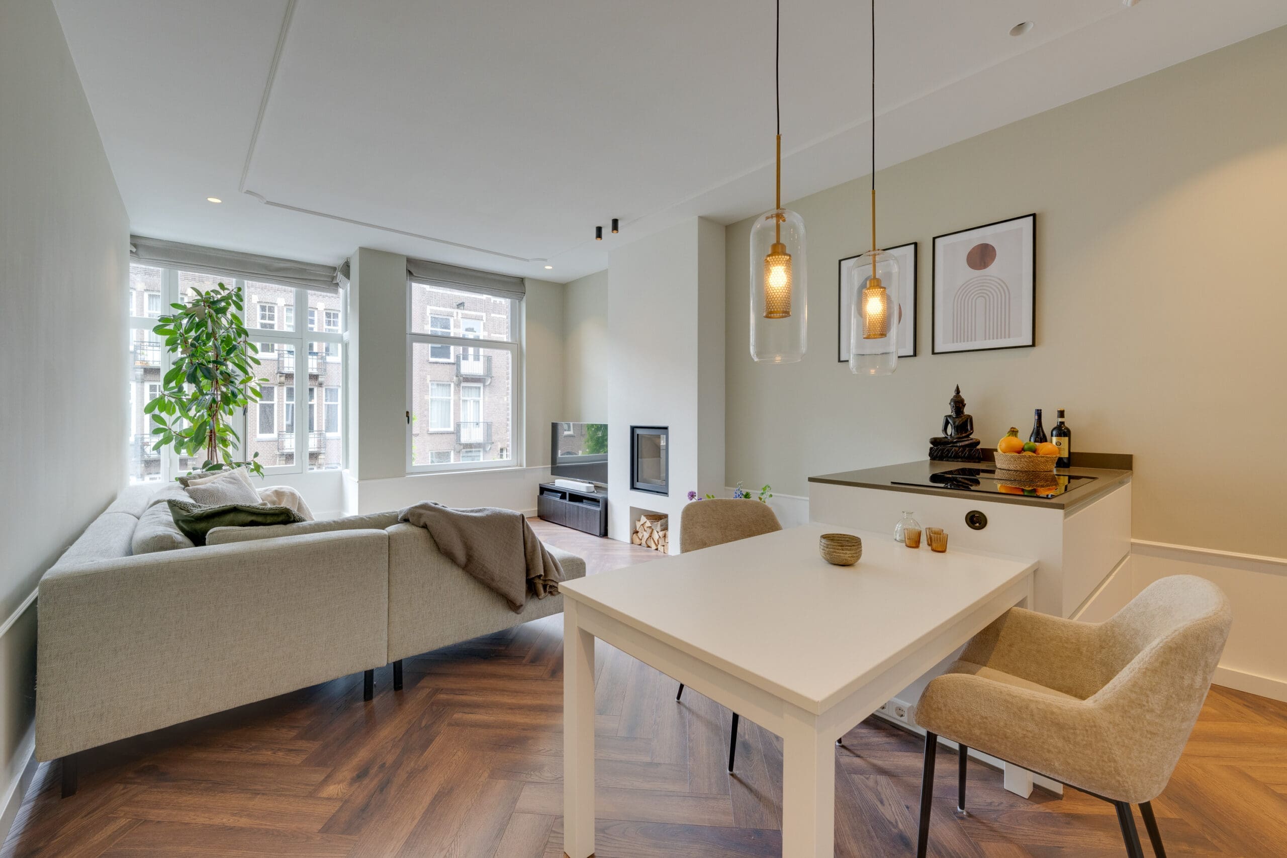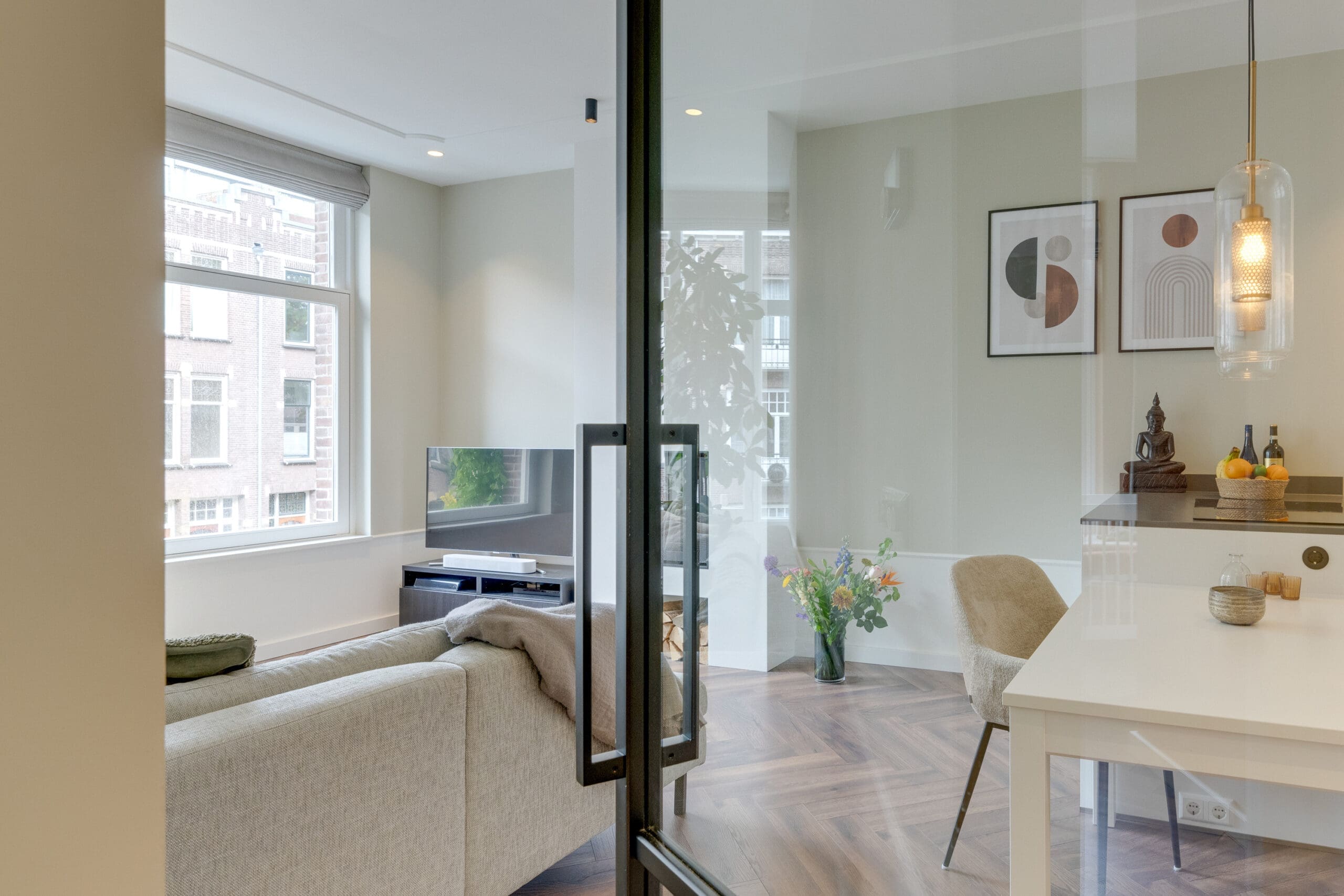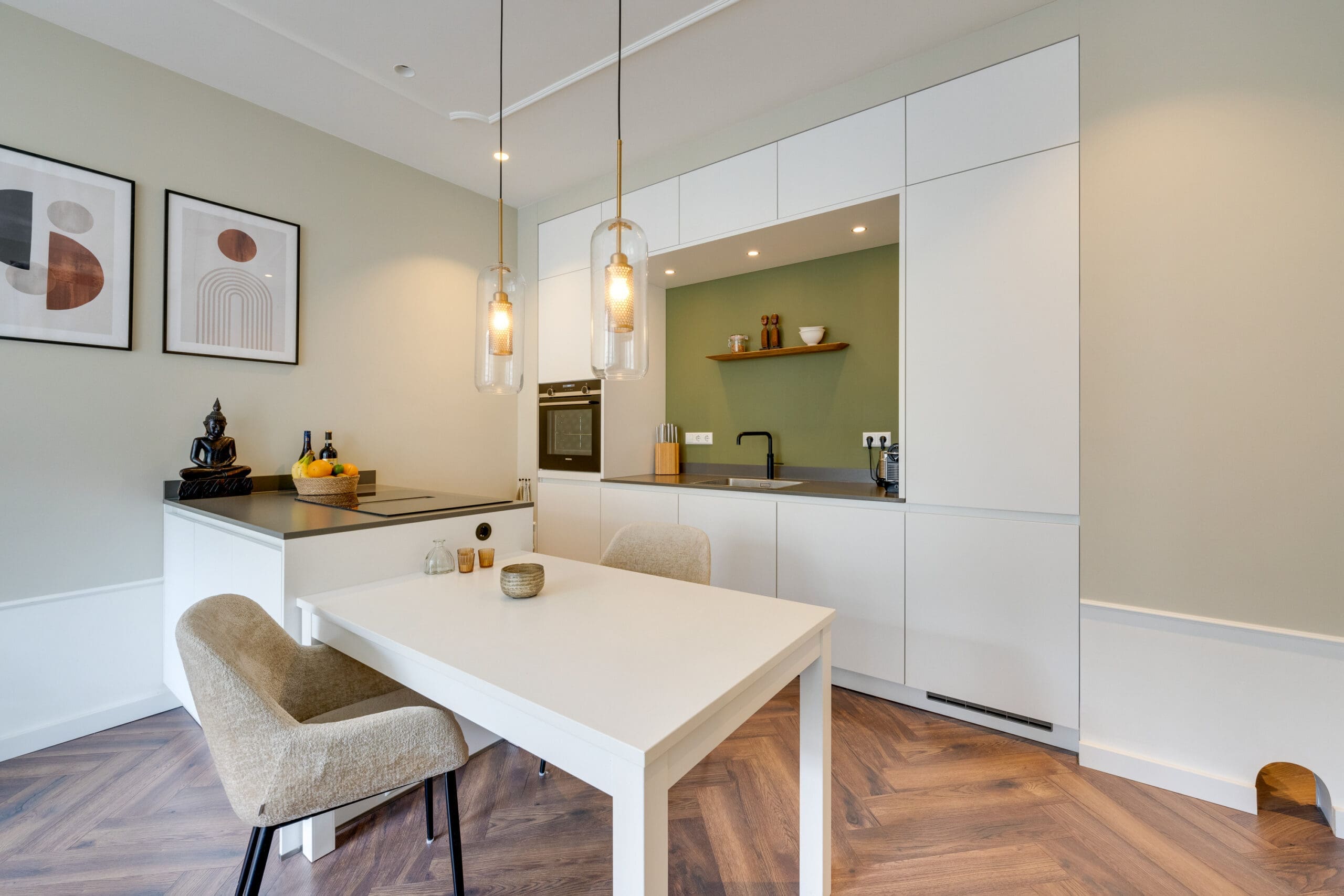 Een mooie visgraat laminaatvloer met vloerverwarming ligt door het gehele appartement.