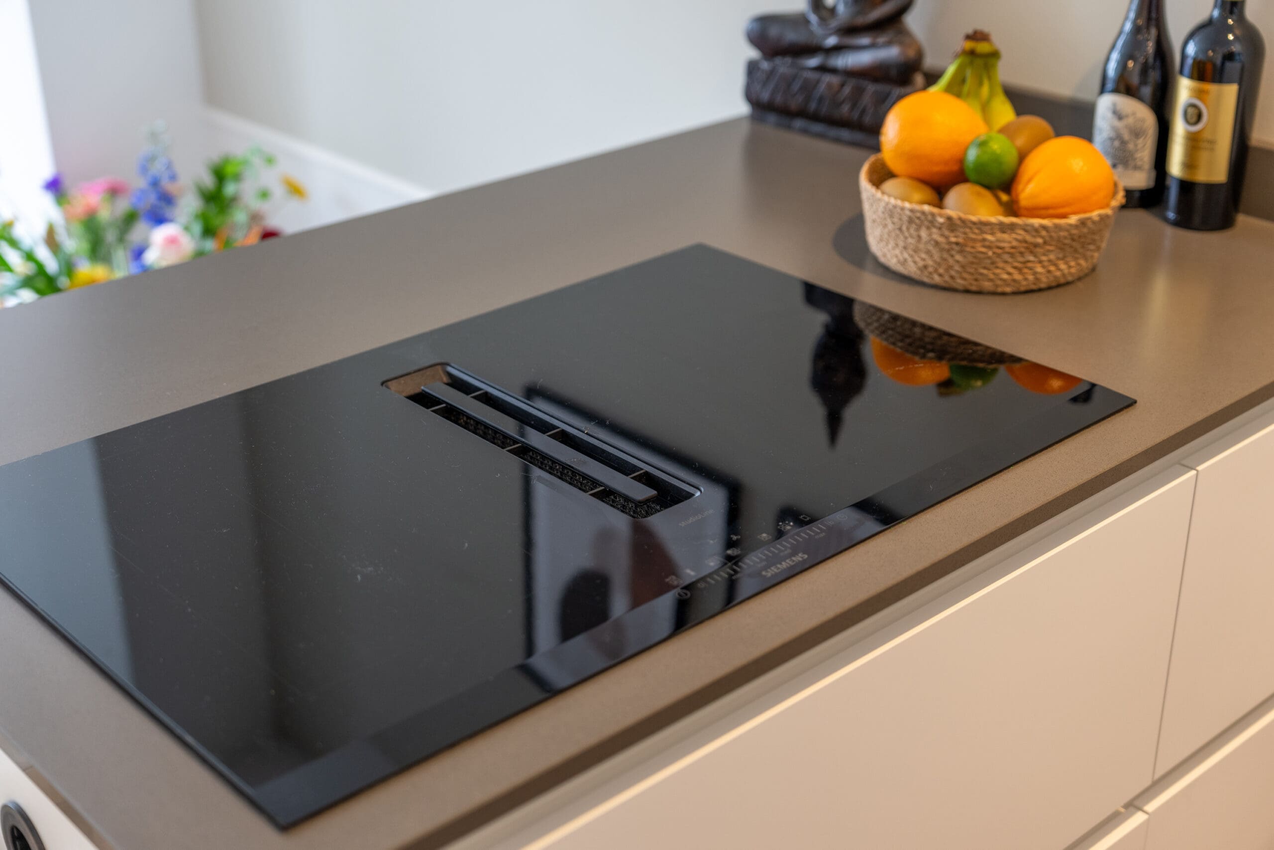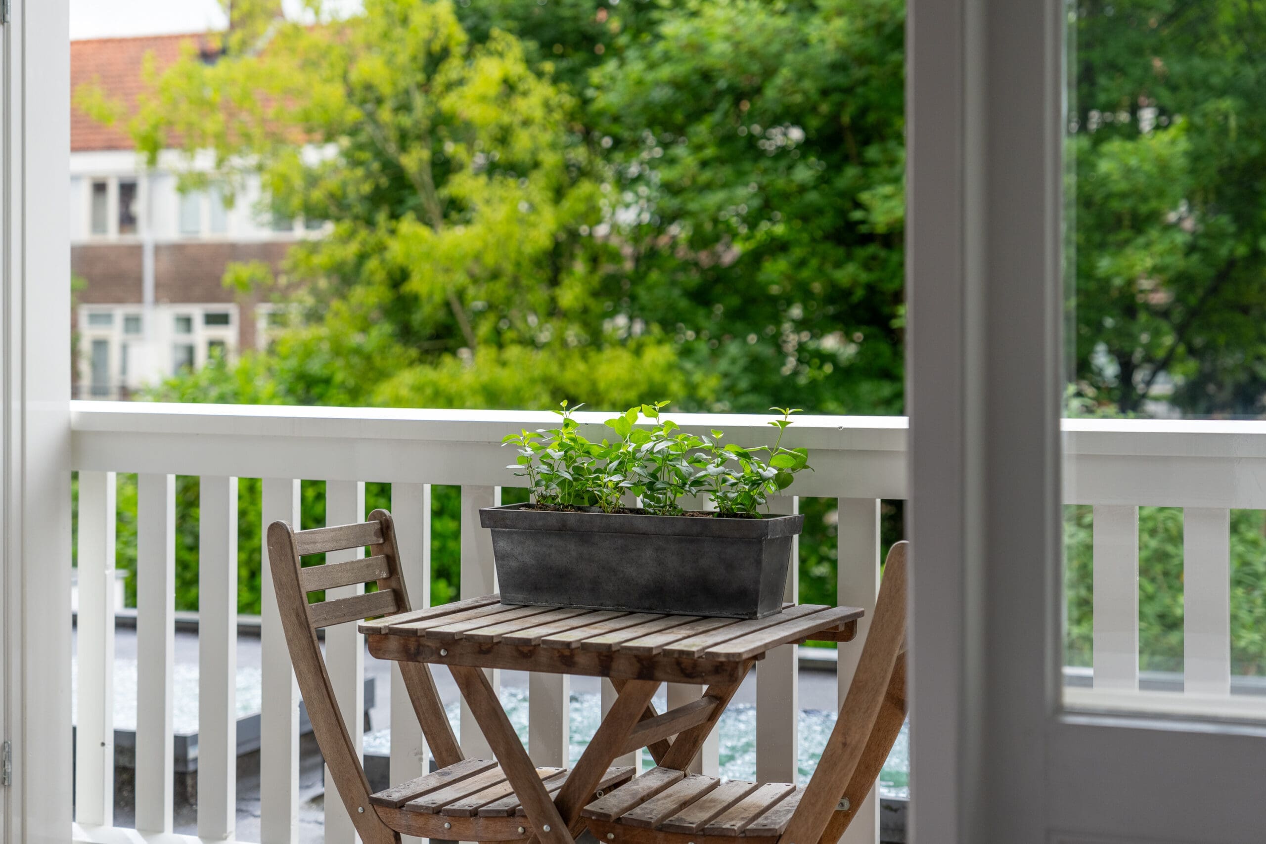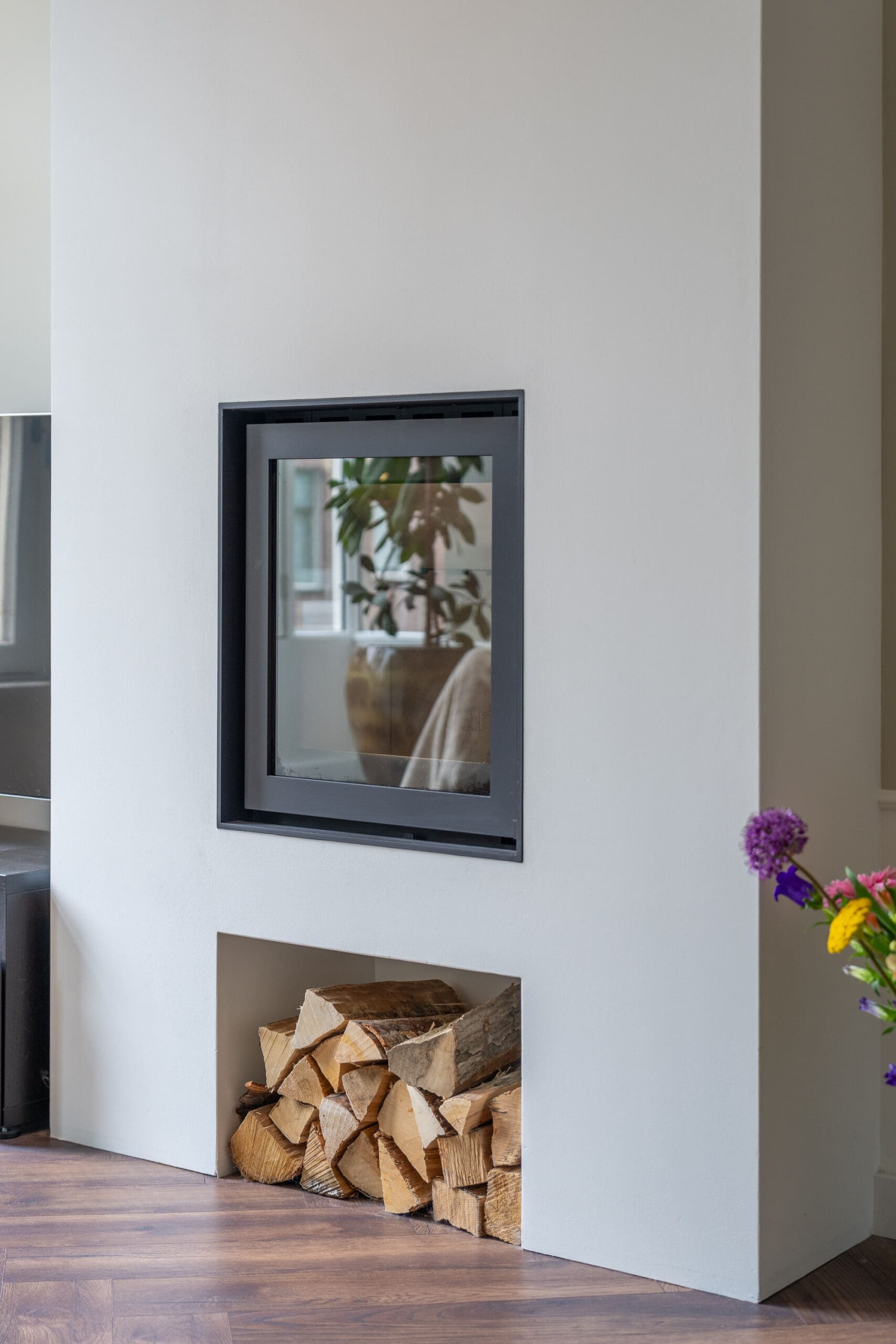 Entrance, attractive hallway with high doors and ceilings, coat nook, under-stair storage, washer/dryer cabinet, floating toilet with washbasin, a front-facing bedroom, a cozy living room with bay window and wood-burning stove, and a luxurious open kitchen equipped with various (Siemens) built-in appliances including an induction hob, a Quooker, a fridge/freezer combination, an oven, and a dishwasher. The modern bathroom features a walk-in shower, a vanity unit, and underfloor heating. The second bedroom is located at the rear and provides access to the balcony.