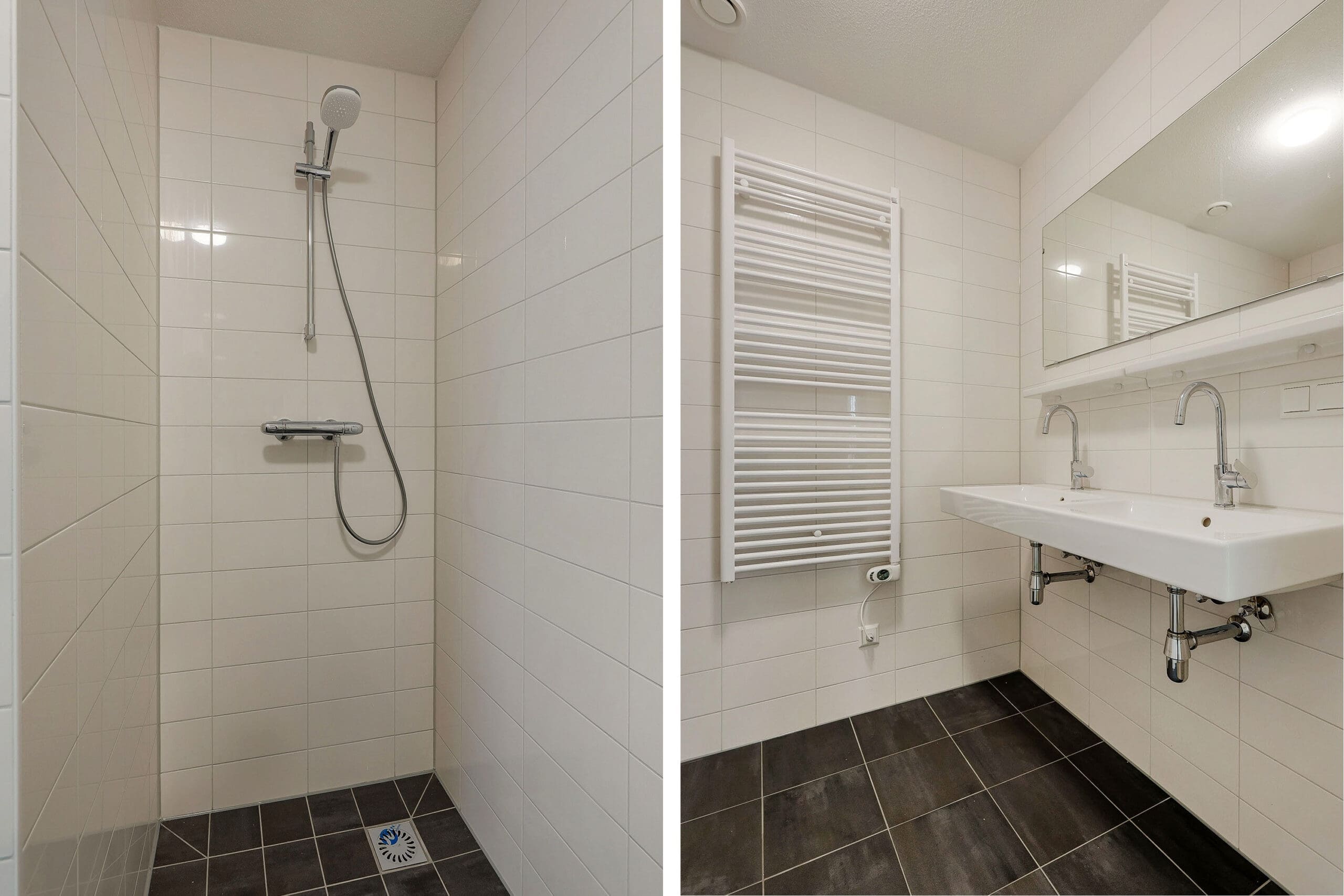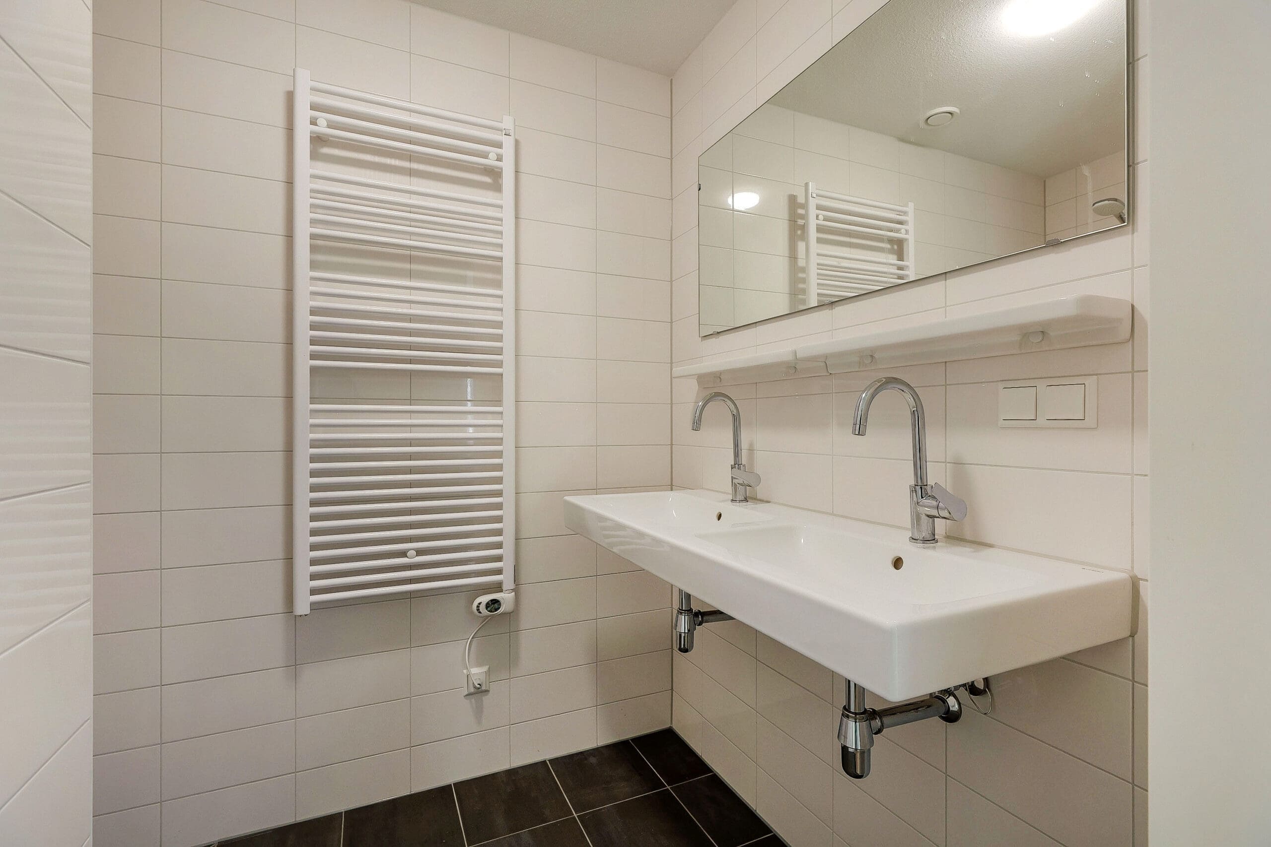 All apartments are fitted with a sleek bathroom featuring a double sink with mirror and shelf, a walk-in shower, and a designer radiator. There is also a separate toilet and a laundry room. Each apartment is equipped with a heat pump and several solar panels. All apartments are fitted with air conditioning units that can both heat and cool.