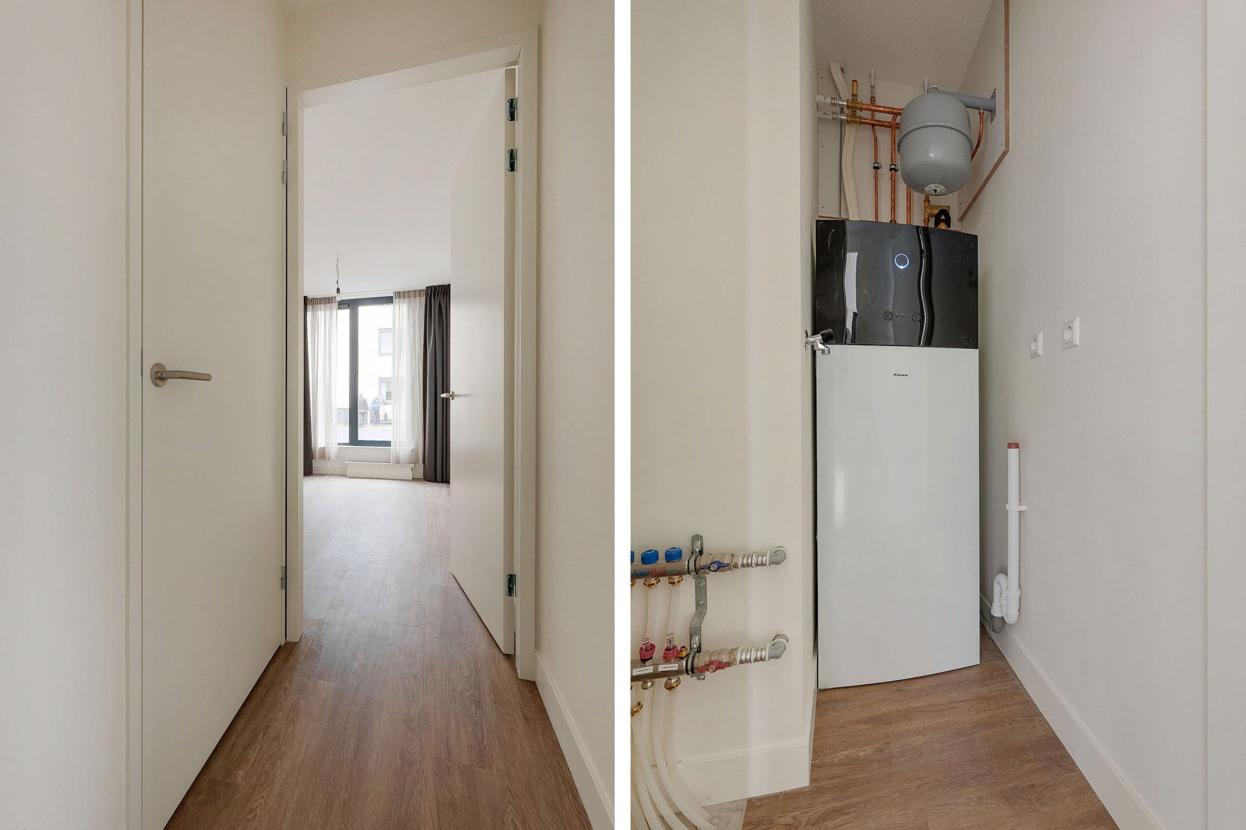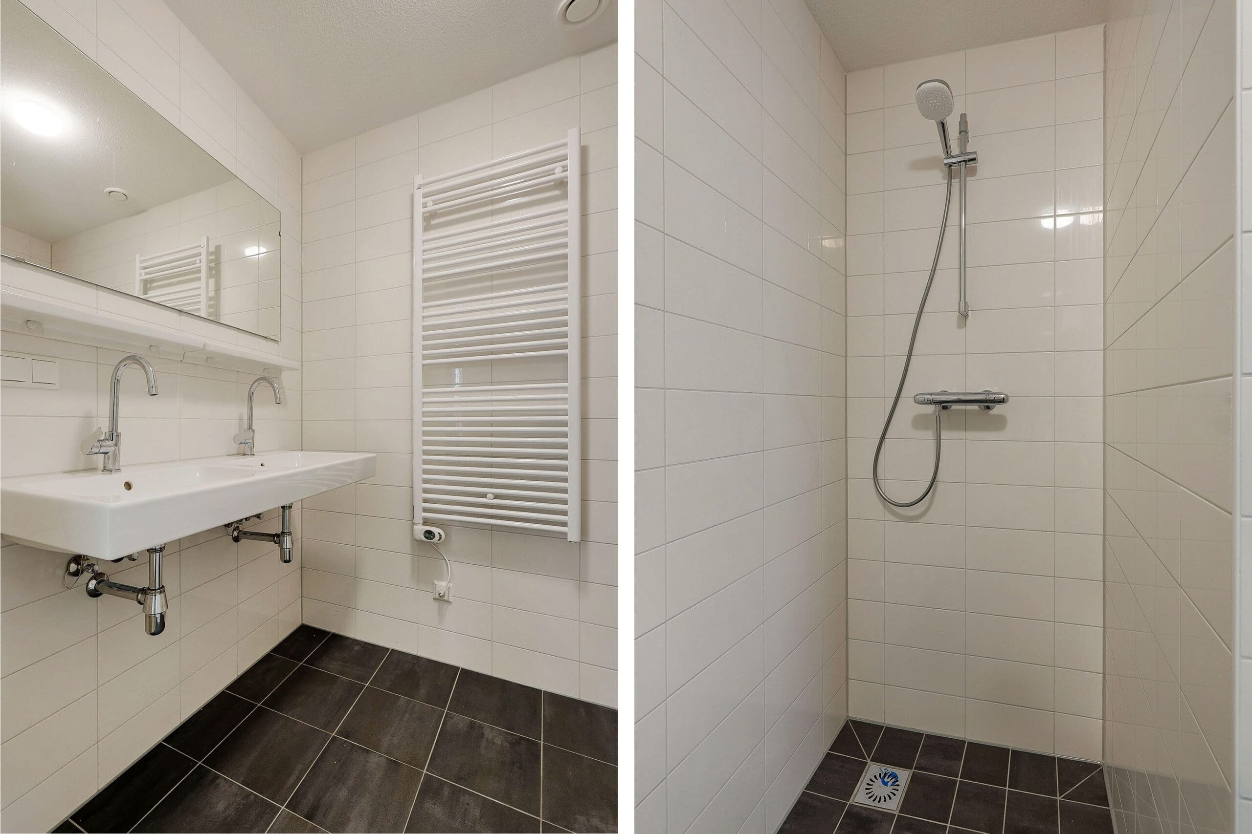 All apartments are fitted with a sleek bathroom featuring a double sink with mirror and shelf, a walk-in shower, and a designer radiator. There is also a separate toilet and a laundry room. Each apartment is equipped with a heat pump and several solar panels. All apartments are fitted with air conditioning units that can both heat and cool.