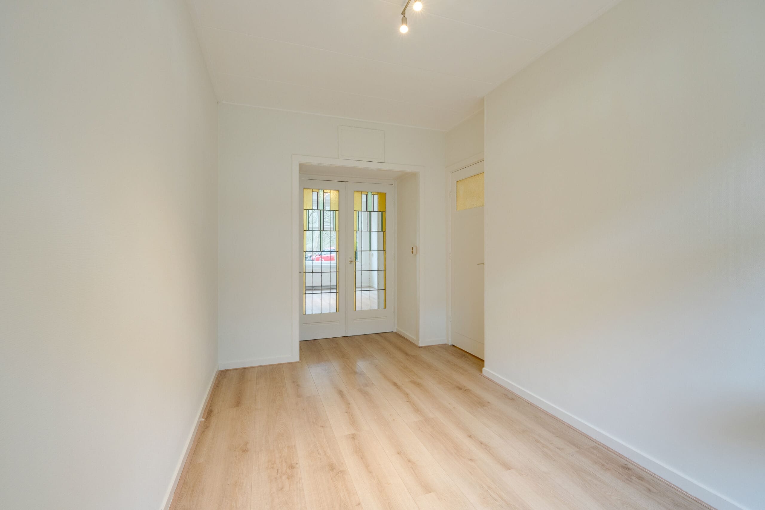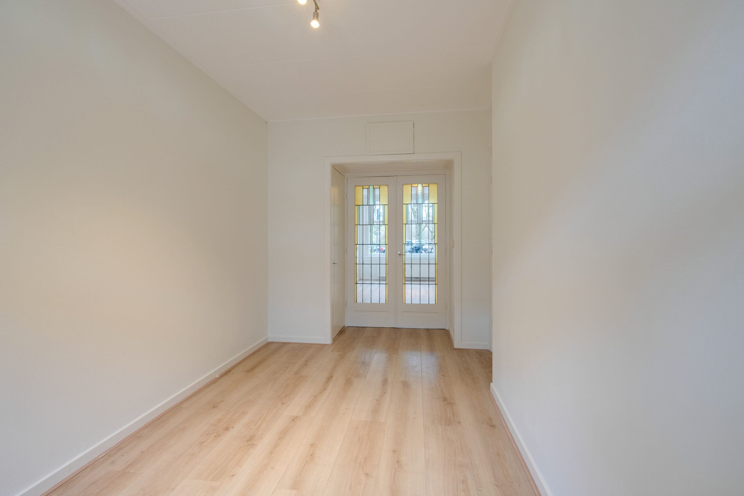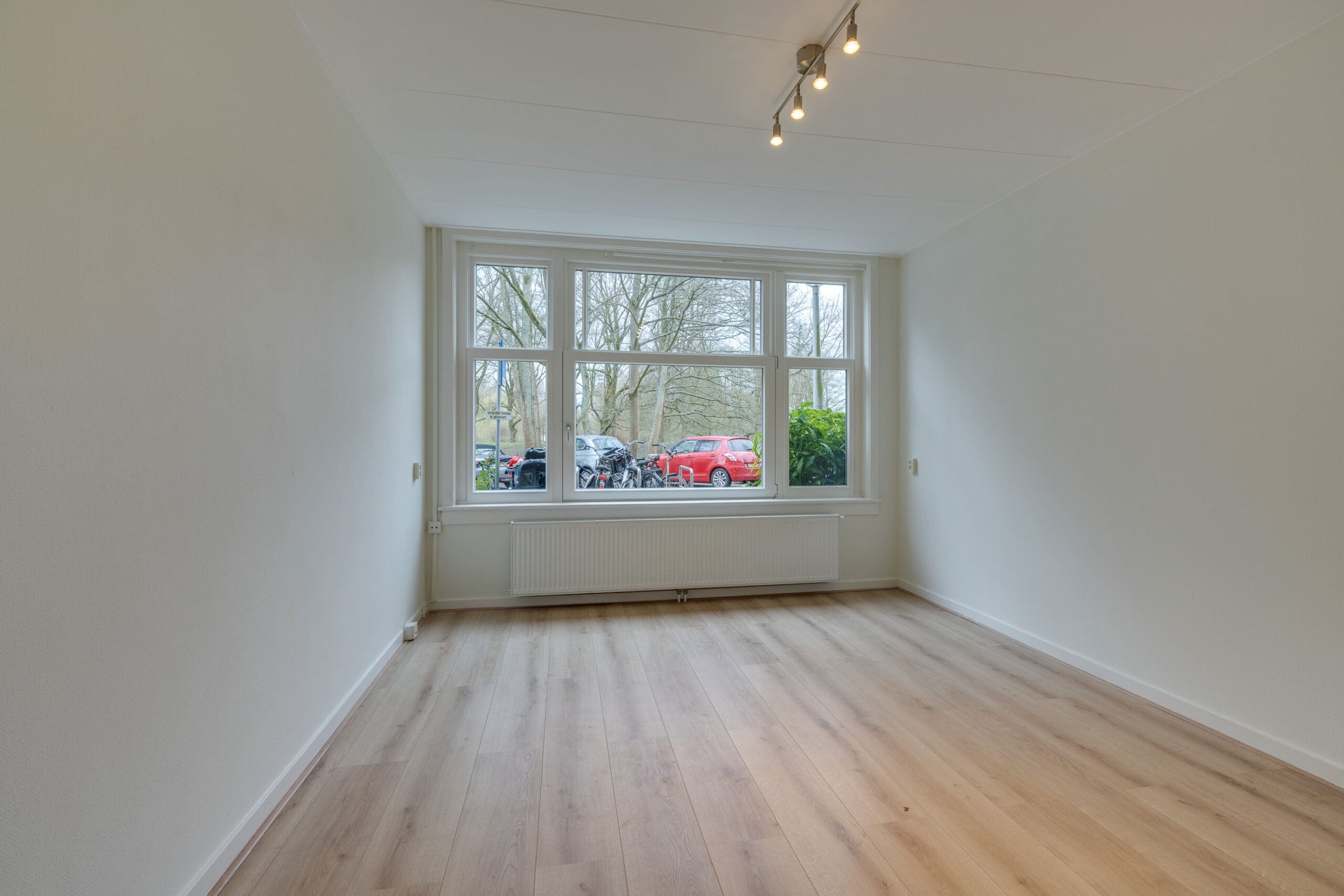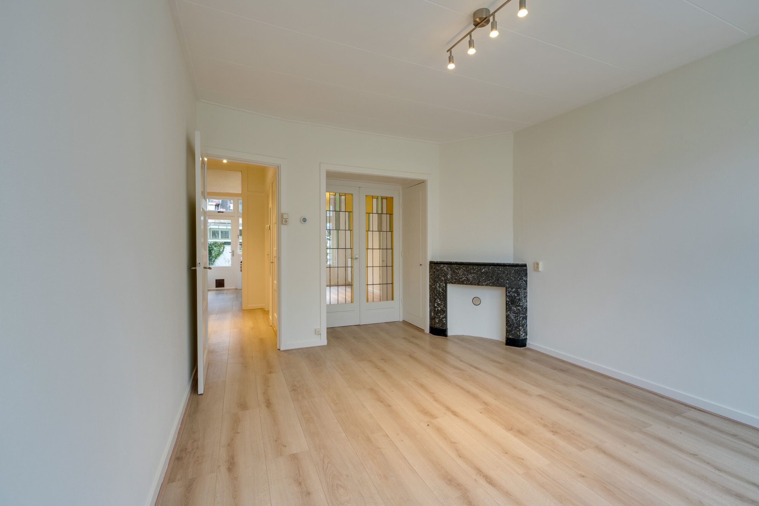 Through the private entrance with vestibule you reach the hall, which provides access to all rooms of the apartment. At the front is the living room, which offers a beautiful and unobstructed view of Rembrandtpark. The bathroom is centrally located in the apartment and at the rear are the two bedrooms and the kitchen. Both bedrooms have access to the garden facing east through French doors.