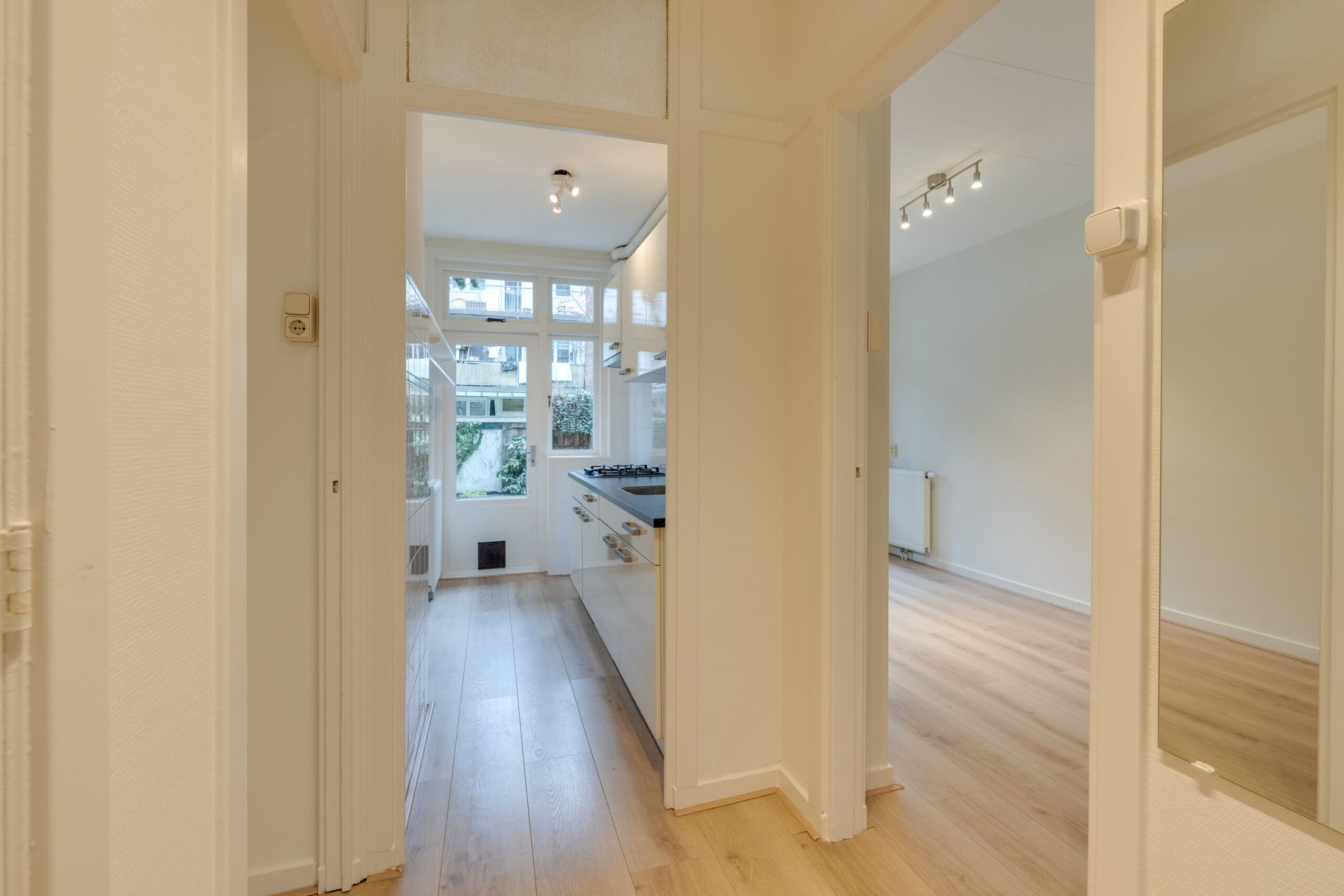 Via de eigen entree met tochtportaal bereikt u de hal, welke toegang biedt tot alle vertrekken van de woning. Aan de voorzijde bevindt zich de woonkamer, welke een fraai en vrij uitzicht biedt op Rembrandtpark. De badkamer ligt centraal in de woning en aan de achterzijde bevinden zich de twee slaapkamers en de keuken. Beide slaapkamers hebben via openslaande deuren toegang tot de tuin op het oosten.