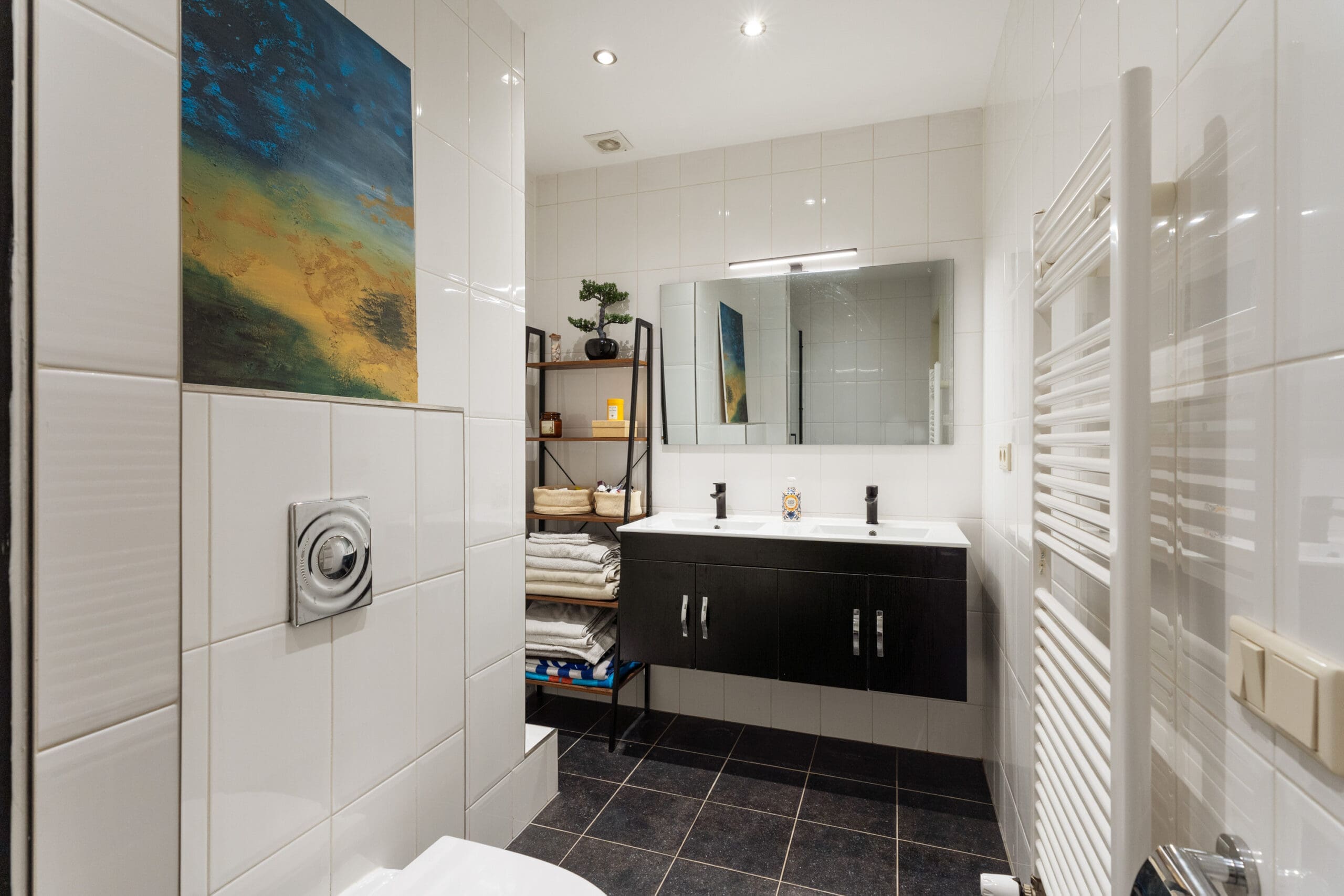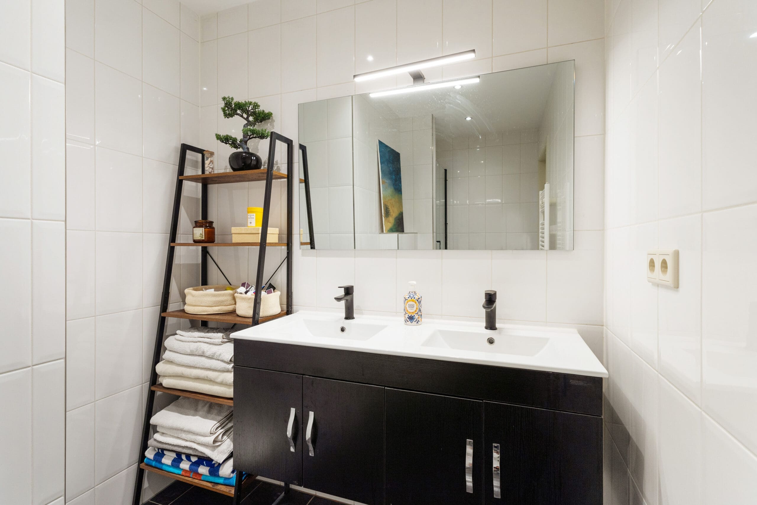 Een vaste trap leidt naar de bovenverdieping, waar zich nog 2 ruime slaapkamers bevinden, één aan de voorzijde en één aan de achterzijde. Tussenin ligt een moderne, ruime badkamer met douche, toilet, vloerverwarming en dubbele wastafel. Daarnaast is er een grote berging met aansluitingen voor wasmachine en droger. Er is bovendien volop bergruimte aanwezig op beide verdiepingen.