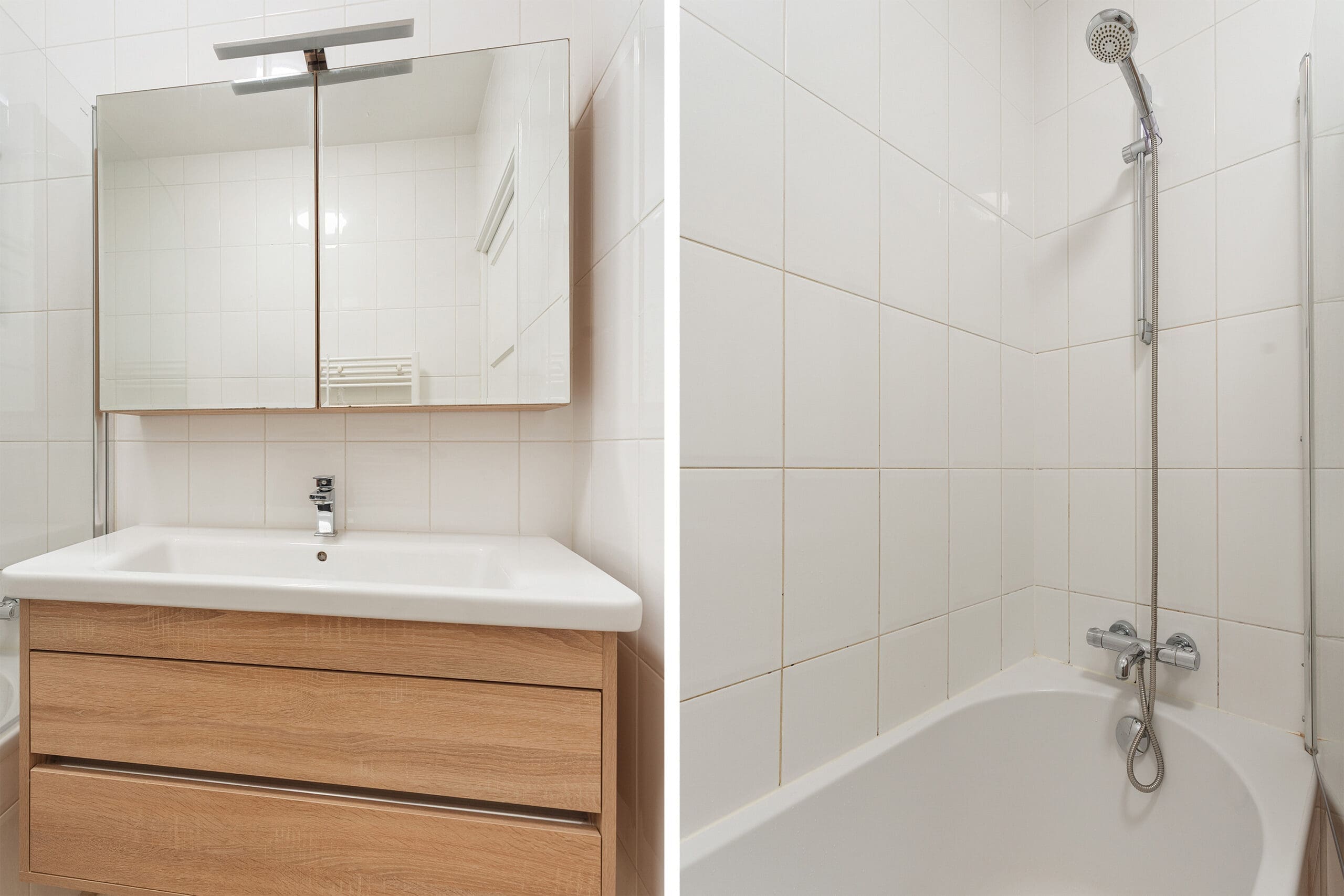Upstairs you’ll find 2 more large bedrooms, one front facing and one at the rear. Between them is a large modern bathroom with shower, toilet, underfloor heating, and double sink. A large storage room houses the washer and dryer. There is also a plenty of storage in both floors.