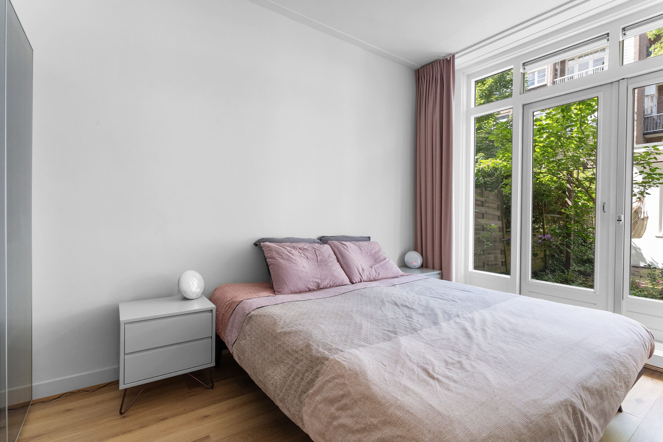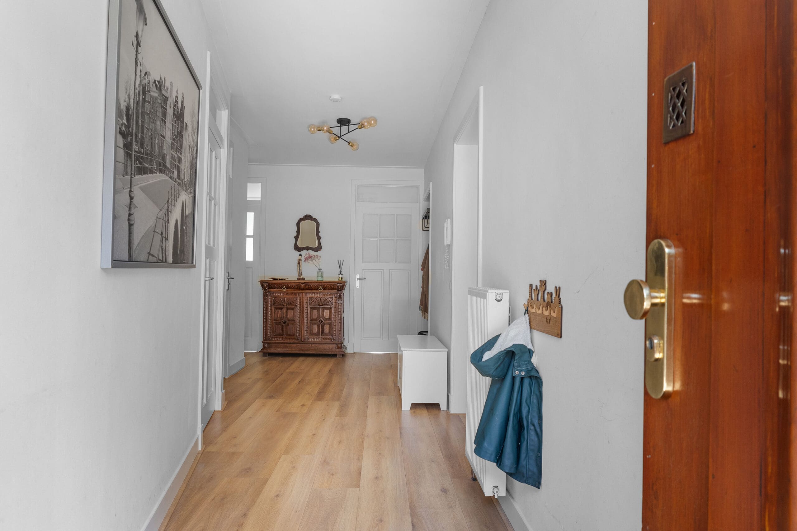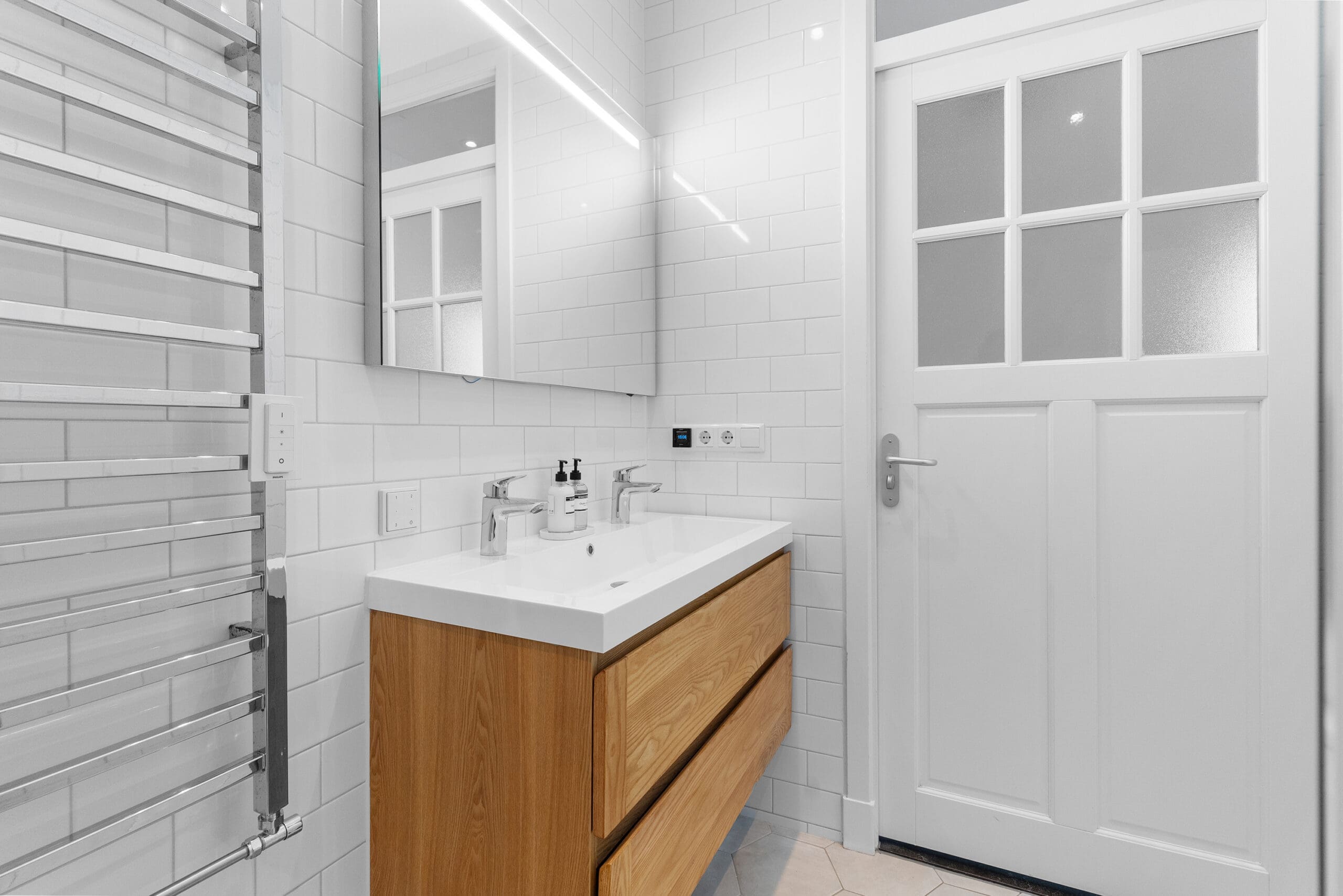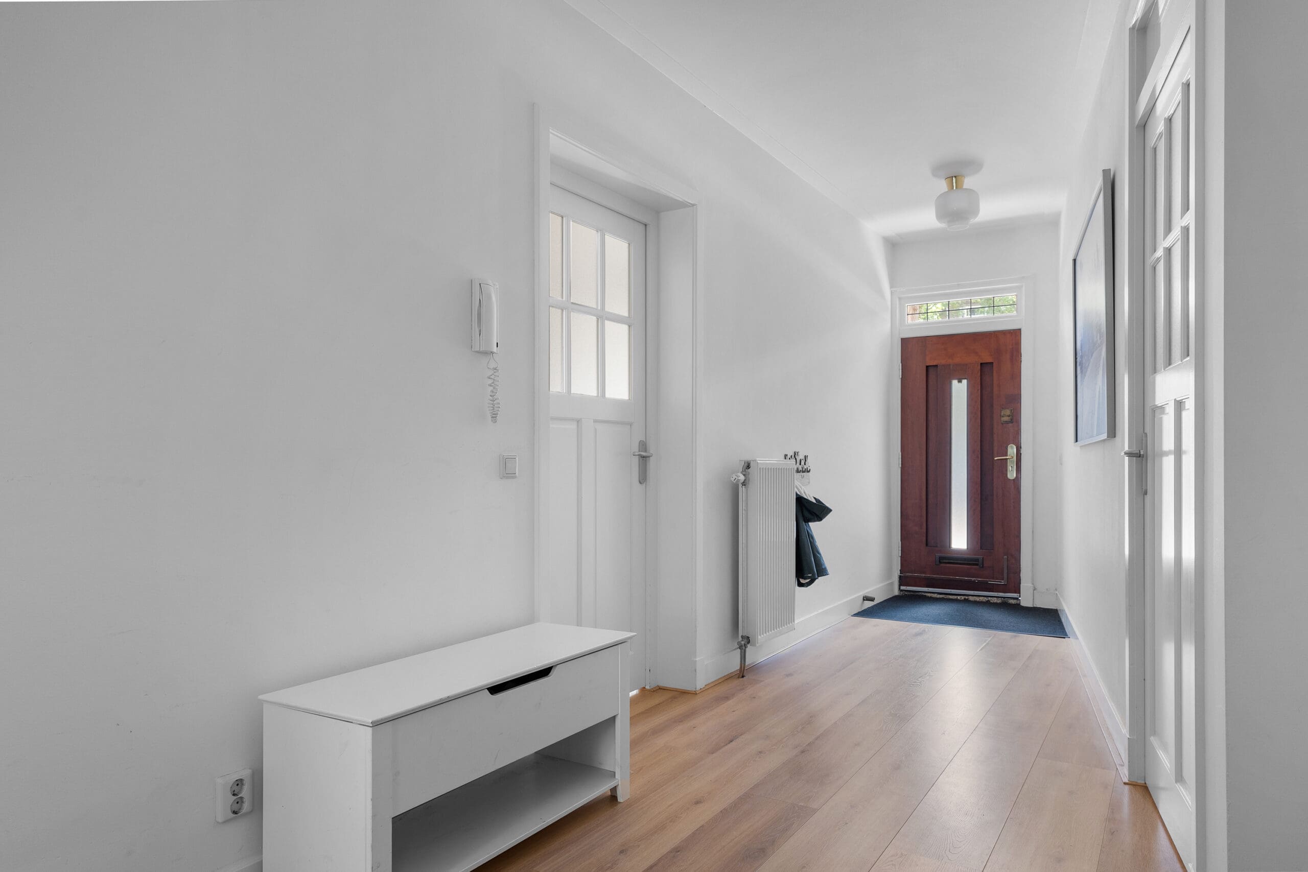 Entrance: Very spacious hallway at the heart of the home, providing access to all rooms; the high ceilings are immediately noticeable. In the hallway, there is a coat corner and a separate floating toilet with a washbasin. At the front, a spacious bedroom. In the center of the apartment is the luxurious bathroom, equipped with underfloor heating, a bathtub with waterfall tap, a spacious walk-in shower, oak cabinetry with double washbasins, and a mirror with light and heating. Two well-sized bedrooms at the rear, both with French doors opening onto the garden.
