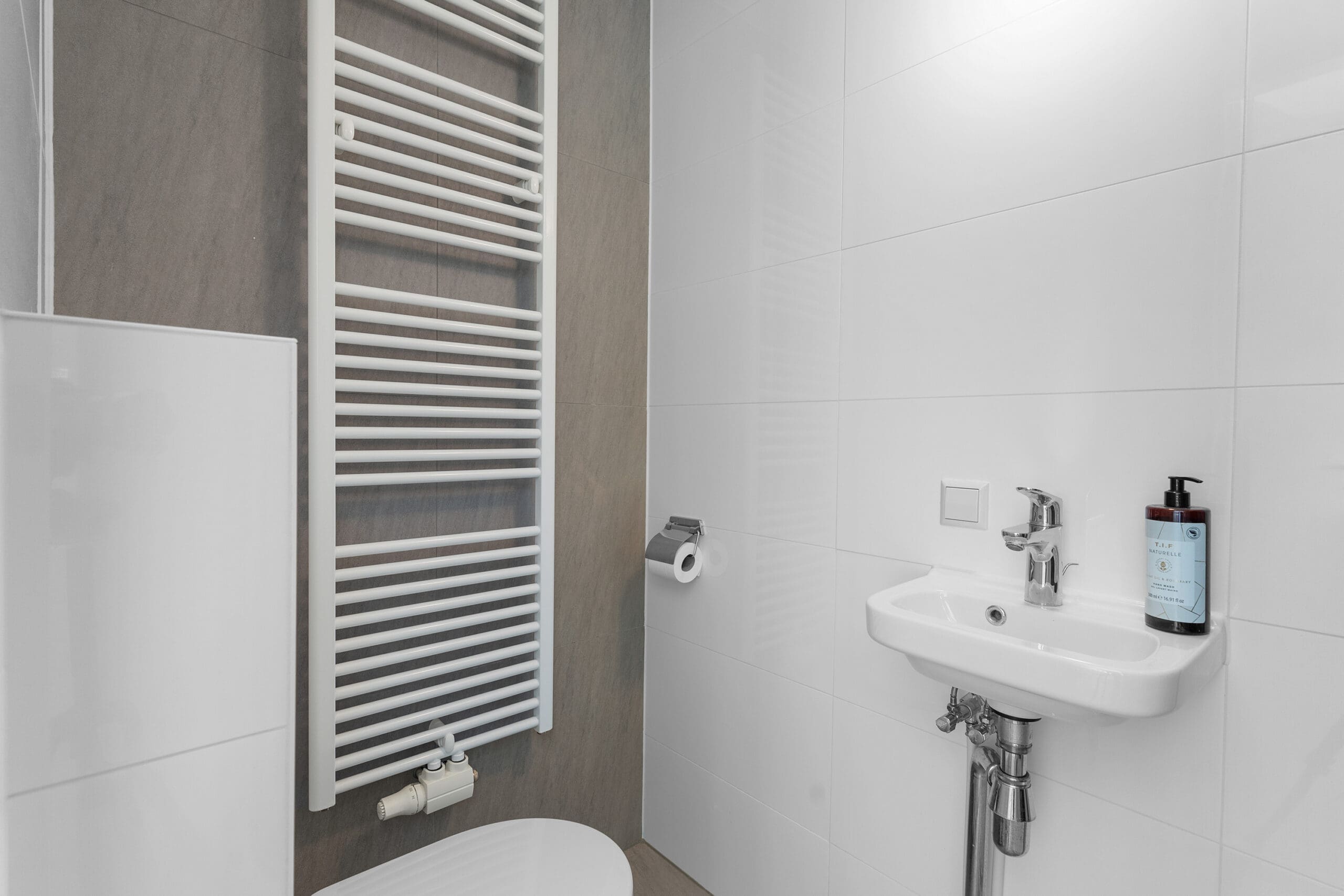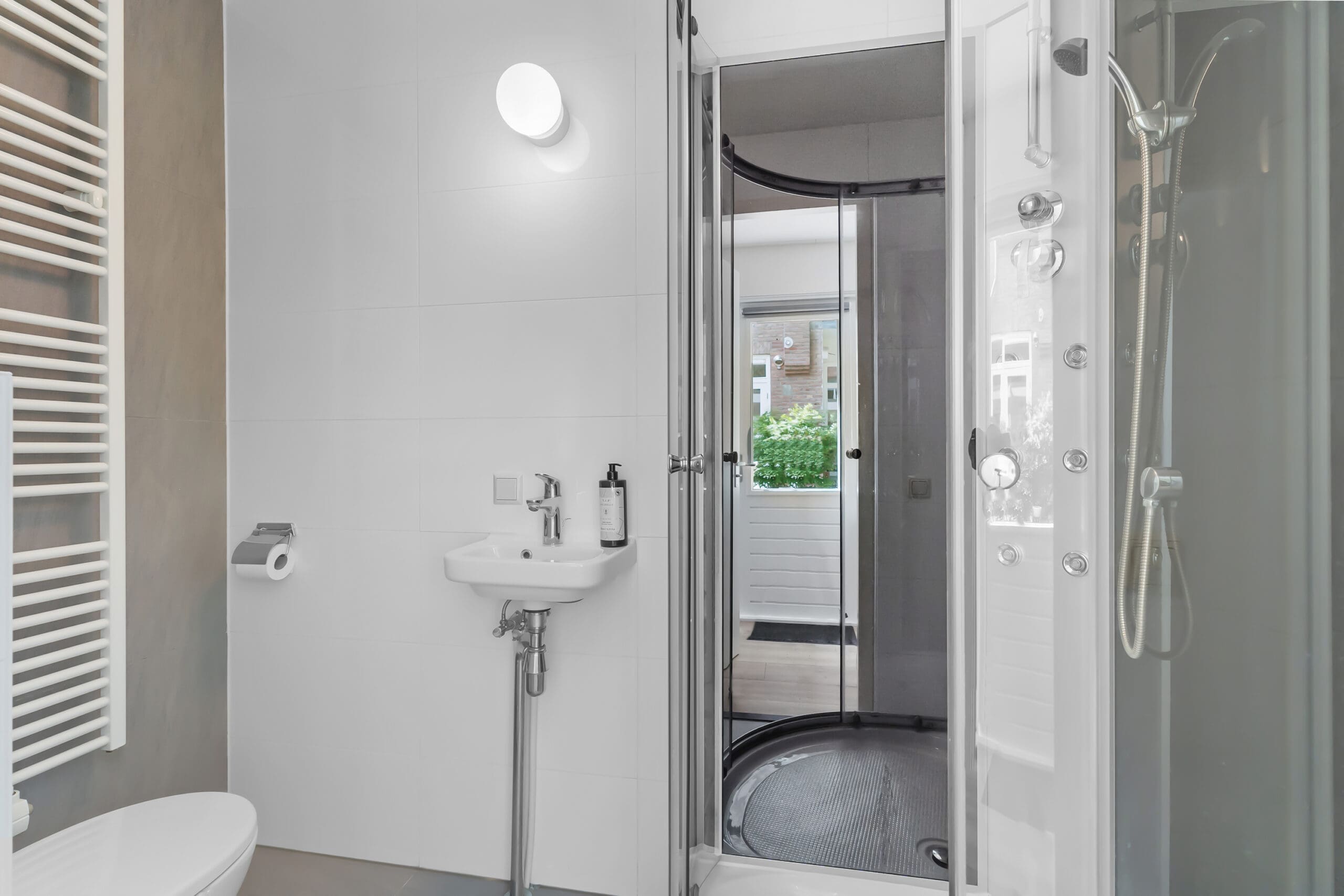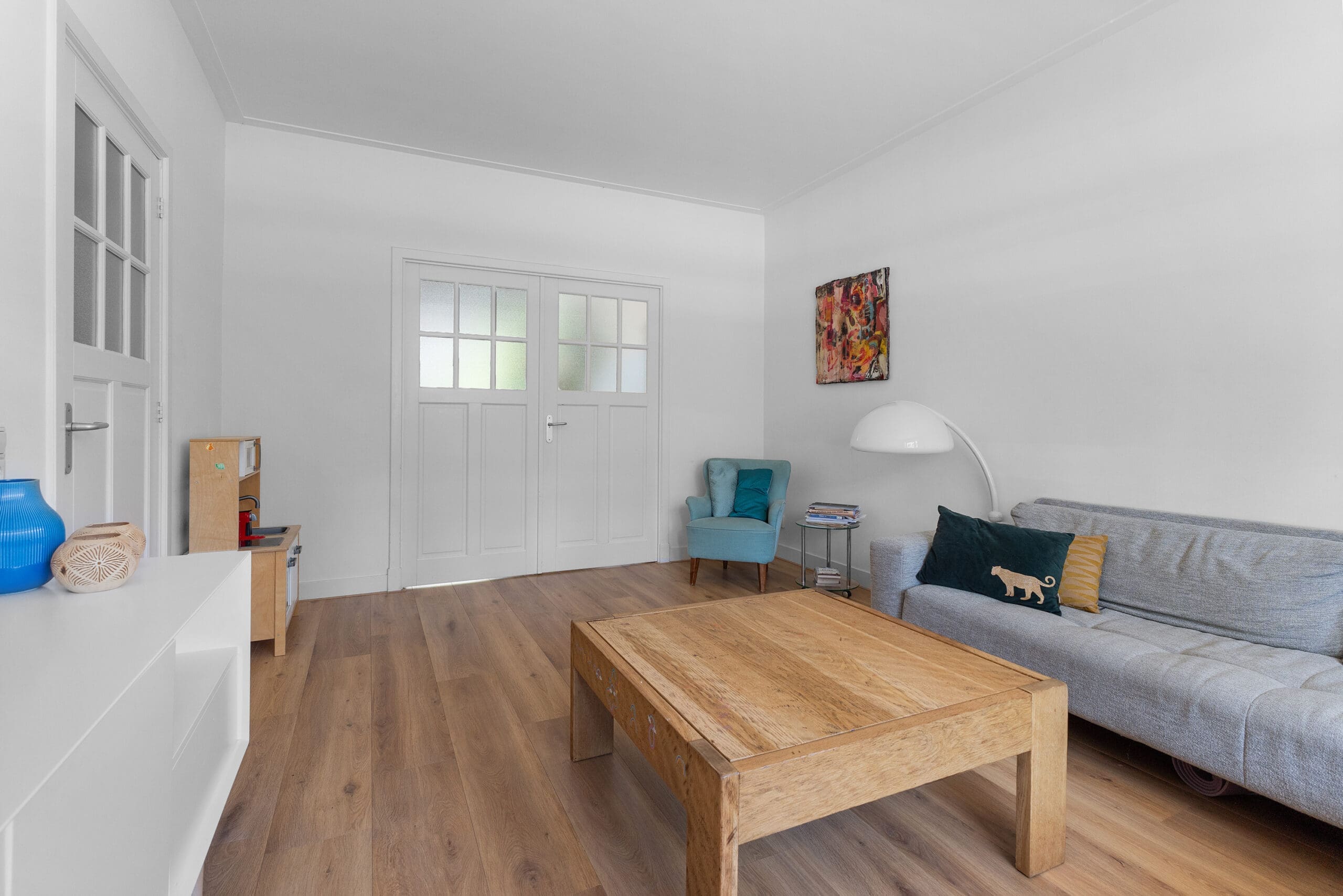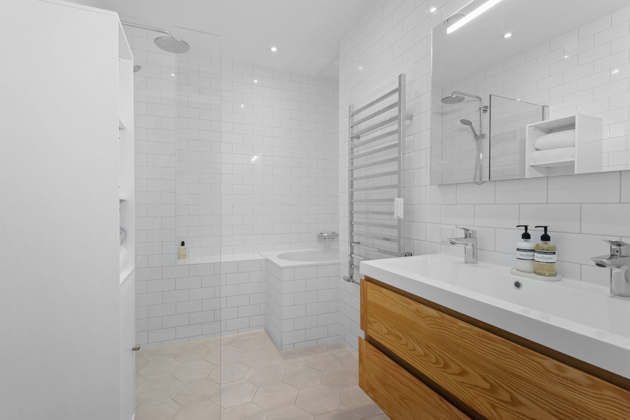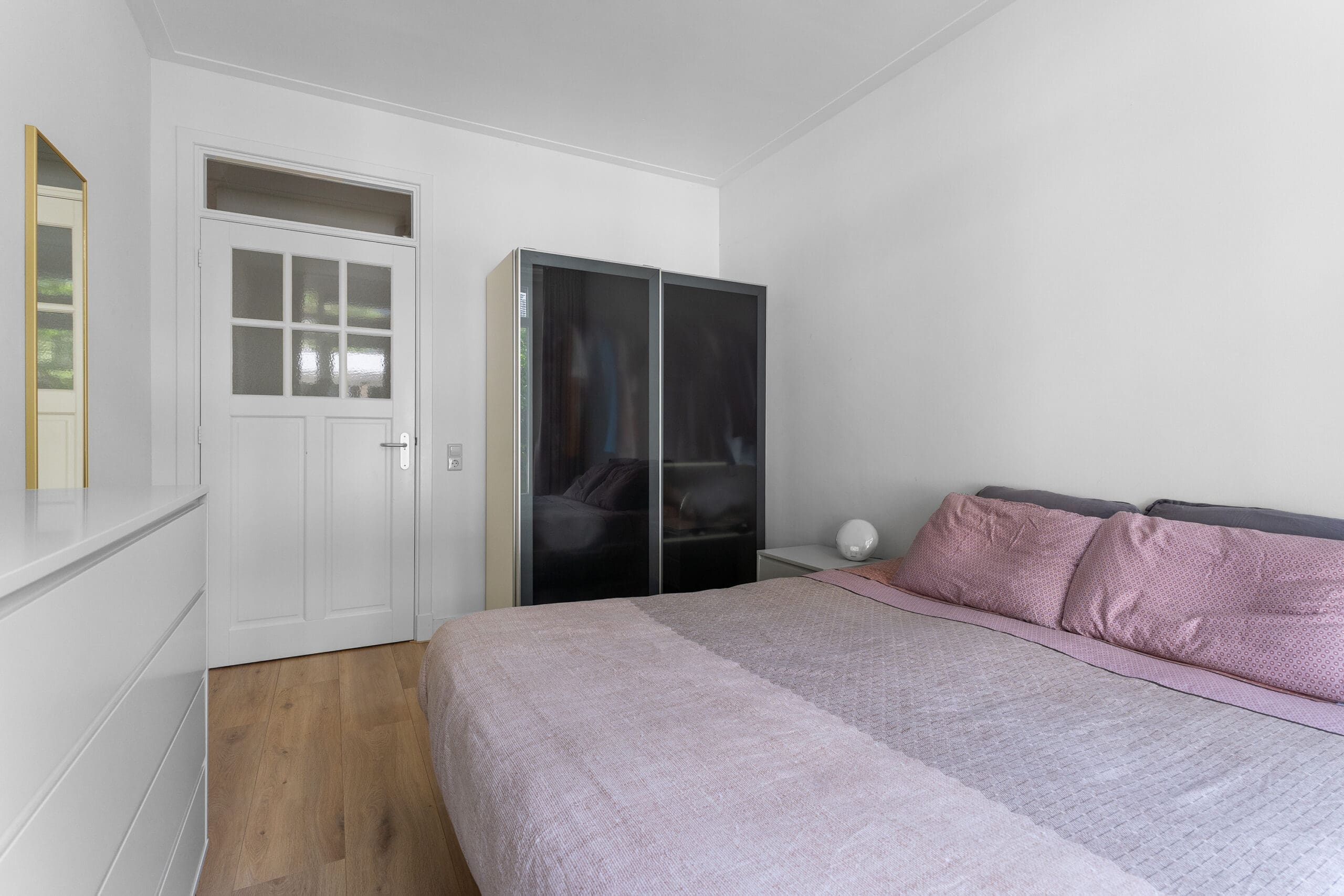 Entrance: Very spacious hallway at the heart of the home, providing access to all rooms; the high ceilings are immediately noticeable. In the hallway, there is a coat corner and a separate floating toilet with a washbasin. At the front, a spacious bedroom. In the center of the apartment is the luxurious bathroom, equipped with underfloor heating, a bathtub with waterfall tap, a spacious walk-in shower, oak cabinetry with double washbasins, and a mirror with light and heating. Two well-sized bedrooms at the rear, both with French doors opening onto the garden.