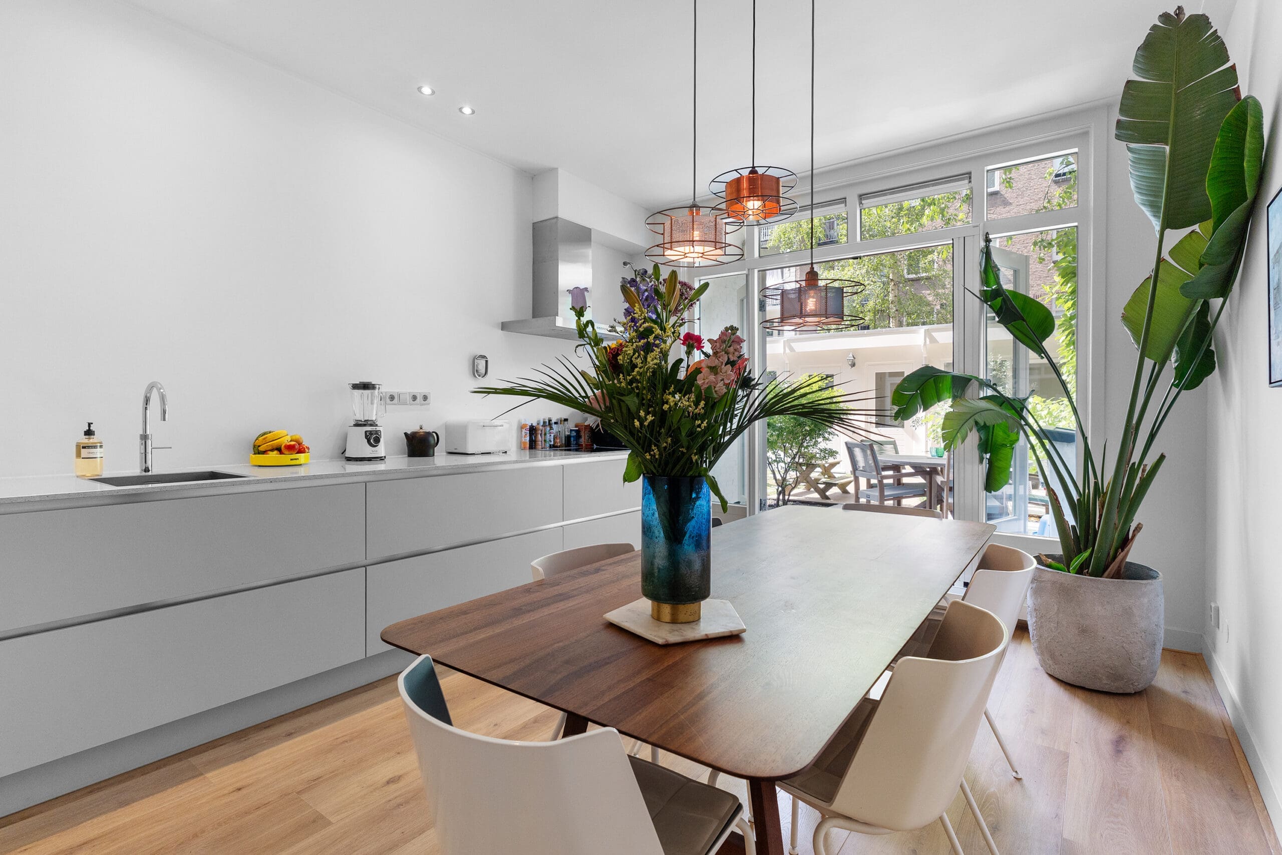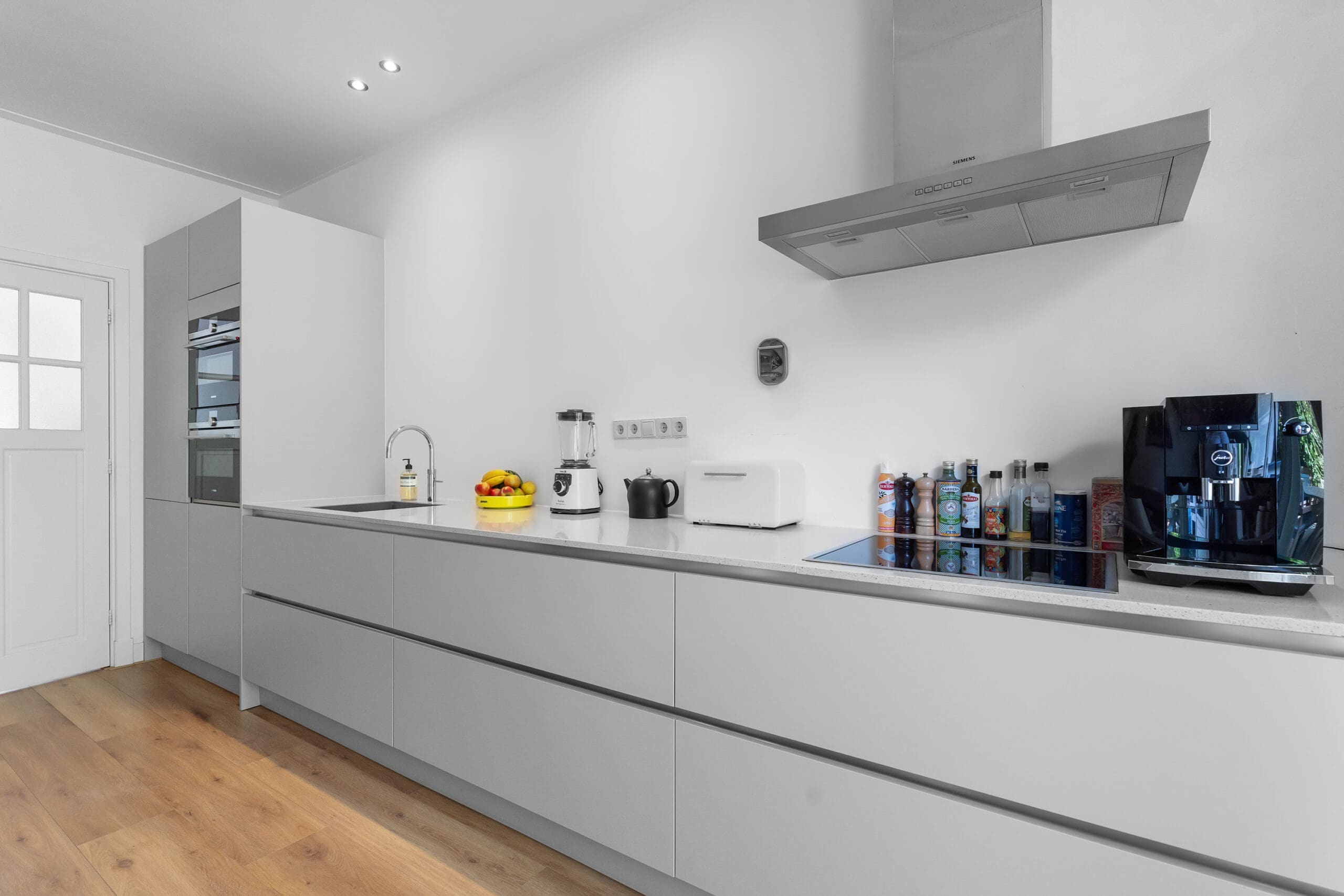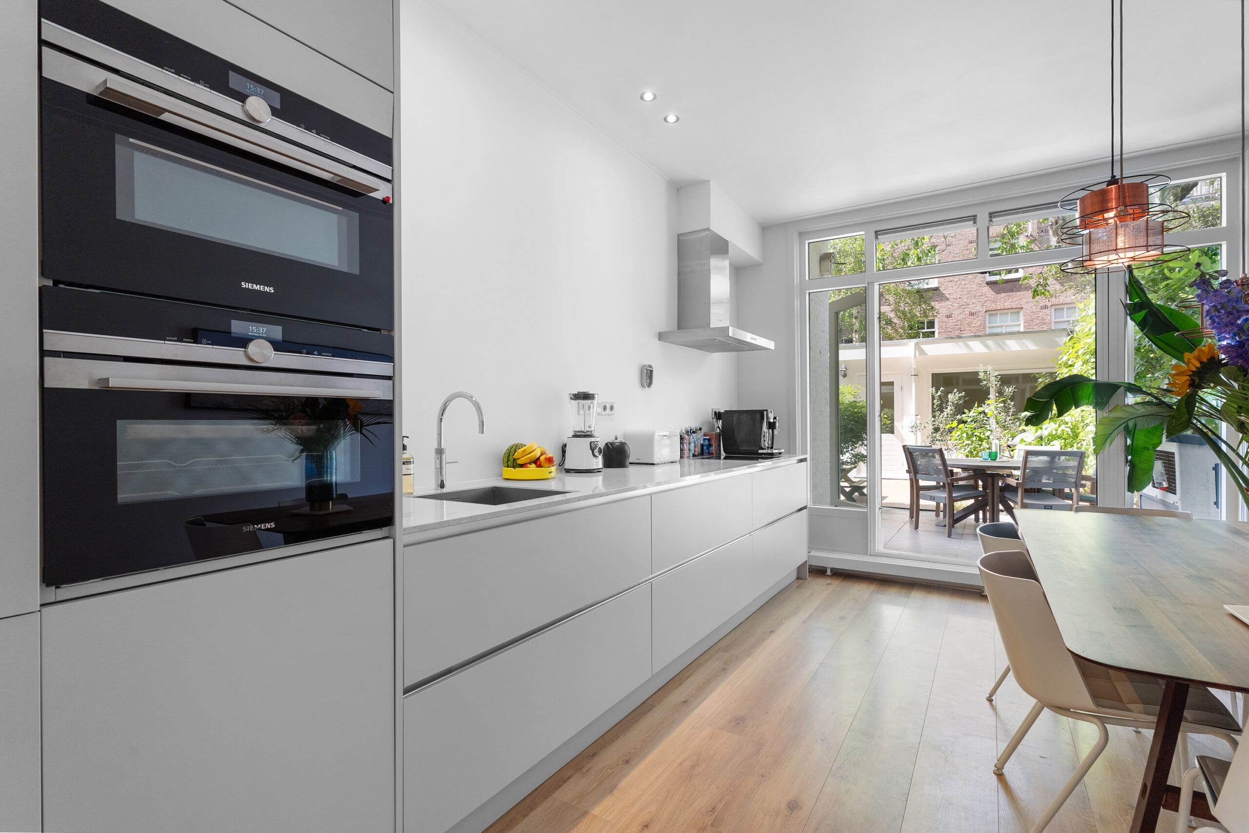 The bright kitchen is located at the rear of the home and features all necessary built-in appliances: extractor hood, induction hob, dishwasher, refrigerator, freezer, Quooker, an oven/microwave combination, and a steam oven. From the kitchen, there is also access to the garden through French doors.