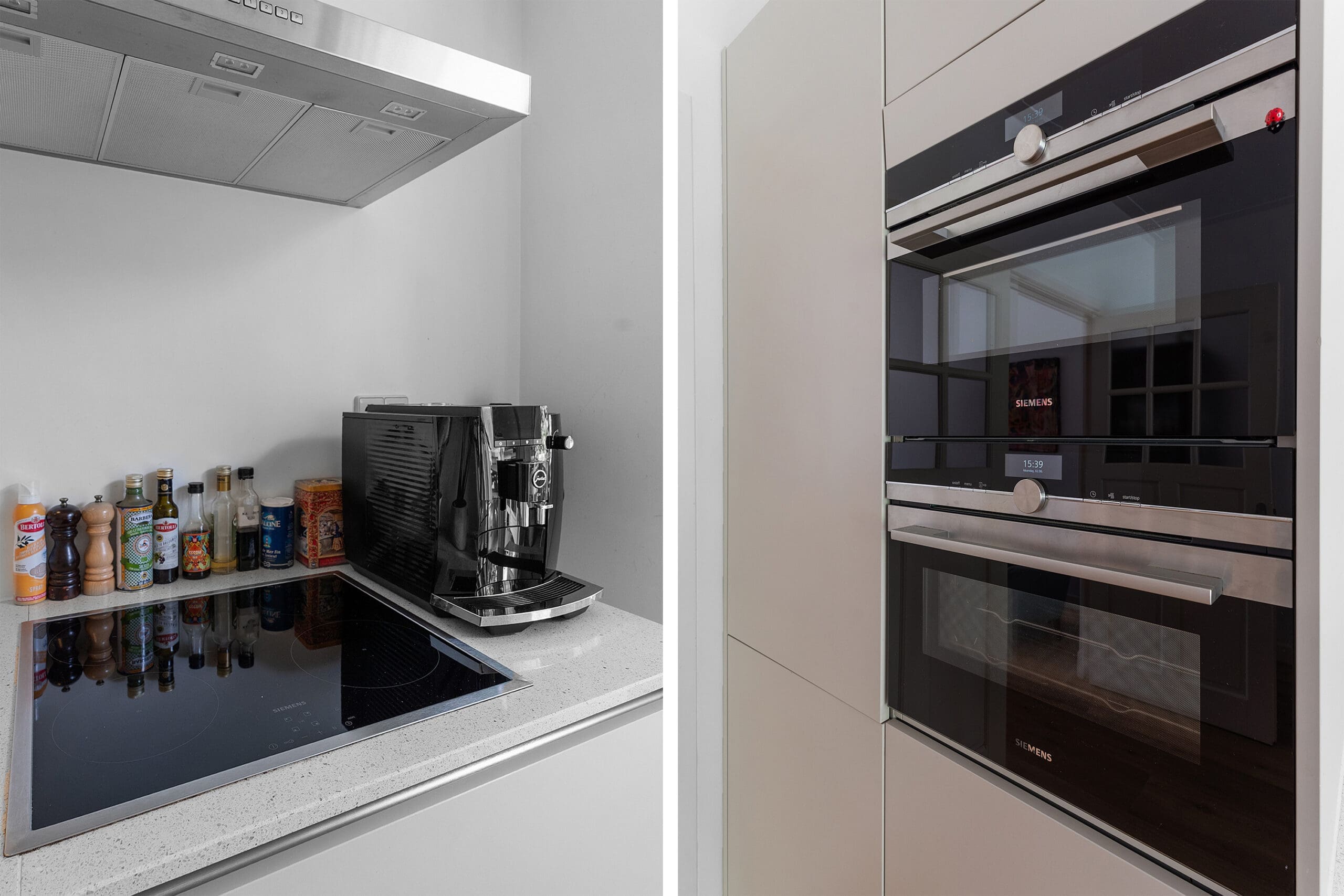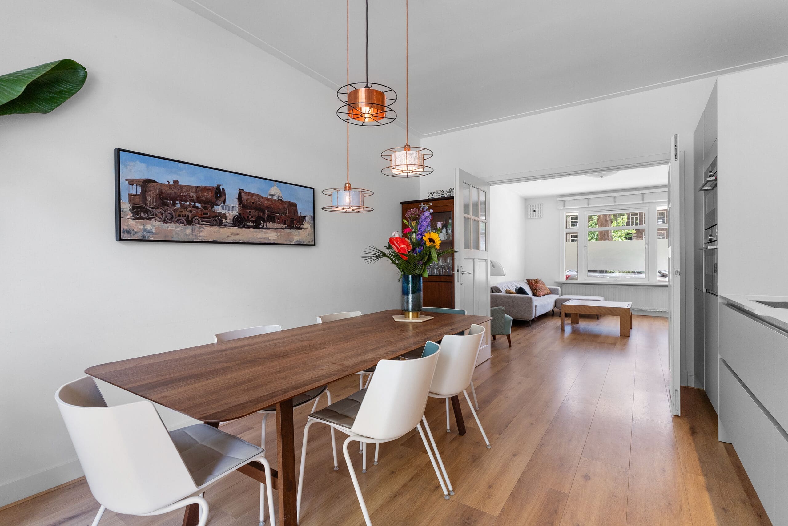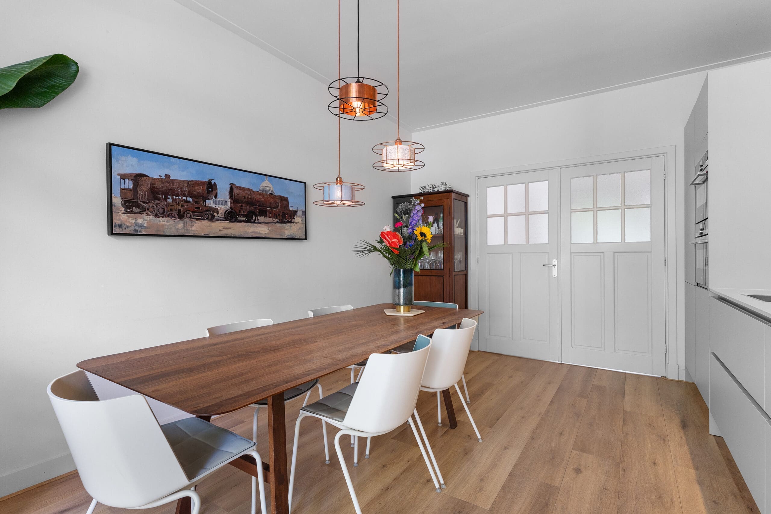The bright kitchen is located at the rear of the home and features all necessary built-in appliances: extractor hood, induction hob, dishwasher, refrigerator, freezer, Quooker, an oven/microwave combination, and a steam oven. From the kitchen, there is also access to the garden through French doors.