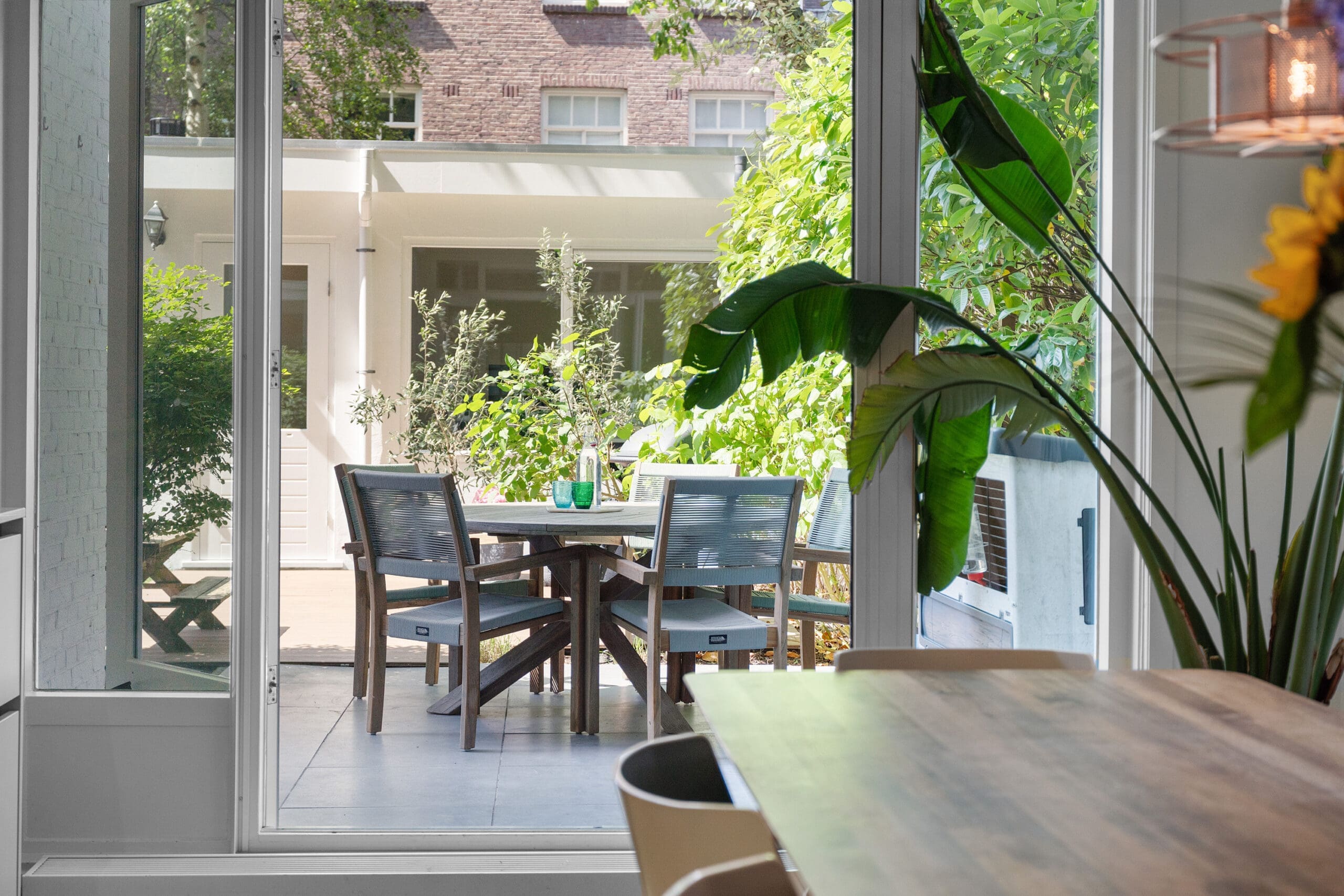 Vanuit de keuken is er tevens toegang naar de tuin middels openslaande deuren. De tuin is vakkundig aangelegd, en voorzien van houten pergola met twee schommels. Vanaf het terras kunt u vanaf halverwege de middag tot in de avond van de zon genieten.
