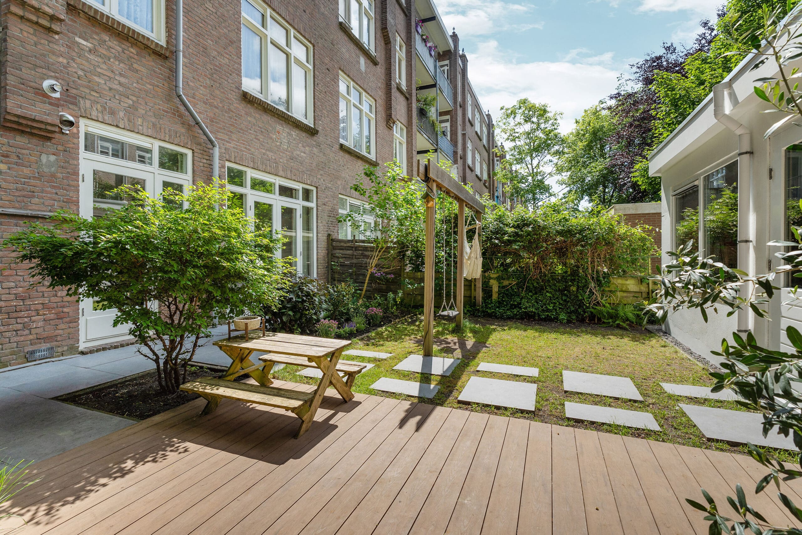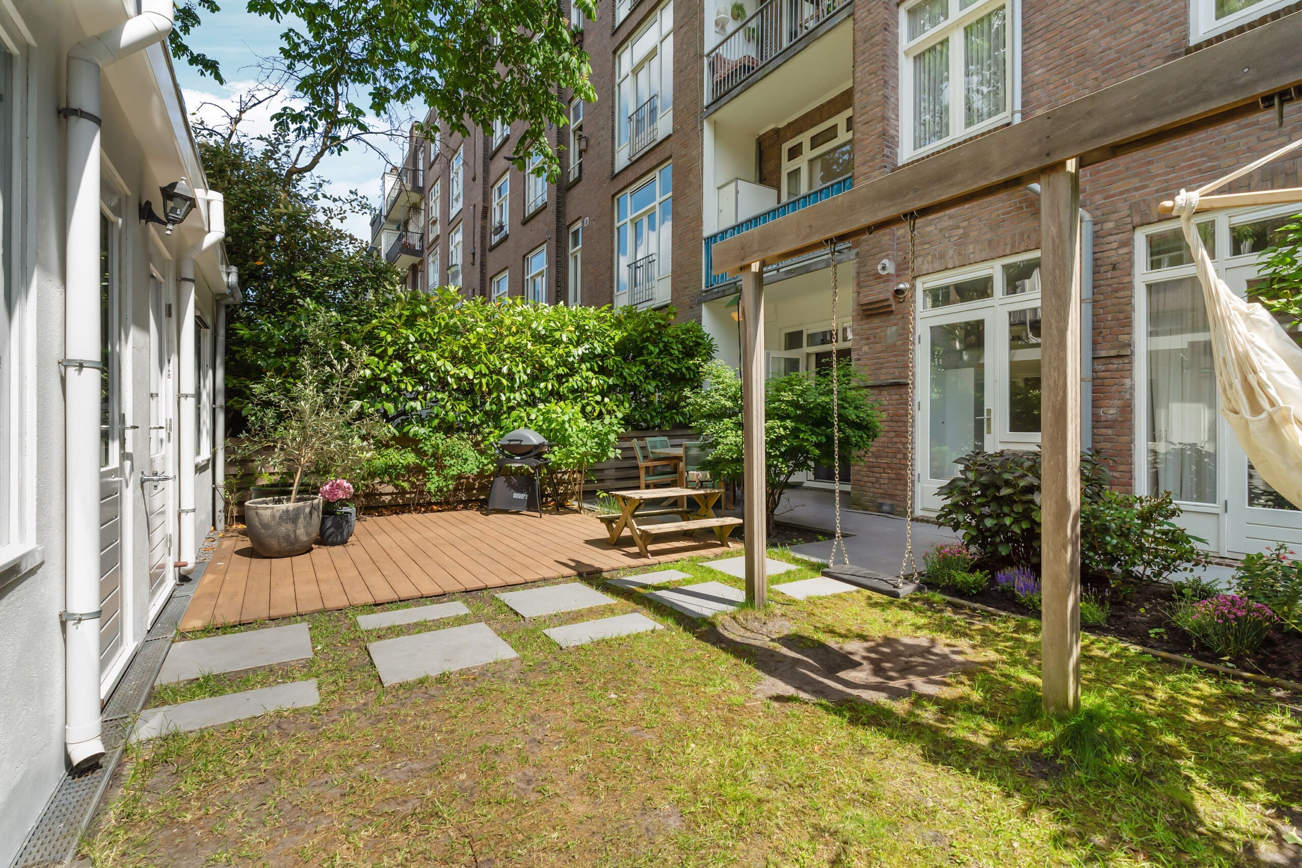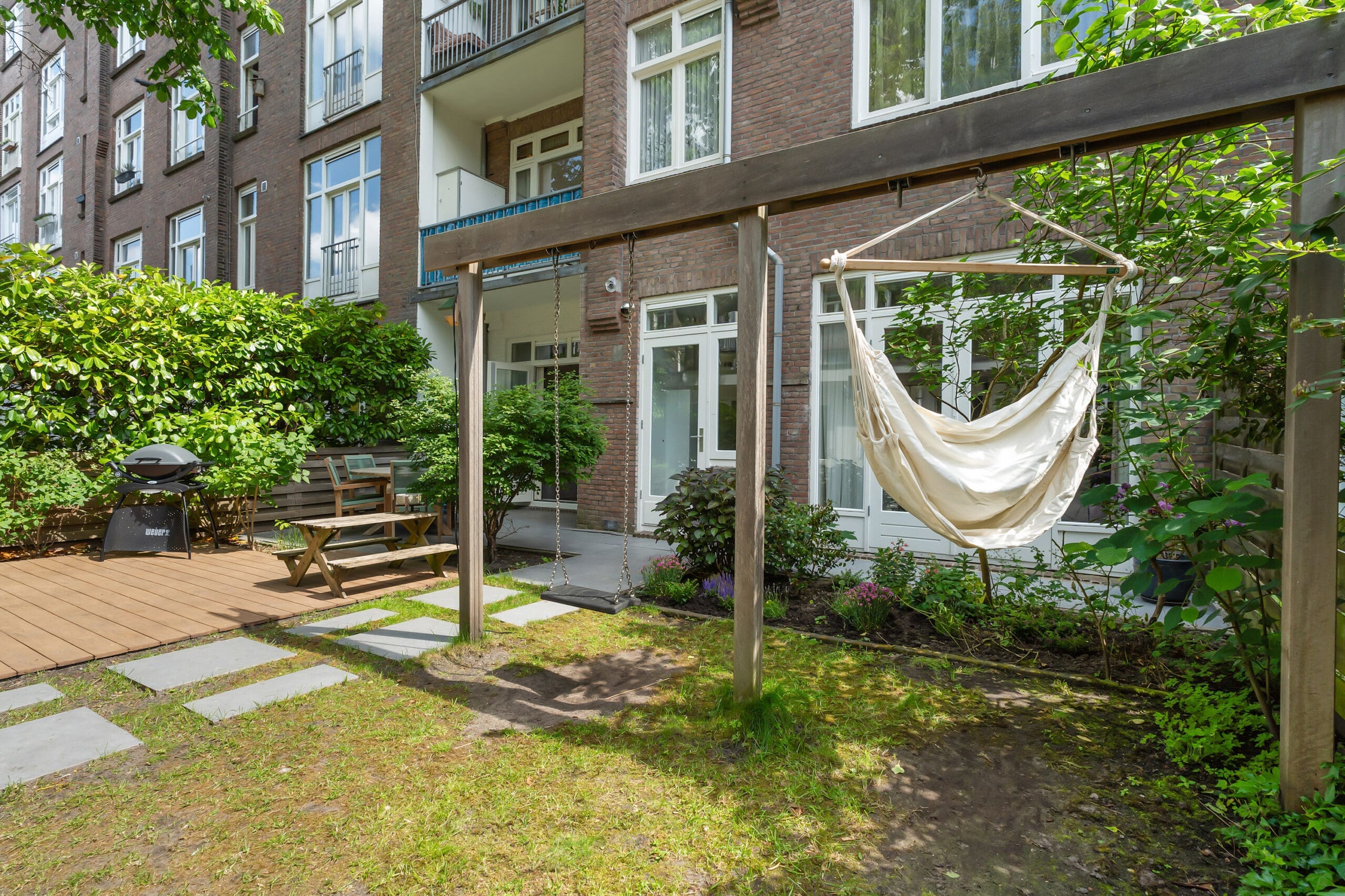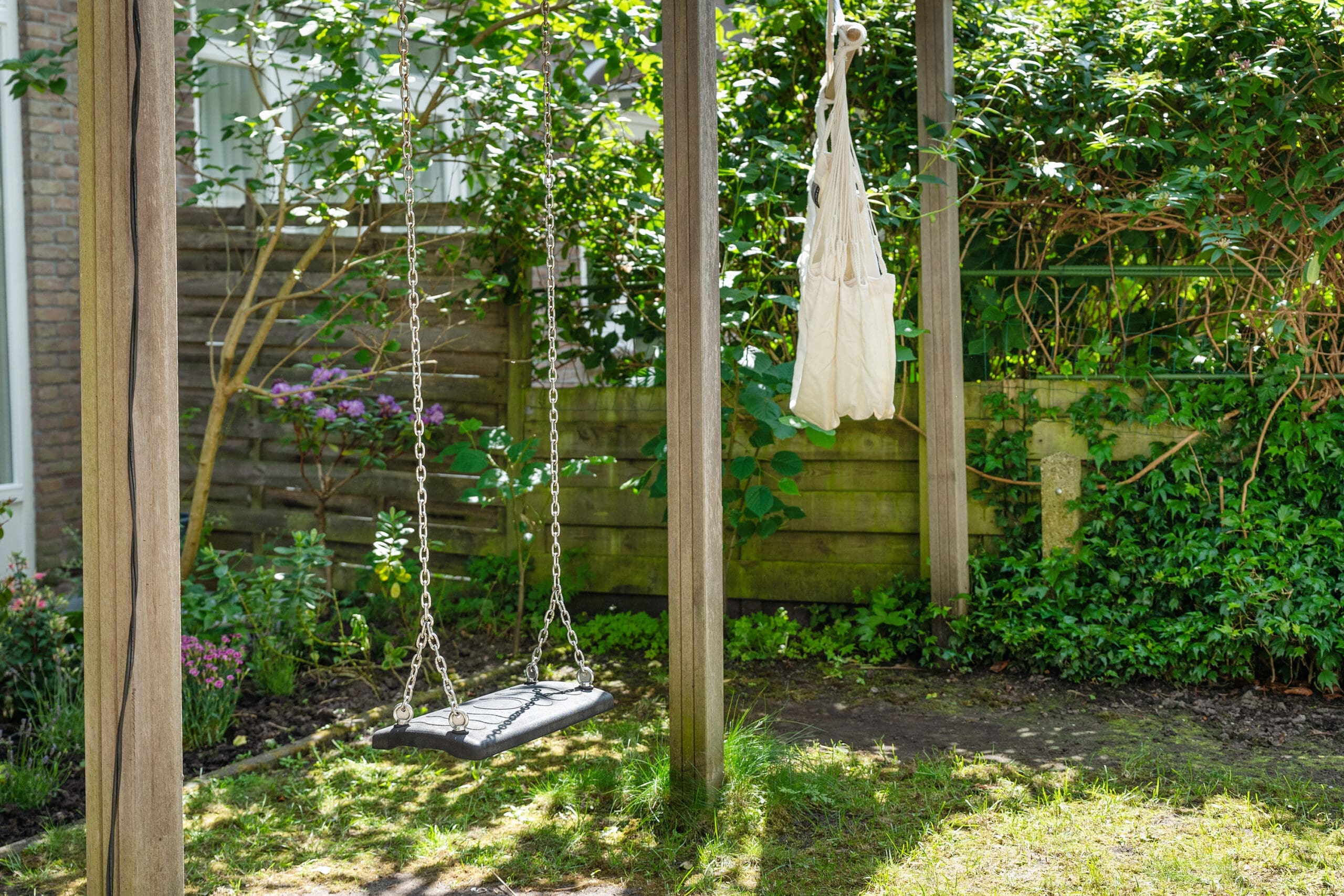 The garden has been professionally landscaped and includes a wooden pergola with two swings. From the terrace, you can enjoy the sun from mid-afternoon until the evening.