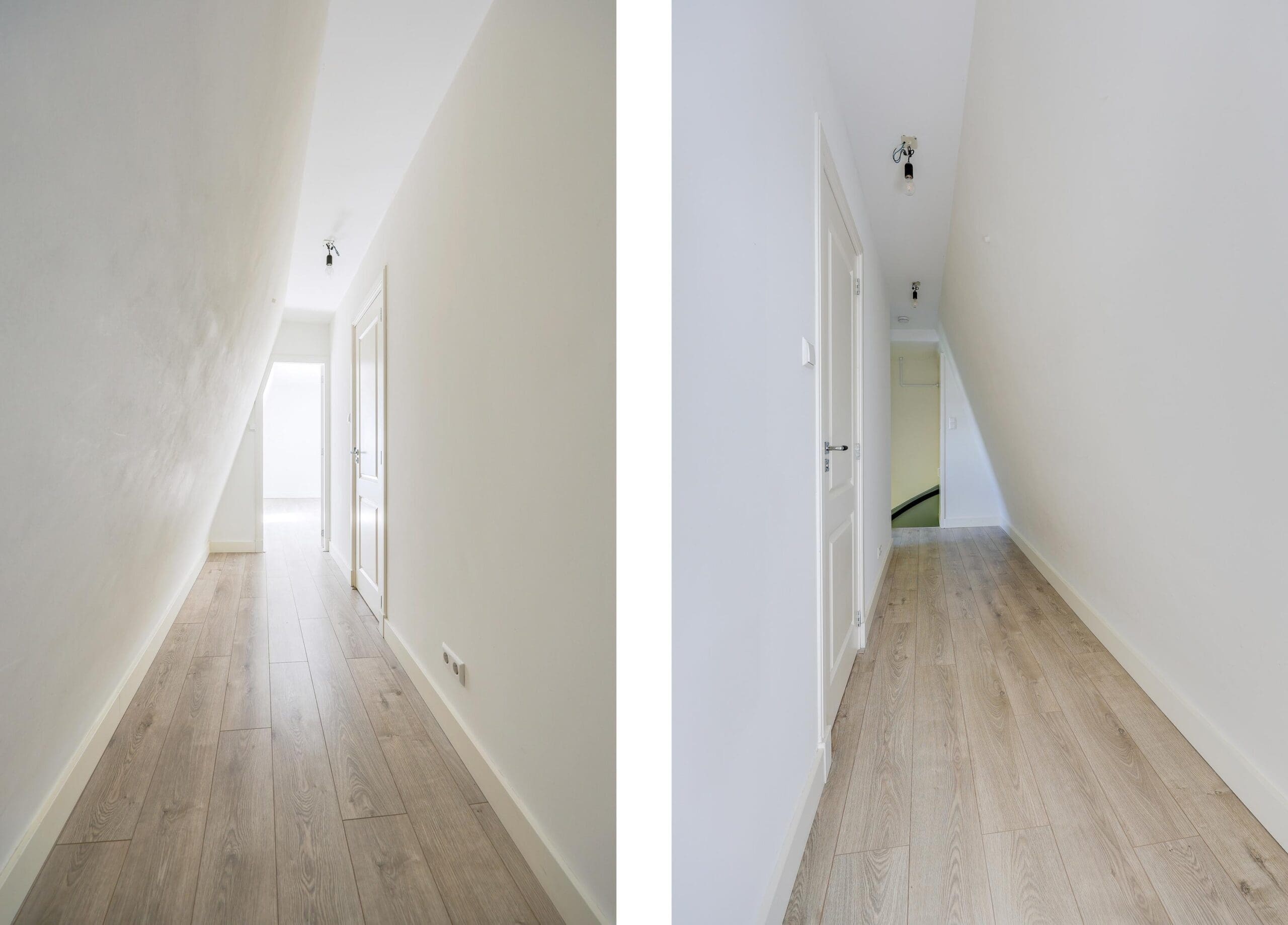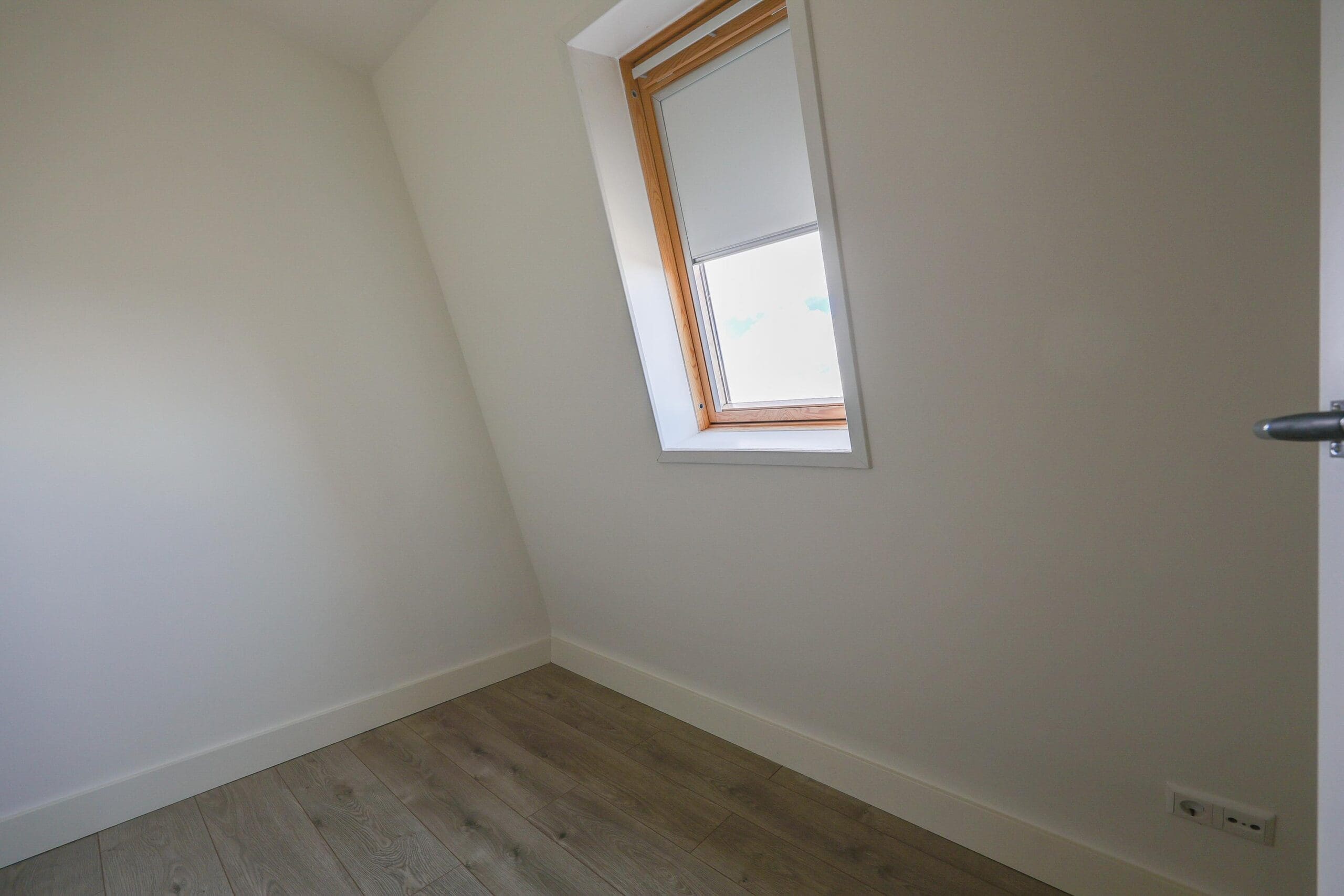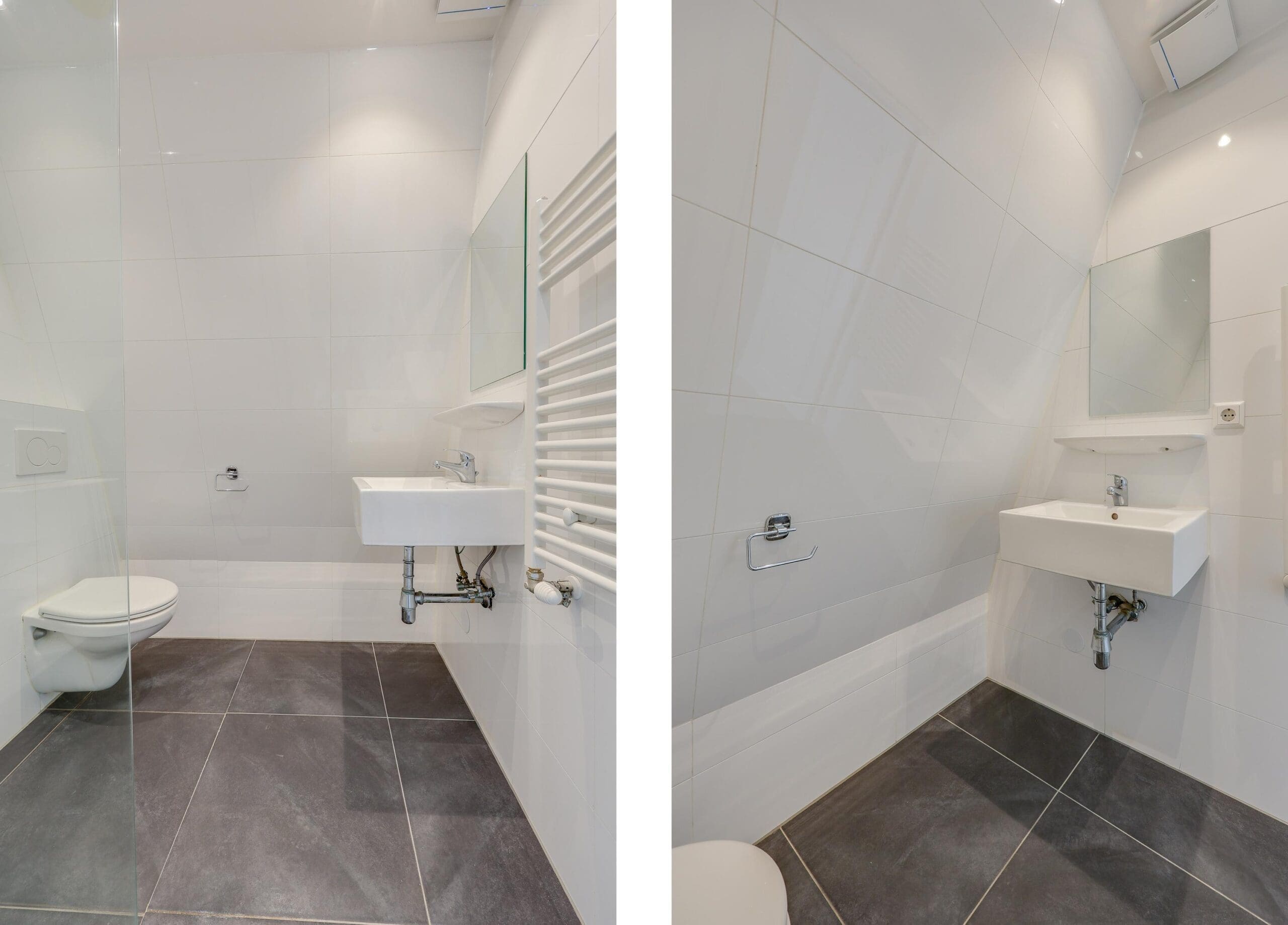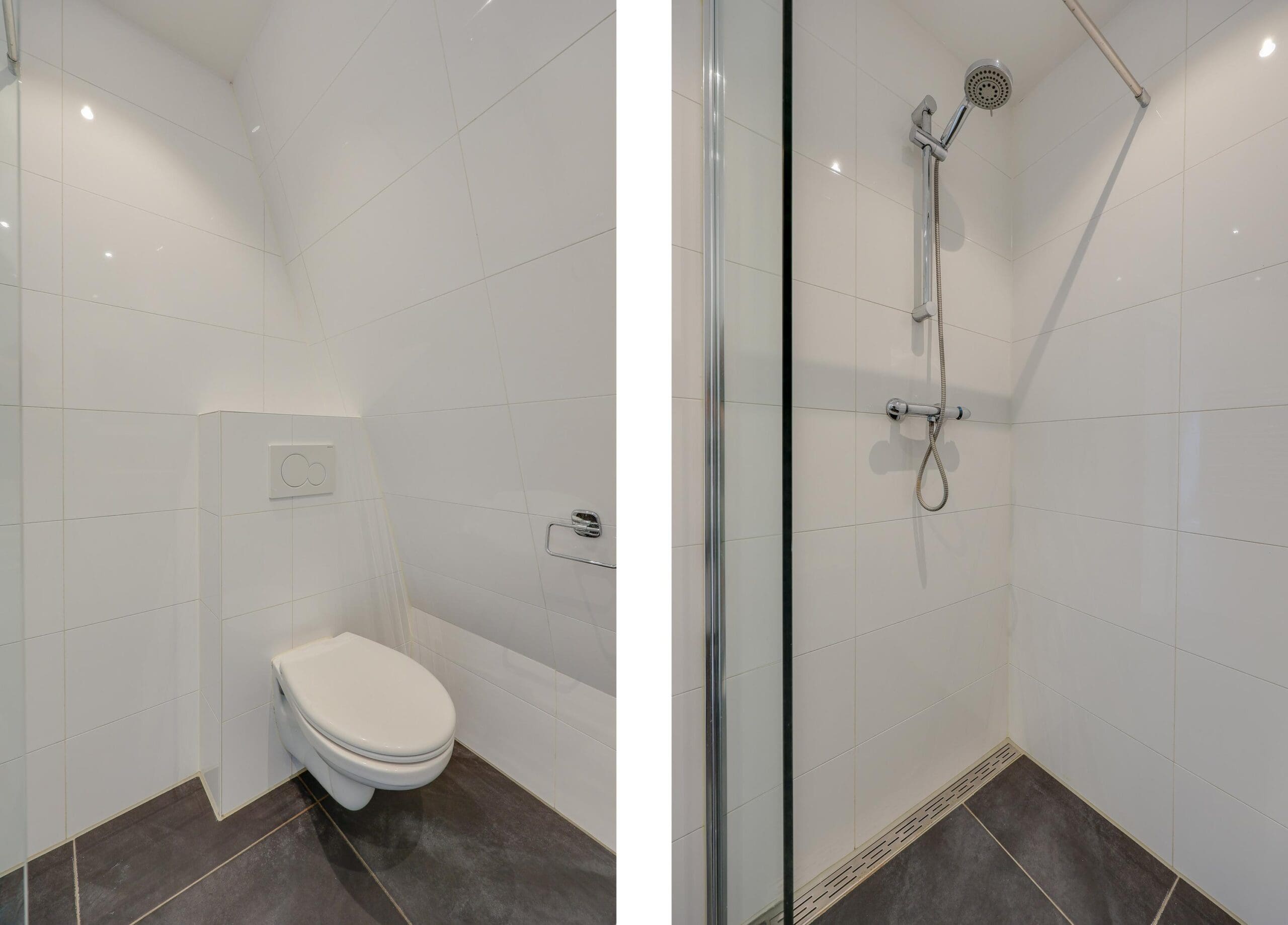 Two bedrooms of varying sizes and a modern bathroom. The smaller bedroom is located at the front and is also suitable as a home office or study. At the end of the hallway, you'll find the larger master bedroom, with a street-facing view and access to the sunny rooftop terrace at the rear. The bathroom is equipped with a walk-in shower, sink with mirror and shelf, a second toilet, and a designer radiator.